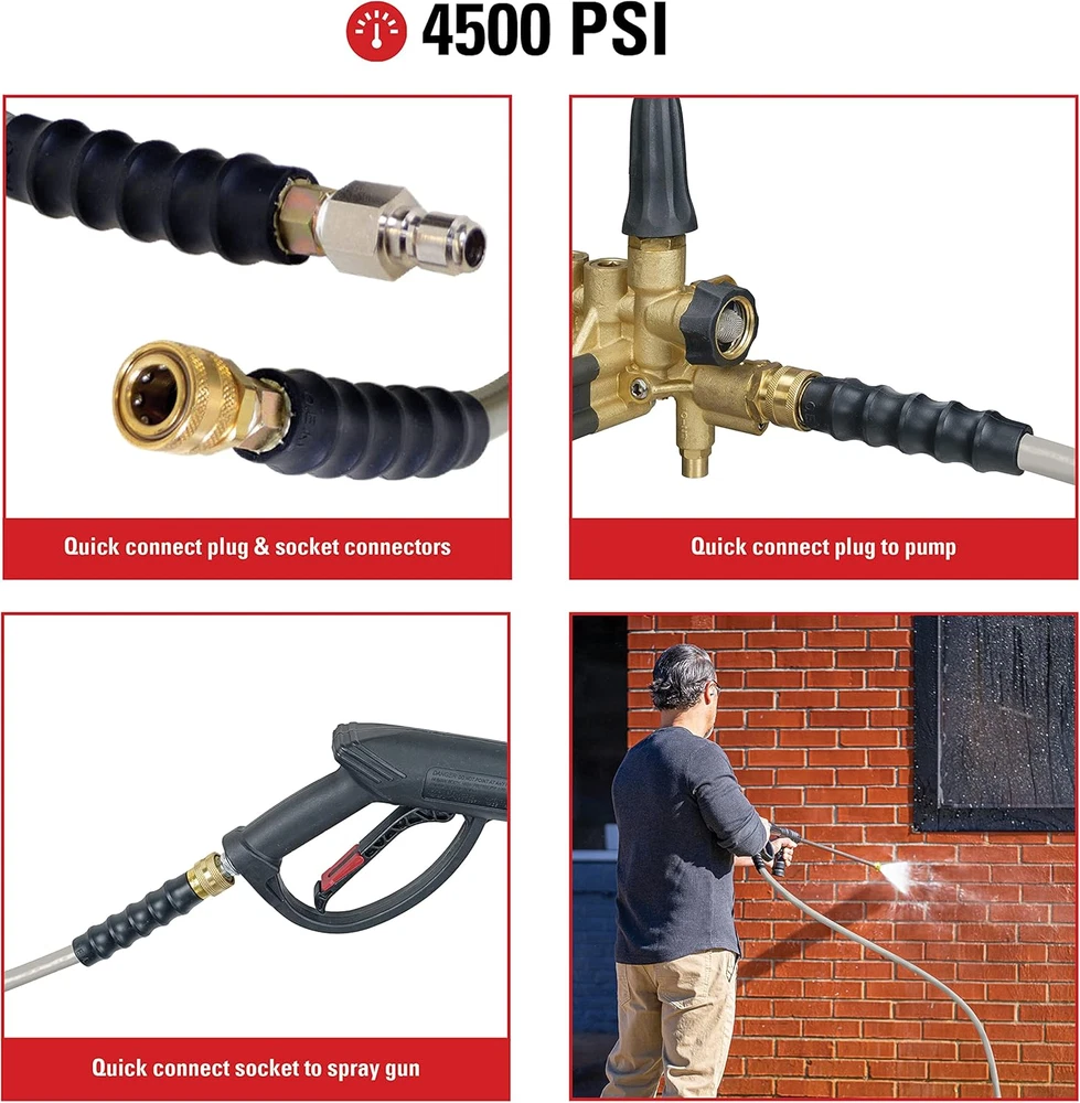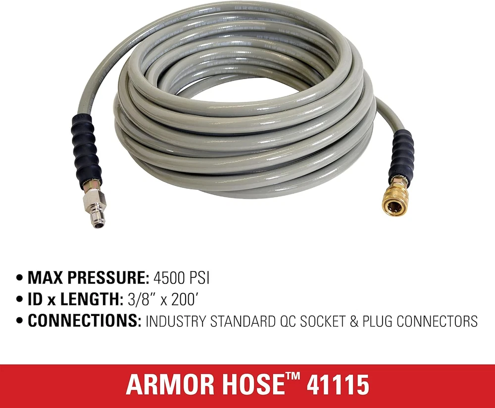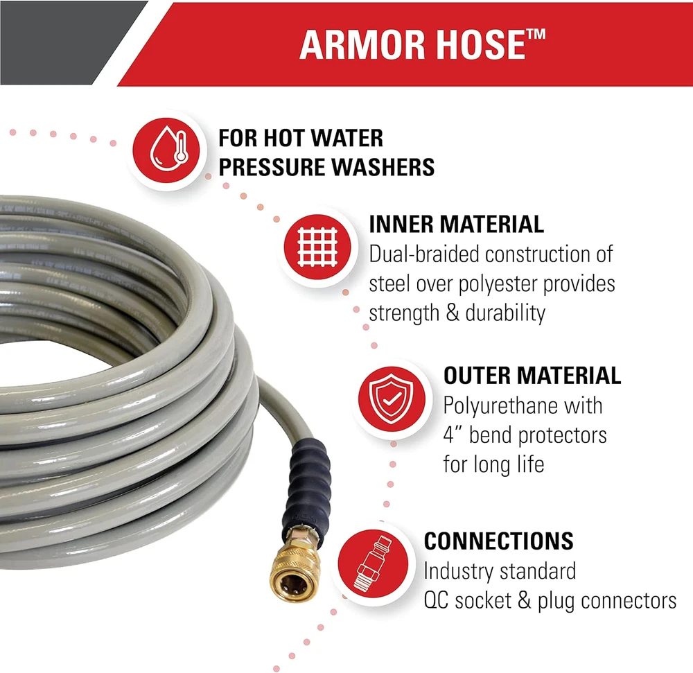 Hot and Cold Water Compatible: This hose can handle heated water or cold water; it is built for high temperatures up to 250 degrees Fahrenheit Easy Connections: 3/8" Male quick connect plug x 3/8" Female quick connect socket by 200’ rated up to 4500 PSI replacement/extension hose Quality Construction: Dual-braided construction of steel over polyester for hot and cold commercial pressure washers; Polyurethane outer jacket is non-marring and abrasion resistant Works with Most Pressure Washers: Designed to fit most gas pressure washers with 3/8” quick connect fittings Durability and Long Life: The 4-inch bend protectors help extend the life of the accessory Armor hot water hoses are designed for high temperature applications up to 250°F. Made with a dual-braided construction of steel over polyester and jacketed with polyurethane for high strength, durability and kink resistance. They are equipped with quick connect fittings for quick and easy setup 3/8” Male quick connect plug x 3/8” Female quick connect socket. Polyurethane outer jacket is non-marring and abrasion resistant. Our Armor hot water hoses are designed to fit most gas pressure washers with standard quick connections. 90 Day limited accessory