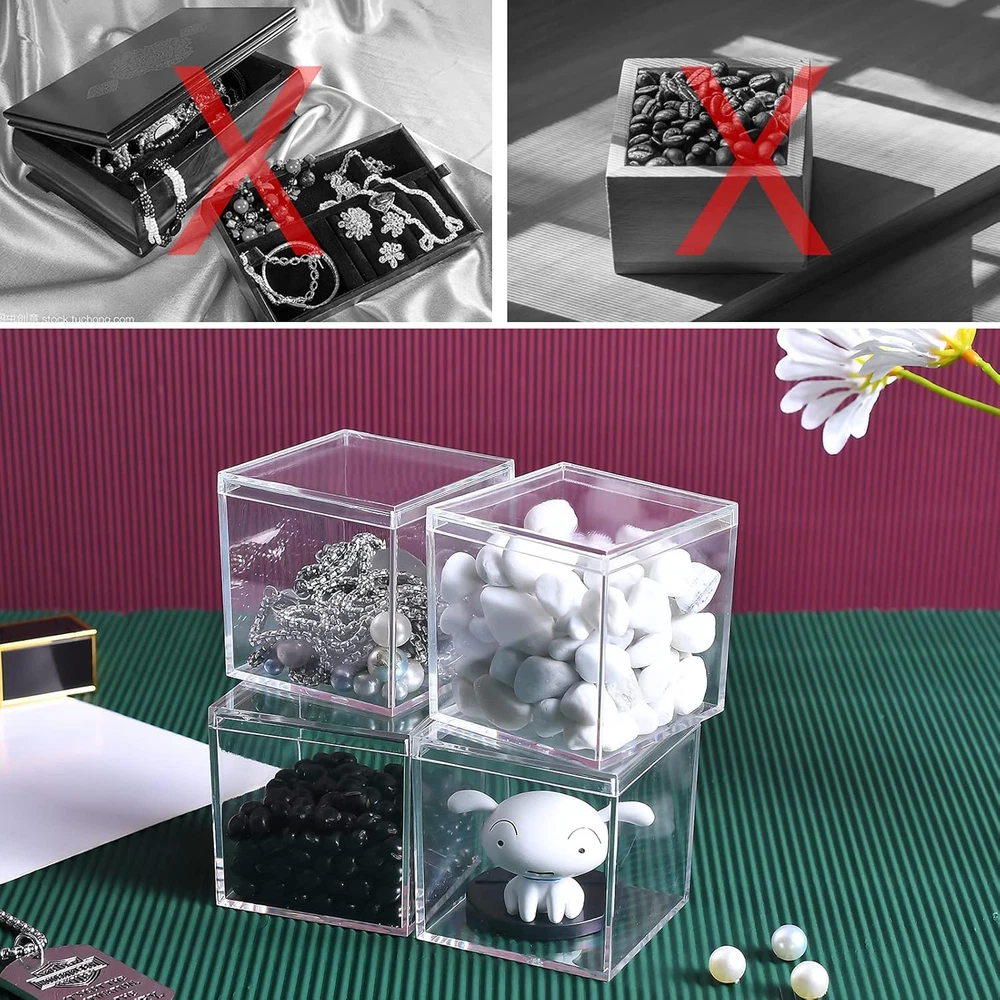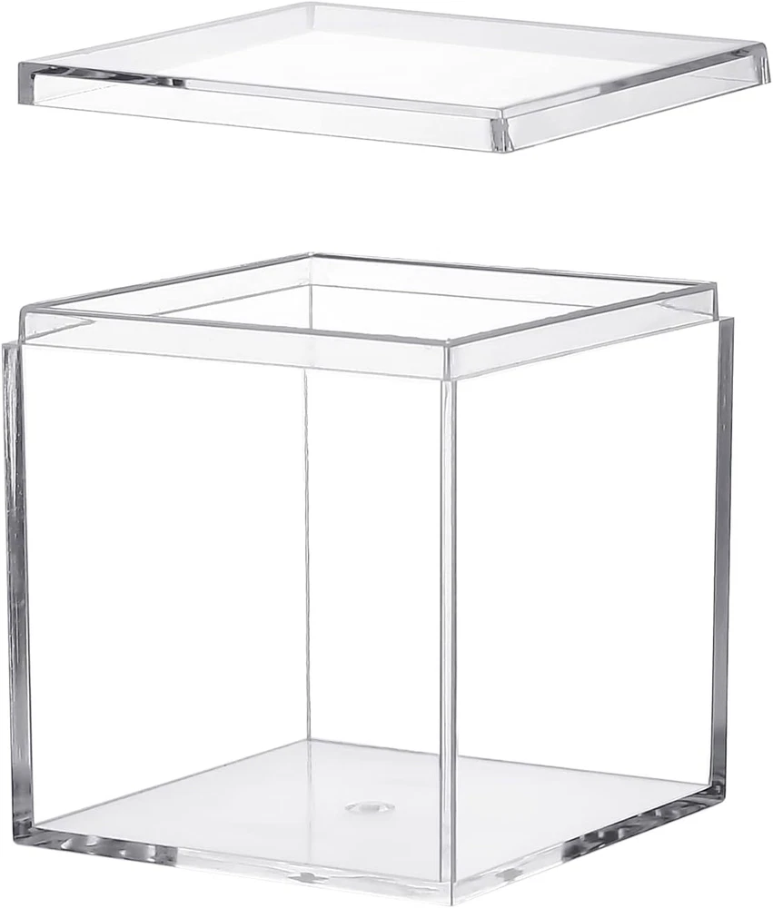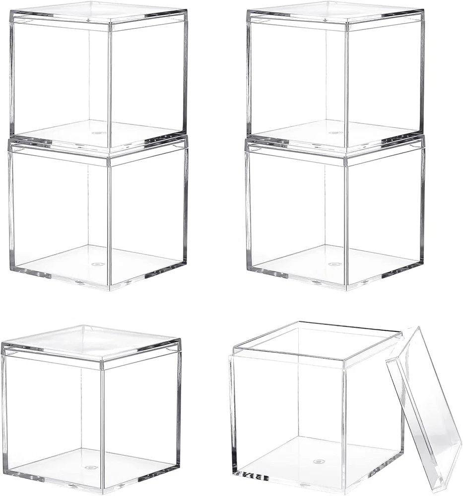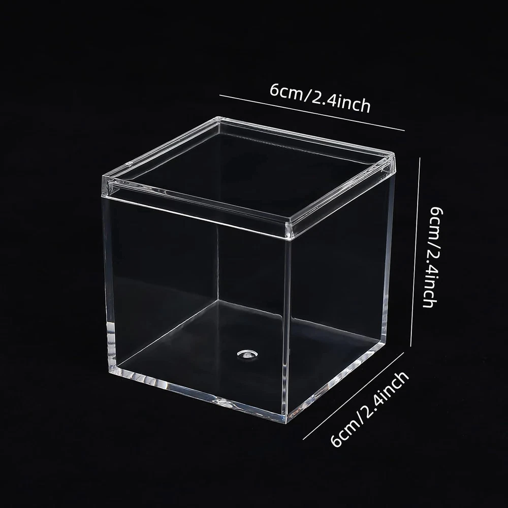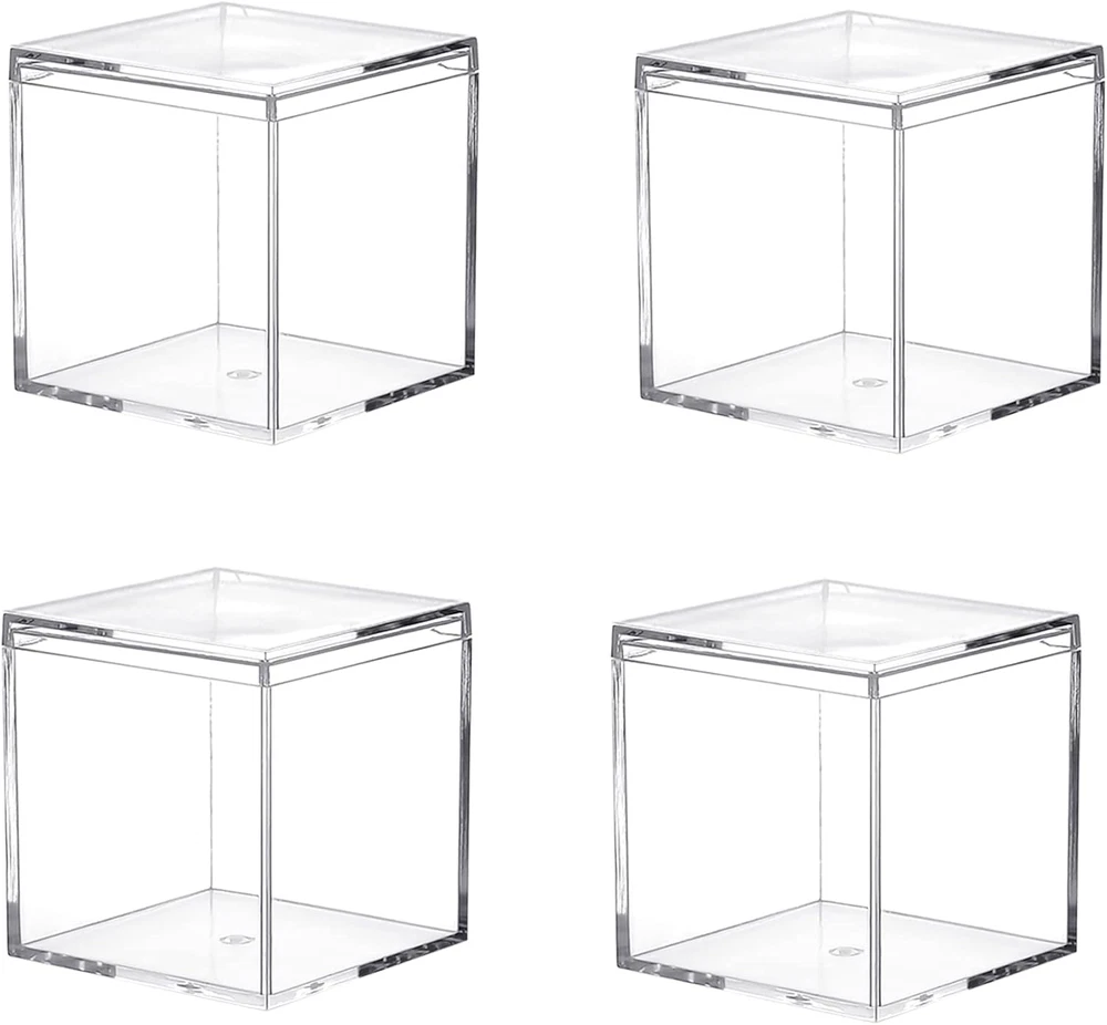 Durable and Strong: clear plastic boxes are made of non-brittle plastic ,which is durable and strong . 4 clear plastic boxes are easy to care and clean with soap and water. Perfect size and clear acrylic box with lid :size of box is 2.4x2.4x2.4 inches/60X60X60mm, small volume, do not take up too much space, easy to carry and decorate for home. Clear design, seeing the product in the box do not need to open the lid. Multi-purpose: Mini plastic boxes are perfect for wedding function, treats, gifts and so on. What is more , It is a good choice using these pack of 4 clear plastic boxes to storage collectibles, jewelry, candy, arts, crafts ,makeup ,nail supplies , horizontally for cars ,vertically for dolls or action figures and so on Easy to use: each containers with a lids to keep items separate and organized. You can see the inner box from outside of fully transparent storage box High quality: corner and edge of plastic square cube containers is smooth and good sealing, easy to open and close. Perfect for protecting your collectibles, minerals, statues, dolls, figurines. It is also can be used as a jewelry box, Candy box ,party favors or display box and so on Are you finding plastic square cube containers with Lid for home and small objects messy on the table? These small boxes to organize are just good for what you are looking for. Small plastic box can be used for organizing objects, such as earrings, beads, etc., and also can be used as jewelry box, Candy box ,party favors or display box and so on Size: 2.4x2.4x2.4 inches/60X60X60mm Features of plastic square cube containers small in size and good for organizing items in drawer Light weight, easy to carry Transparent box, you can easily see the inner box from outside Multi-purpose :These storage boxes can be used in room, bathroom , kitchen ,to store toys, dolls, puzzles and kitchen. Package include: 4 Pcs 2.4x2.4x2.4 inch Clear Acrylic Plastic Box