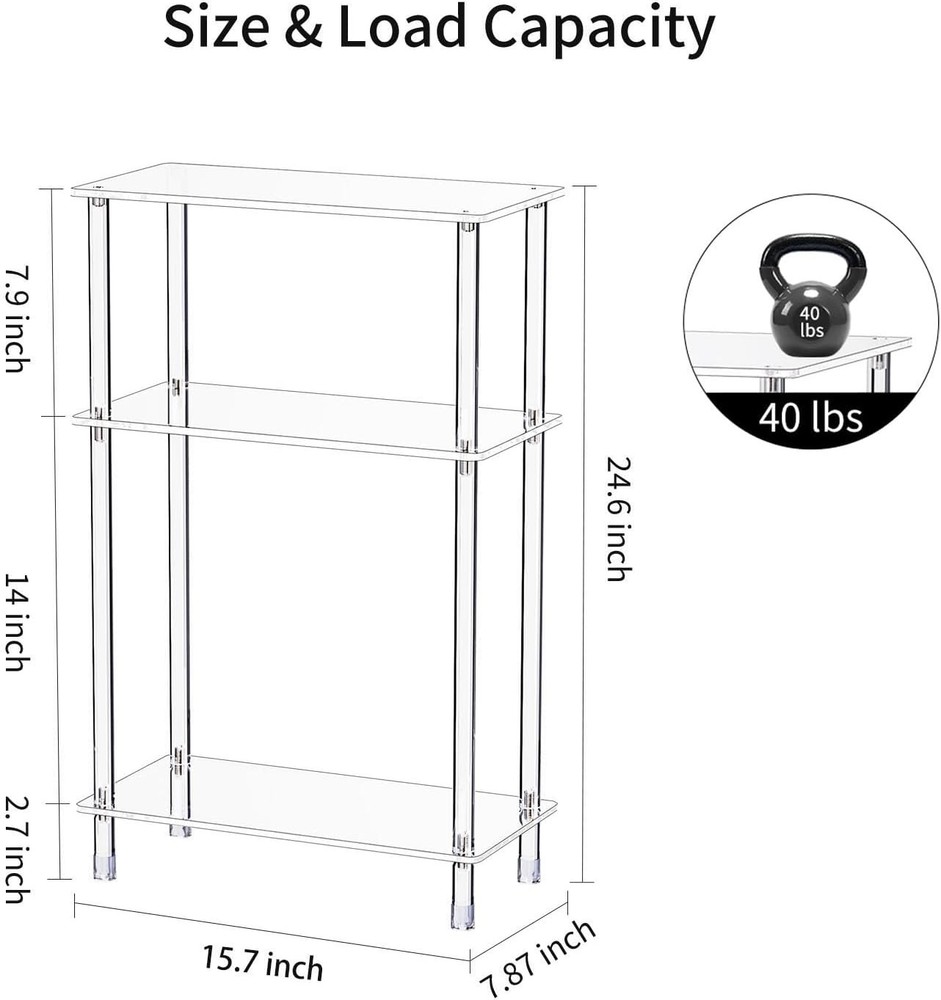 Clear Acrylic Narrow Side Table for Small Spaces, 15.7" 3 Tier 1 Pack, Product Details Brand: Bkemiy Product Dimensions: 15.7"D x 7.87"W x 24.6"H Color: Clear Product Care Instructions: Wipe with Dry Cloth Table design: End Table Item WeightFrame Material: 5.1 PoundsAcrylic Top Material TypeShape: AcrylicRectangular 【Narrow Acrylic Side Table 3 Tier】The clear rectangle narrow end table is made of acrylic material which is smooth, transparent, high-strength, durable, lightweight, and easy to clean. The slim nightstand table can hold up to 40 lbs. 【Large Capacity for Small Space】The acrylic narrow bed side table size measures 15.7" L x 7.87" W x 24.6" H. The 3 ties frame design for the bedside table enhances storage capacity without taking up a lot of floor space. 【Minimalist Modern Style】This stylish clear acrylic narrow night stand can effortlessly blend in with your home decor. The round edges of the small narrow nightstand table are structured smoothly for your safety use. There are 4 anti-slip silicone leg caps in the bottom to avoid to damage your floor. 【Easy to Assemble】You can assemble the 3 tier clear acrylic narrow side table in a short time. You just need to follow the drawing instructions to install. 【Multifunctional Narrow Acrylic Table】This 3 tier modern small acrylic narrow table can be used as a small sofa or bed side table, night stand, coffee table, accent table or as a home decoration end table. You can put it in the living room, bedroom, bathroom, garden, kitchen, office and any place you like.