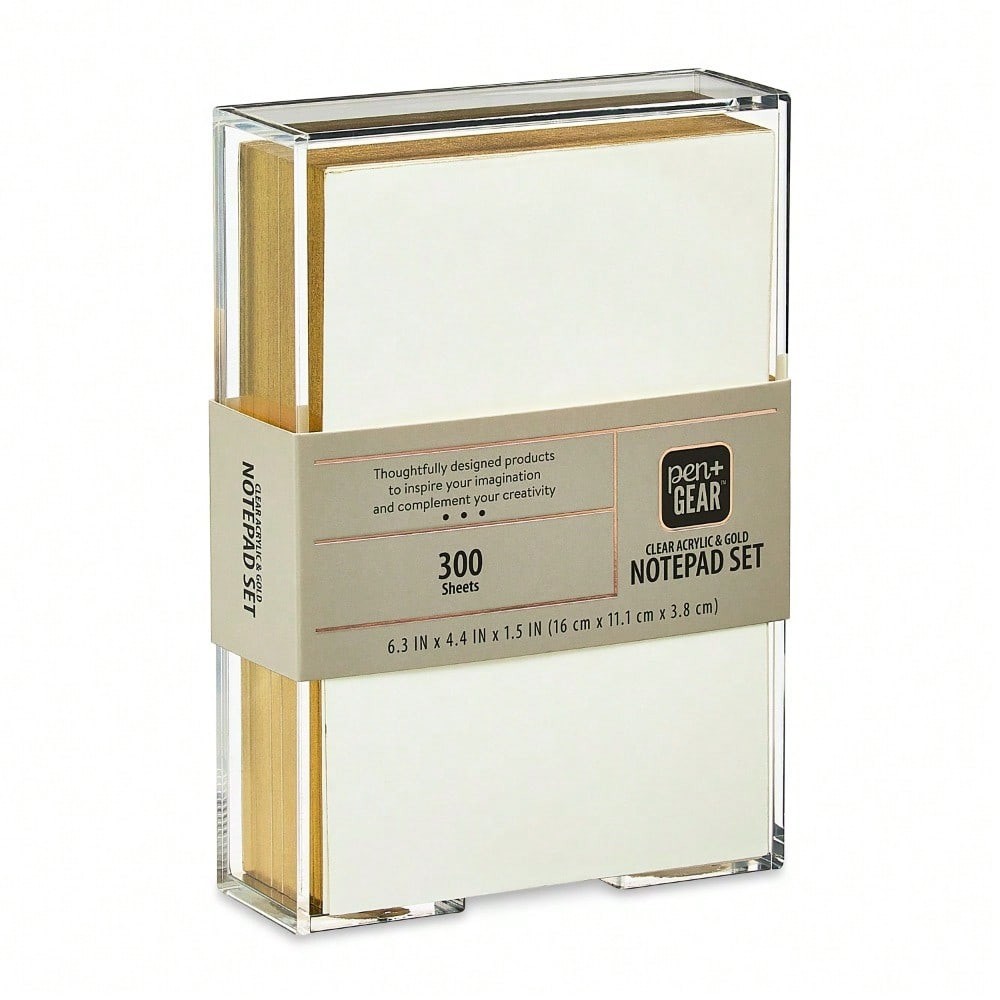 Enhance your workspace with the Pen+Gear Acrylic Notepad Set. Measuring 6.3 by 4.4 by 1.5 inches, this compact and stylish note holder is ideal for keeping your notes, memos, and reminders organized. Made from high-quality acrylic, it has a sleek, clear design that blends seamlessly with any decor, while allowing easy visibility of your notes. Its sturdy construction ensures that it remains a reliable and elegant addition to your desk or workspace. With 300 sheets, this pad has plenty for lists, notes, and reminders. The gilded edges add elegance and sophistication. Don’t forget to check out other Pen+Gear products—letter trays, desk organizers, desk caddies, and much more for all your organizing needs. The Pen+Gear Acrylic Notepad Set is the perfect blend of style and function. Pen+Gear Acrylic Notepad Set, 6.3" x 4.4" x 1.5", Clear and Gold, 300 Sheets Includes 300 memo sheets Ideal for keeping notes within reach without occupying much space Transparent acrylic provides a modern, minimalist look that complements any decor while keeping notes visible Made from high-quality acrylic, this note holder is durable for daily use Dimensions: 6.3 x 4.4 x 1.5 inches