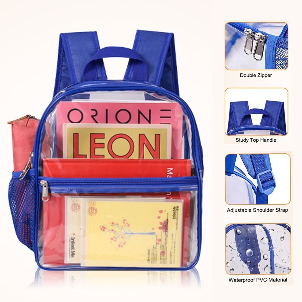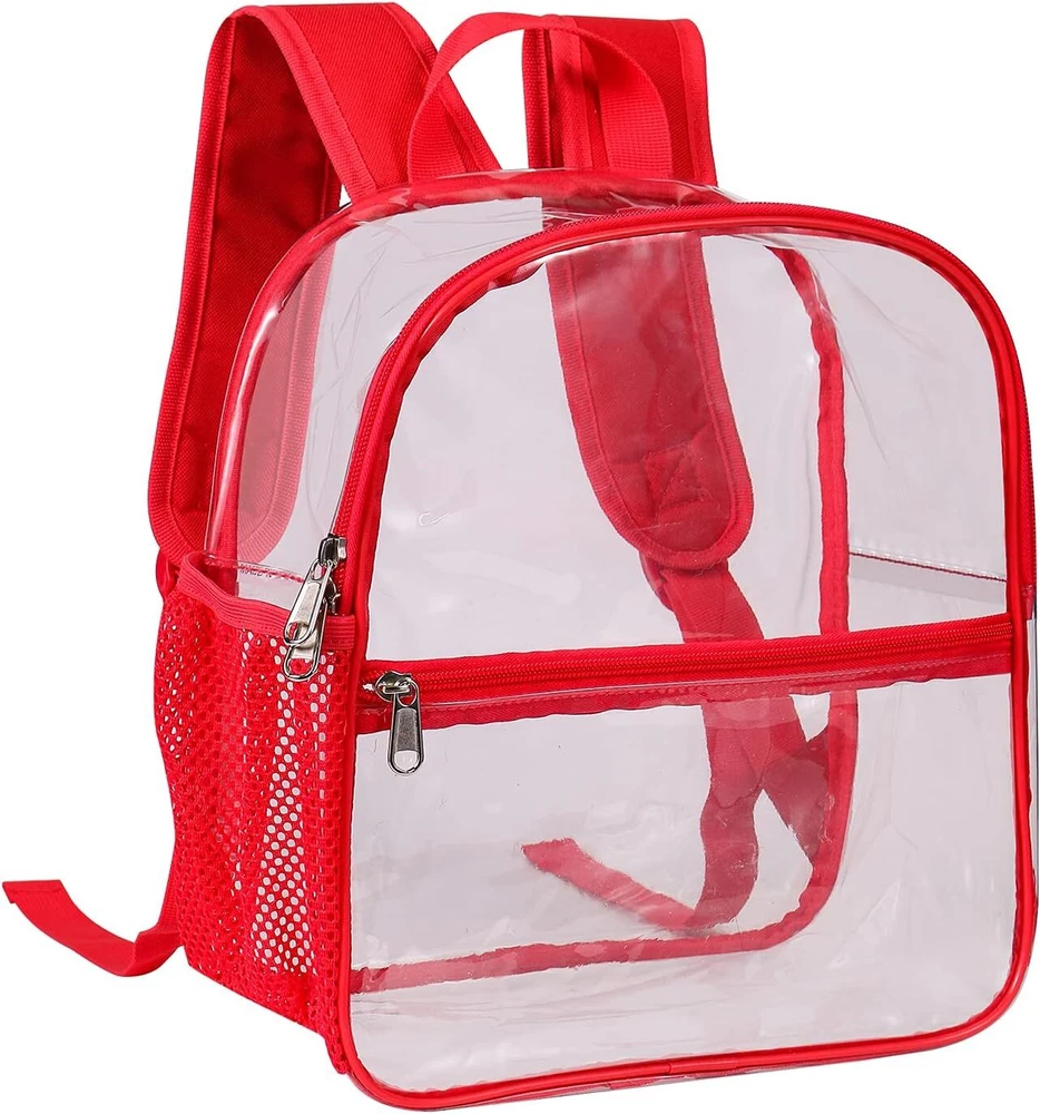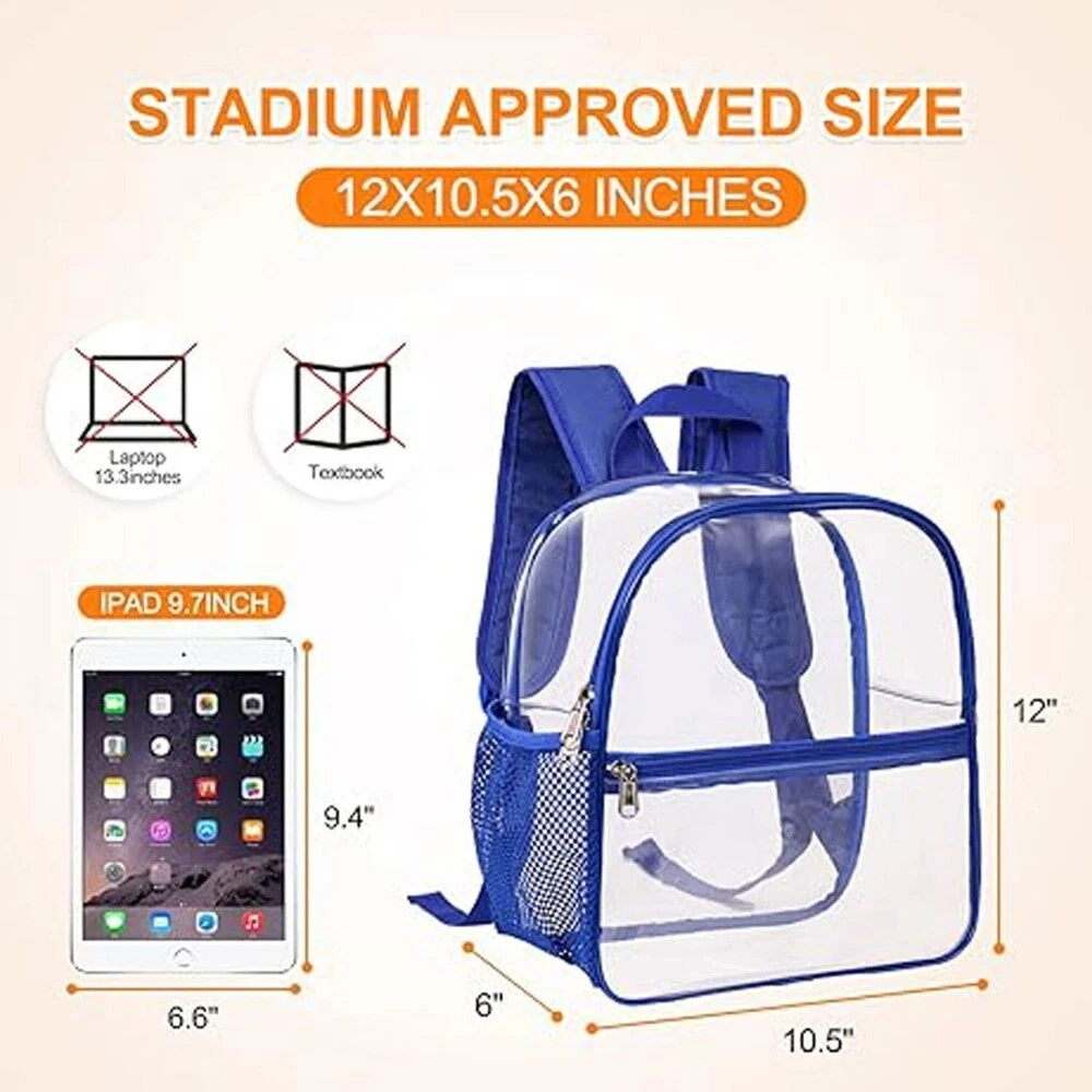 【Stadium Approved Size】The size for stadium events - 12" H x 11" L x 6" W, meets the clear bag policy of no larger than 12*12*6 inches, making it approved by stadiums,concerts, and sports events. 【Time-saving and Convenient】The clear backpack allows complete visibility all around.Pass through security with the see-through backpack to avoid being turned away at security checkpoints, and it's convenient to double-check that you have everything you need before leaving. 【Comfortable Design】The reinforced padded adjustable straps brings the soft-comfort for your all-day wear. The top handle is convenient whenever you want to carry your bag. The stylish design makes it a great accessory to fit your outfit and multi-color for you to choose. 【Durable Material】Made of heavy duty PVC material which is thick, waterproof, sturdy, and well-made, Our clear backpack can ensure long-lasting durability. NOTE: Do not immerse it in water or expose it to heavy rain to avoid water getting through the zipper. 【Multi-Purpose Use】The clear small backpack stadium approved perfectly meets the requirements of concerts, festivals, security checks, sporting events, school, work,airports, etc. The stylish design is suitable for girls and women. It is also a great gift for family and friends. Recommended Age:The item is suitable for pepole over 4 years old. Clear Backpack Stadium Approved Weight:0.58 LB Main Compartment Size: 12*11*6 inches Material:0.4MM PVC 1. Many stadiums and concert venues have implemented a clear bag policy to enhance security for both the audience and staff, and to expedite entry into venues and stadiums as well as colleges and workplaces. 2. The stadium-approved small clear backpack fits the size requirement for stadium bags, which are no more than 12x12x6 inches. If you have this with you, you can speed through the security line and avoid the time-consuming inspection process for your belongings. 3. Children and girls will find the stadium-approved clear backpack to be the perfect choice because it is lightweight and has padded shoulder straps that make carrying it comfortable. NOTE: Before purchasing, please be sure to review the clear bag policy on the local stadium's official website for your event to avoid entry refusal and ensure a smooth visit to the game.And this small clear backpack doesn't fit computers or large textbooks. Safety Warning CHOKING HAZARD -- Contains small parts, not suitable for children under 3 years old.