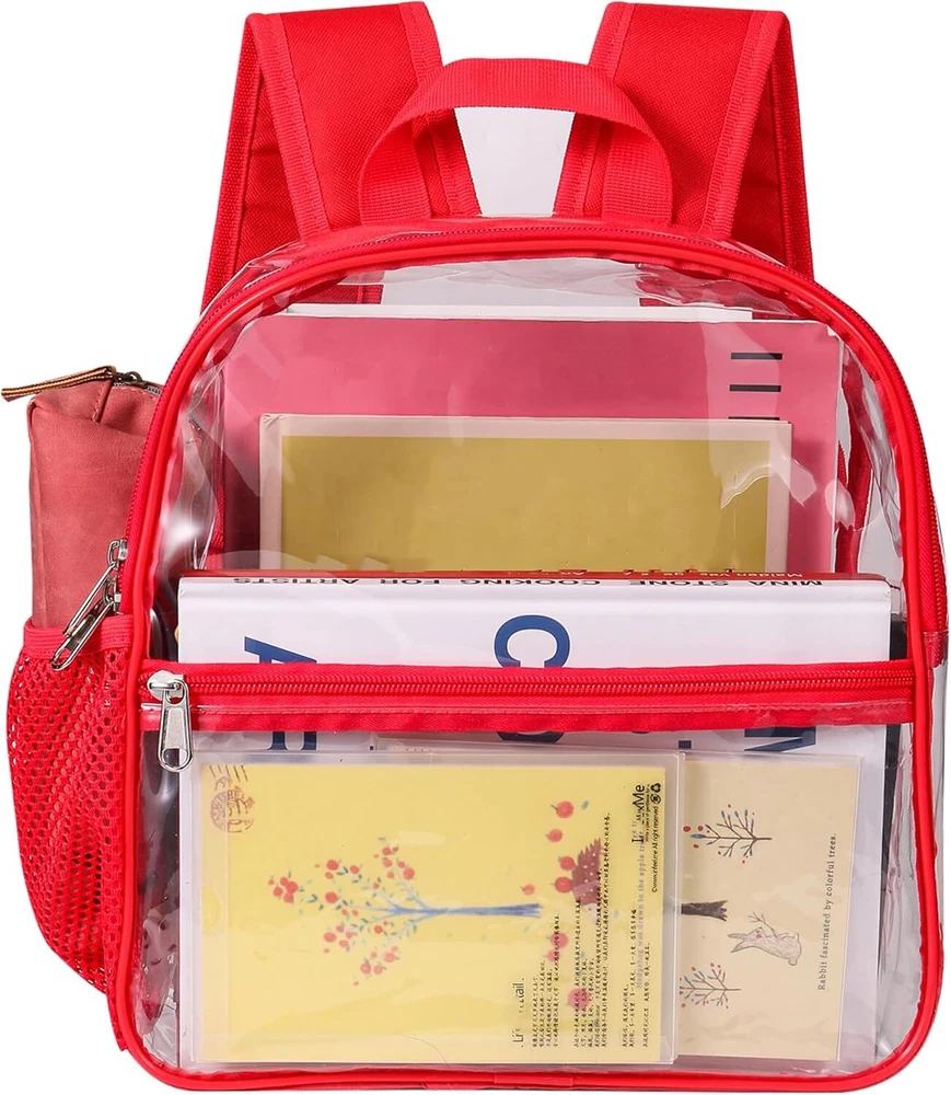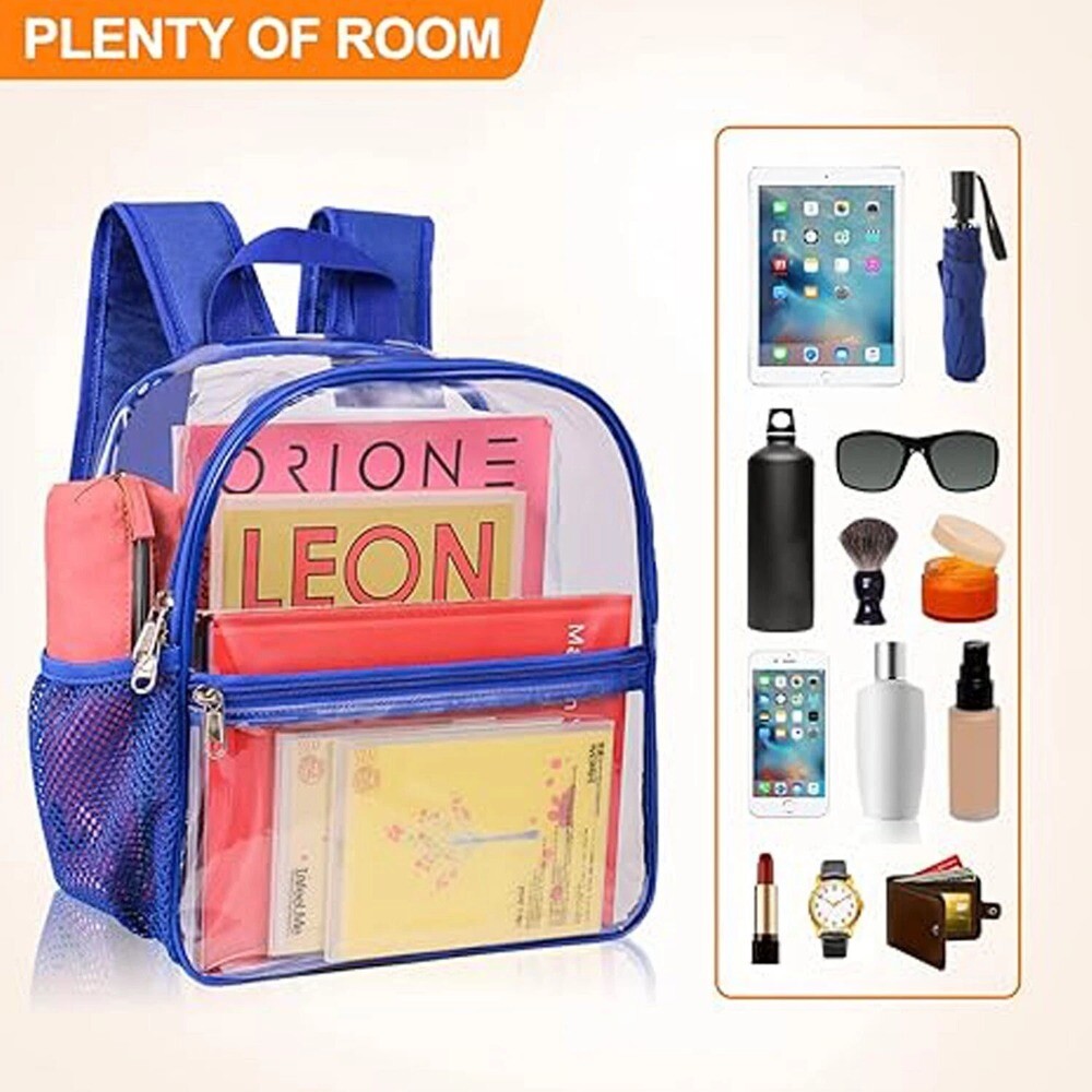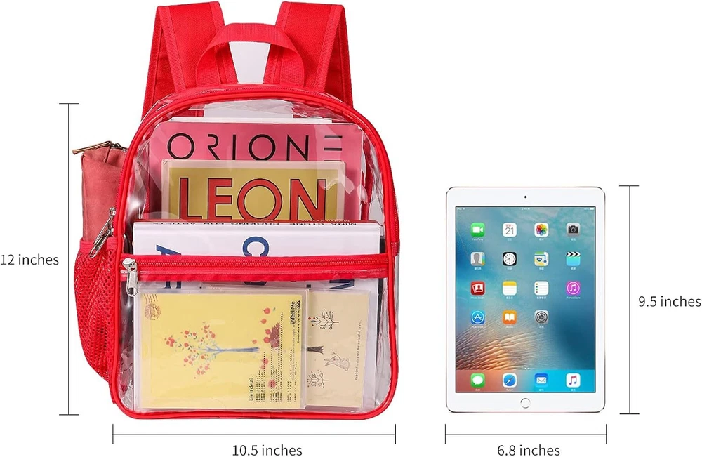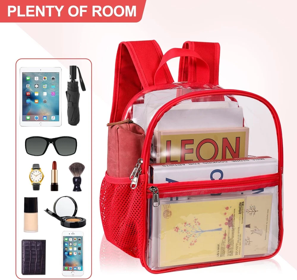 【Stadium Approved Size】The size for stadium events - 12" H x 11" L x 6" W, meets the clear bag policy of no larger than 12*12*6 inches, making it approved by stadiums,concerts, and sports events. 【Time-saving and Convenient】The clear backpack allows complete visibility all around.Pass through security with the see-through backpack to avoid being turned away at security checkpoints, and it's convenient to double-check that you have everything you need before leaving. 【Comfortable Design】The reinforced padded adjustable straps brings the soft-comfort for your all-day wear. The top handle is convenient whenever you want to carry your bag. The stylish design makes it a great accessory to fit your outfit and multi-color for you to choose. 【Durable Material】Made of heavy duty PVC material which is thick, waterproof, sturdy, and well-made, Our clear backpack can ensure long-lasting durability. NOTE: Do not immerse it in water or expose it to heavy rain to avoid water getting through the zipper. 【Multi-Purpose Use】The clear small backpack stadium approved perfectly meets the requirements of concerts, festivals, security checks, sporting events, school, work,airports, etc. The stylish design is suitable for girls and women. It is also a great gift for family and friends. Recommended Age:The item is suitable for pepole over 4 years old. Clear Backpack Stadium Approved Weight:0.58 LB Main Compartment Size: 12*11*6 inches Material:0.4MM PVC 1. Many stadiums and concert venues have implemented a clear bag policy to enhance security for both the audience and staff, and to expedite entry into venues and stadiums as well as colleges and workplaces. 2. The stadium-approved small clear backpack fits the size requirement for stadium bags, which are no more than 12x12x6 inches. If you have this with you, you can speed through the security line and avoid the time-consuming inspection process for your belongings. 3. Children and girls will find the stadium-approved clear backpack to be the perfect choice because it is lightweight and has padded shoulder straps that make carrying it comfortable. NOTE: Before purchasing, please be sure to review the clear bag policy on the local stadium's official website for your event to avoid entry refusal and ensure a smooth visit to the game.And this small clear backpack doesn't fit computers or large textbooks. Safety Warning CHOKING HAZARD -- Contains small parts, not suitable for children under 3 years old.