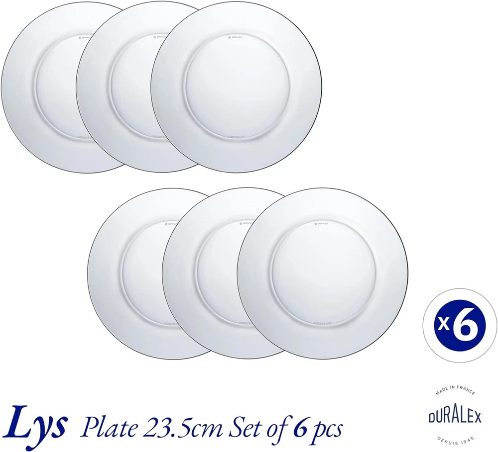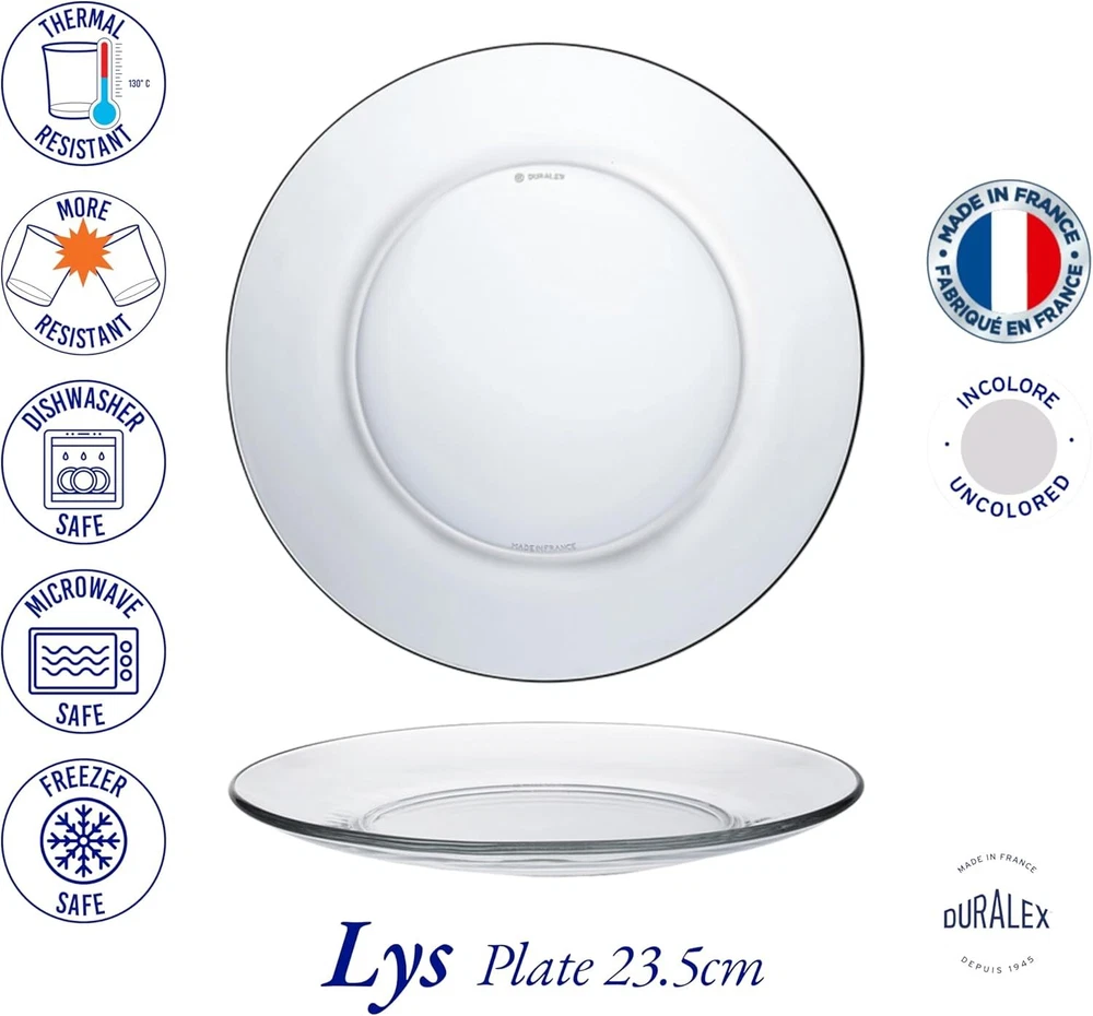Menu Other Items Feedbacks About Us Contact Us Add To Favorites Clear Dinner Plate 23,5 Cm (9 1-4 In) Set of 6 Quality from Duralex Package: 6 plates , Diameter - 9.25 inches Material: glass, dishwasher safe Founded in 1929, Duralex has been manufacturing glassware and tabletop products in la chapelle-saint-mesmin, a city in the heart of France. Since 1939, when Duralex invented the glass tempering process, the name Duralex has been associated with resilient glassware, thanks to their proprietary tempering process. The original tempered (toughened) glasses are still in production in France and are known as the “original french tumblers.” The glassware is the perfect weight: functional yet stylish and feels extremely comfortable in the hand. They are equally suitable for cold or hot, conveniently stackable, impact and chip resistant, microwave and dishwasher safe. With the help of continuous investments and commitment to quality, Duralex has reached a level of excellence that makes its products recognized throughout the world. Duralex is and will always remain a true french manufacturer of glassware and tabletop products, and is the only glass manufacturer that makes 100-percent of their products in France. Item Specification Item model number 3006AF06D1111 Style Classic Pattern Solid Number of Pieces 6 Unit Count 6.0 Count Material Glass Package Type Custom Seasons All Seasons Is Microwaveable Yes Is Discontinued By Manufacturer No Is Dishwasher Safe Yes Item Weight 15.1 ounces Occasion All Occasion Special Feature Microwave Safe, Chip Resistant Color Clear Global Trade Identification Number 03550190401608, 23550190050091 Shape Round Recommended Uses For Product Cheese Product Dimensions 9.25"L x 9.25"W x 0.79"Th Size Large Dimensions Shipping Returns Additional Info Product Dimensions: 9.25 "th x 9.25 "th x 0.79 "th. Weight: 15.1 oz Fast shipping is very important for us. Our standard shipping service is FREE. Your order will be shipped within 1-3 business days upon full payment received. Most items are delivered within 3-5 business days, however, please allow 3-10 business days. We are shipping only to USA. We only ship to the confirmed Paypal address. We reserve the right to cancel any order for any reason at any time. We are not responsible for undeliverable addresses. We offer a 30 day return policy from checkout winning date. Your satisfaction is guaranteed! If for any reason you are unhappy with your item, just return it within 30 days for a full refund, minus shipping cost. Please contact us prior to initiating a return so that we can issue you a refund authorization. Items defective upon receipt must be packaged in their retail packaging as if new and returned with a detailed description of the problem. Return shipping fees are not refundable. We reserve the right to decline any returns if the above guidelines are not followed. All of our items, unless otherwise stated, will only run on 120 volts. Please check to make sure your country complies with these specifications. If you have a problem or question regarding your transaction please contact us before leaving any type of feedback. We will work with you to resolve any problem you may have.