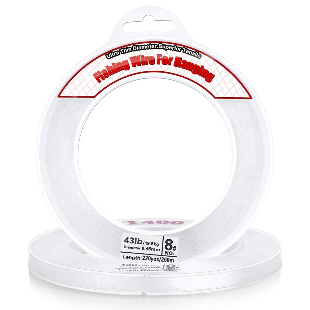 The fishing wire for hanging made of premium nylon material, flexible and durable, with supports up to 40 pounds, perfect for hanging balloons, garlands, party decorations, hang ornaments and more. Fishing Line Material: Nylon Color: Clear Diameter: approx. 0.45 mm Length: 220Yds/200M Test: 43lb/19.5kg Package Includes: 1 x Roll of Clear Fishing Line Fishing Wire Value Pack – Comes with 1 roll of 0.45mm 220yds/200m fishing line clear, long enough for party supplies to decoration and hanging ornaments Strong and Durable Material – The fishing wire for hanging made of premium nylon material, flexible and durable, with supports up to 40 pounds, sturdy to hang variety decorations and not easy to break Clear Hanging Wire – This fishing wire for balloons is thin and transparent, invisible in direct light or against a white background. Perfect for hanging balloons, garlands, party decorations, hang ornaments and more Convenient to Store - Clear fishing string is winding in the plastic roller to keep the clear twine neat and ready to use when you remove the cover Wide Application – This thin fishing line is suitable for various craft projects, beading, sewing, quilting, jewelry making and outdoor or indoor hanging decorations
