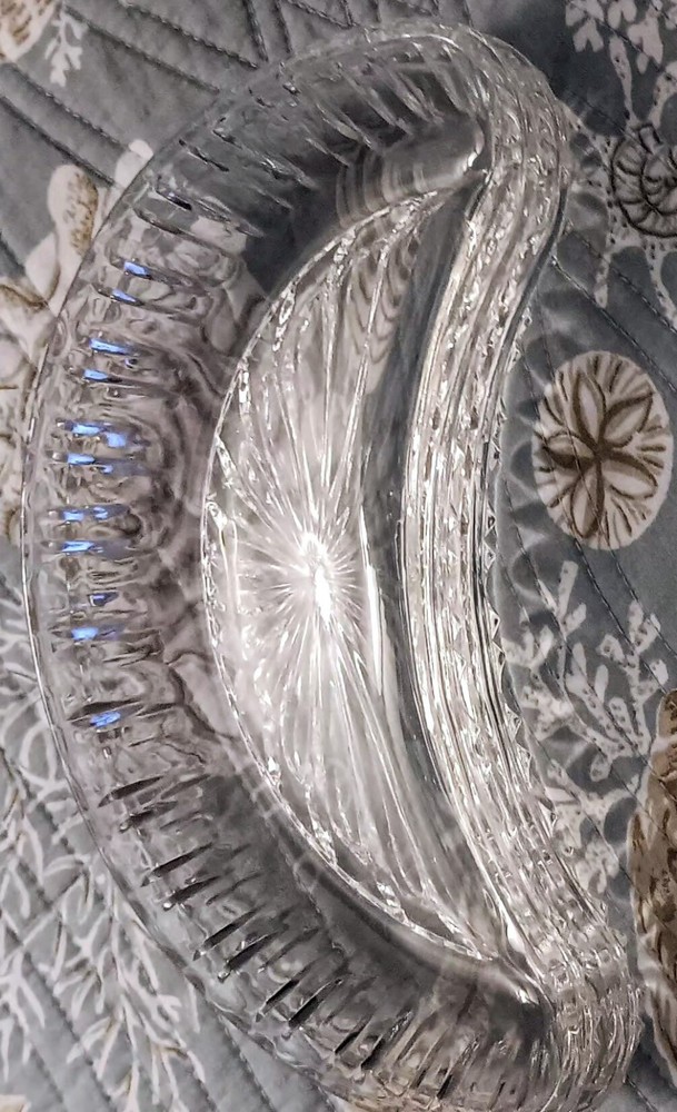 This Clear Fruit Glass Half Moon Curved Condiment Relish Nuts Side Dish Glass Set 2 features a unique and stylish design, perfect for serving condiments or snacks in a decorative manner. Made of glass with a clear color and a fruit pattern, this condiment dish has a single compartment and a curved half moon shape. The set includes 1 piece and is part of the Indian product line, manufactured in China in the 2000-2009 time period using fused glass production technique. This original vintage piece adds a touch of elegance to any table setting.