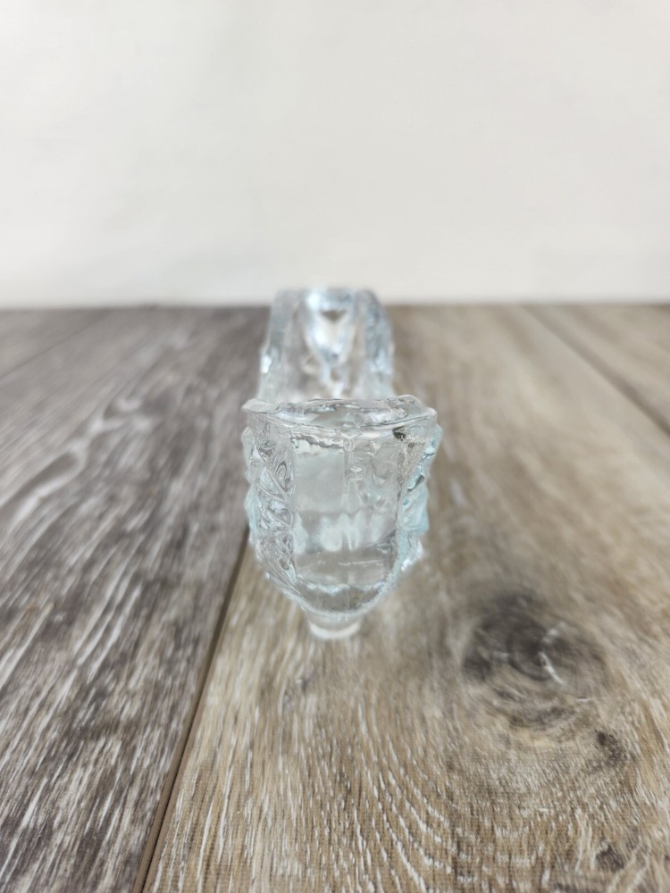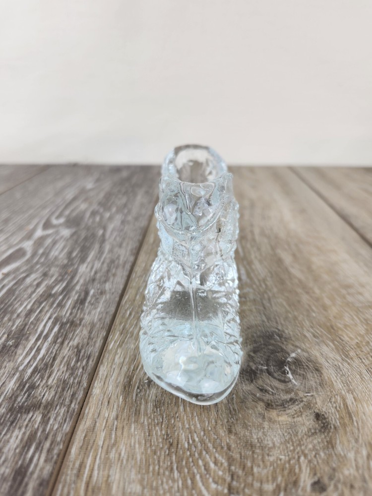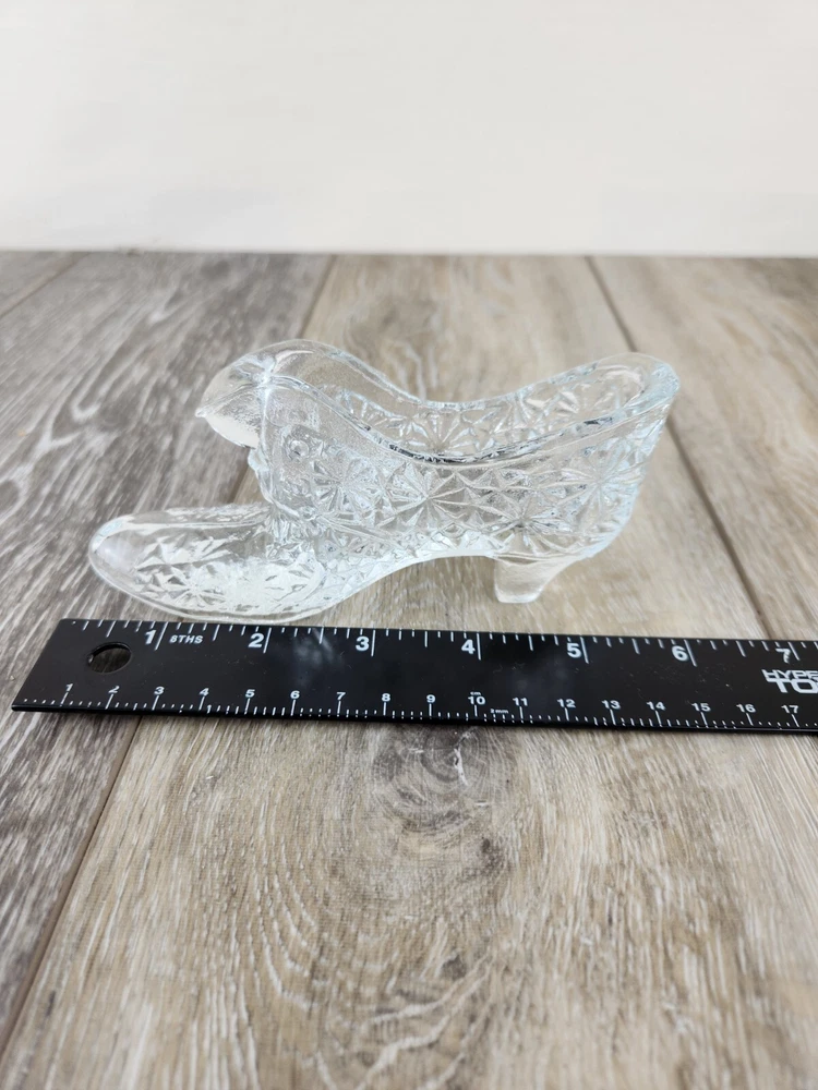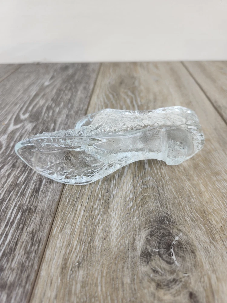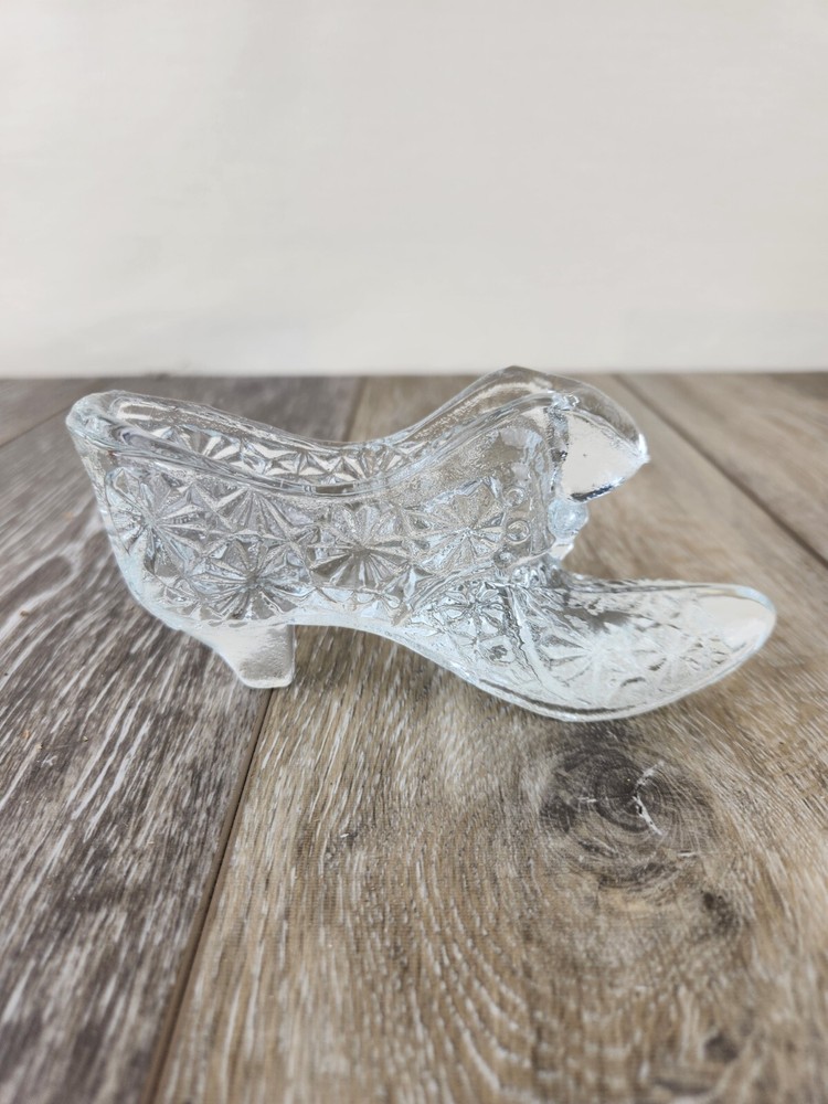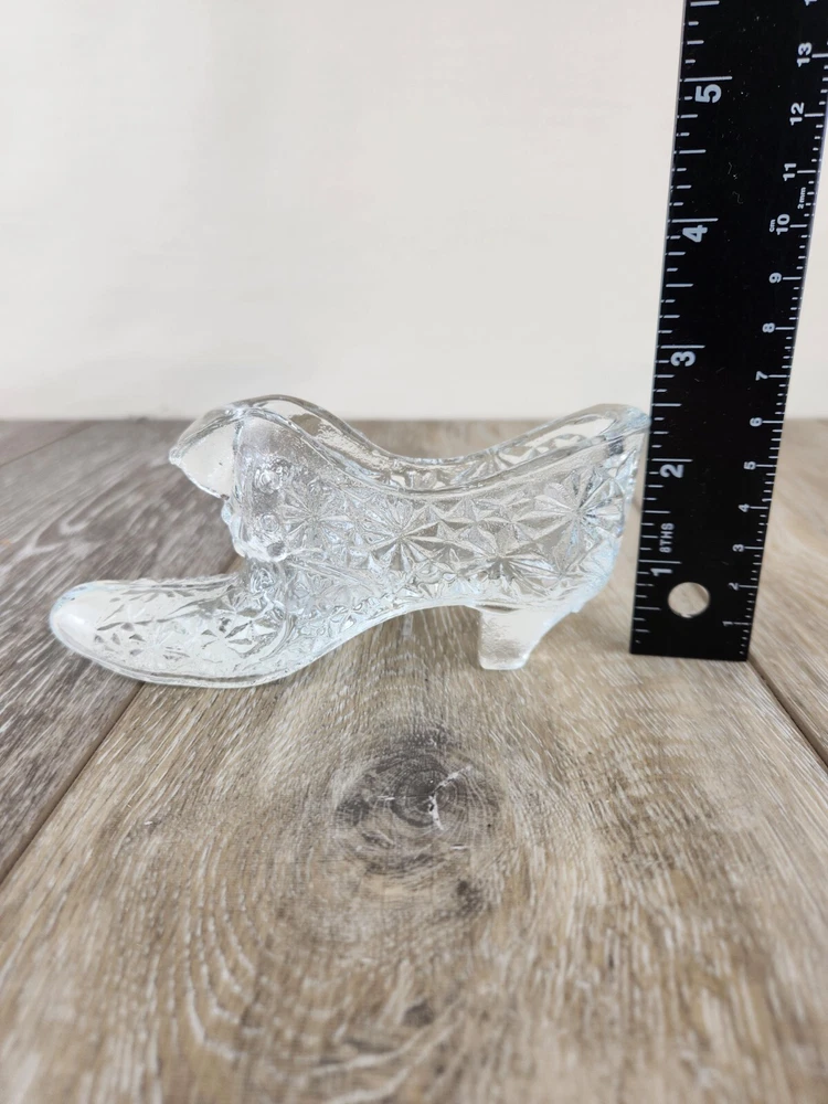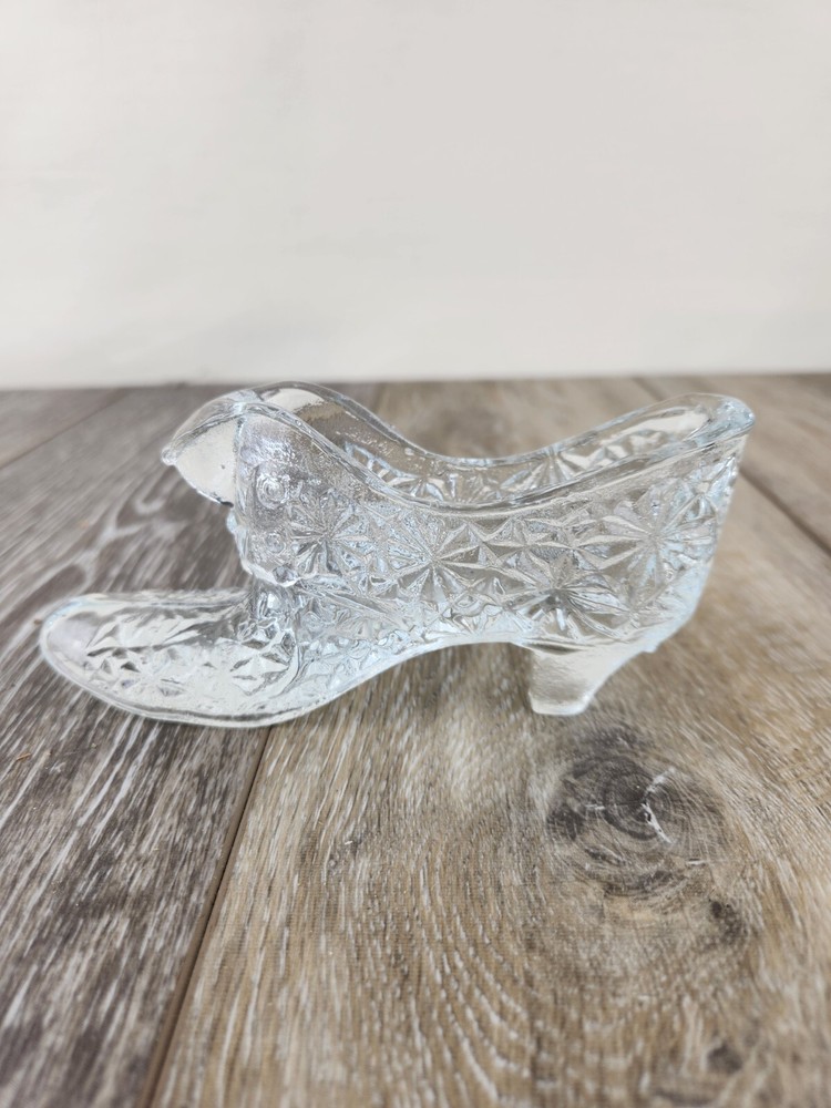 Add timeless charm to your collection with this vintage Fenton clear glass slipper shoe, crafted in the classic daisy and button pattern. This pressed glass figurine features fine detailing and a polished, light-catching design that Fenton Glass is known for. Shaped like a dainty slipper, it’s perfect for displaying on a shelf, dresser, or in a curio cabinet. Whether you're a collector of vintage glassware or looking for a charming gift, this piece blends vintage American glass artistry with decorative appeal. Authentic, collectible, and full of sparkle. *Excellent condition! There may be imperfections from the mold.
