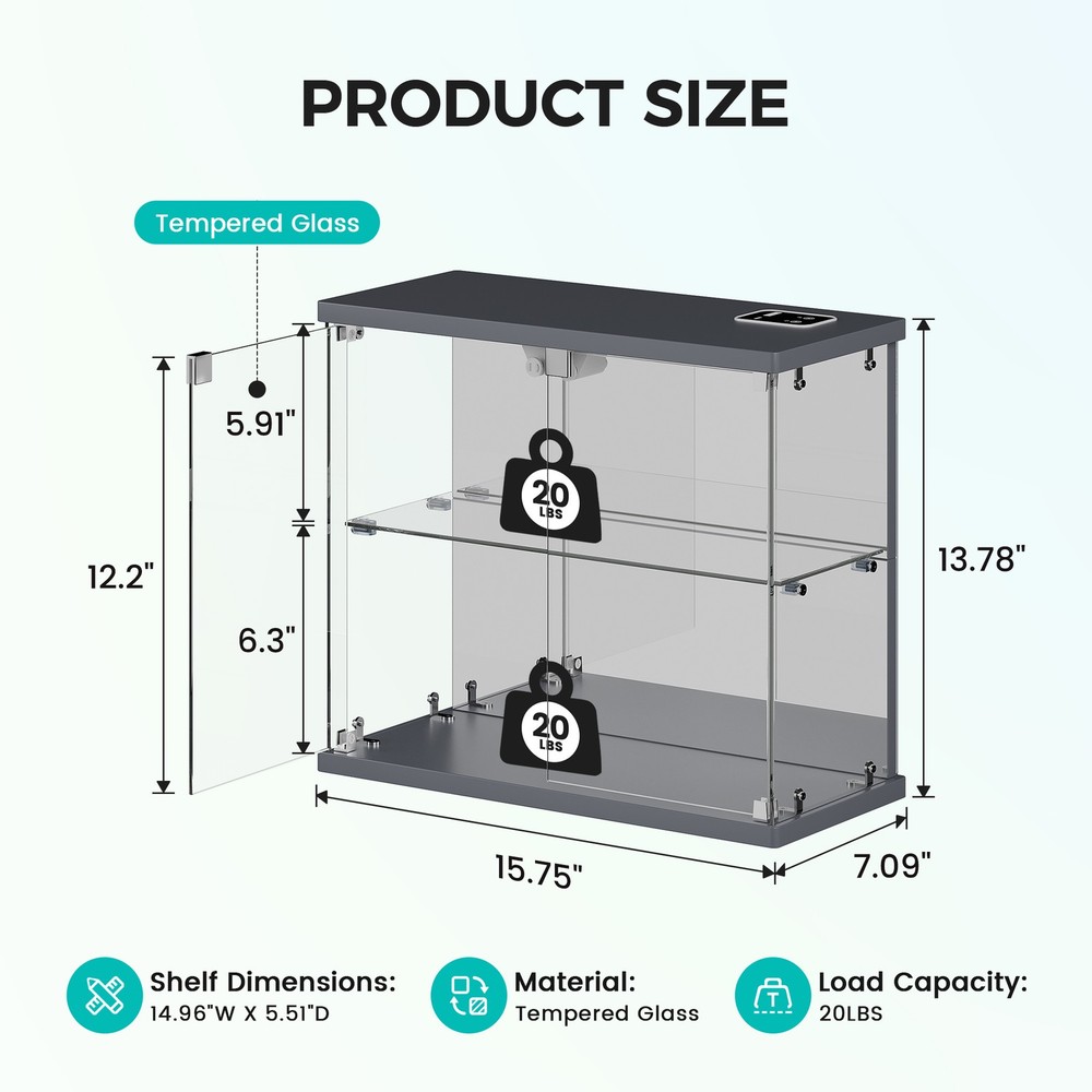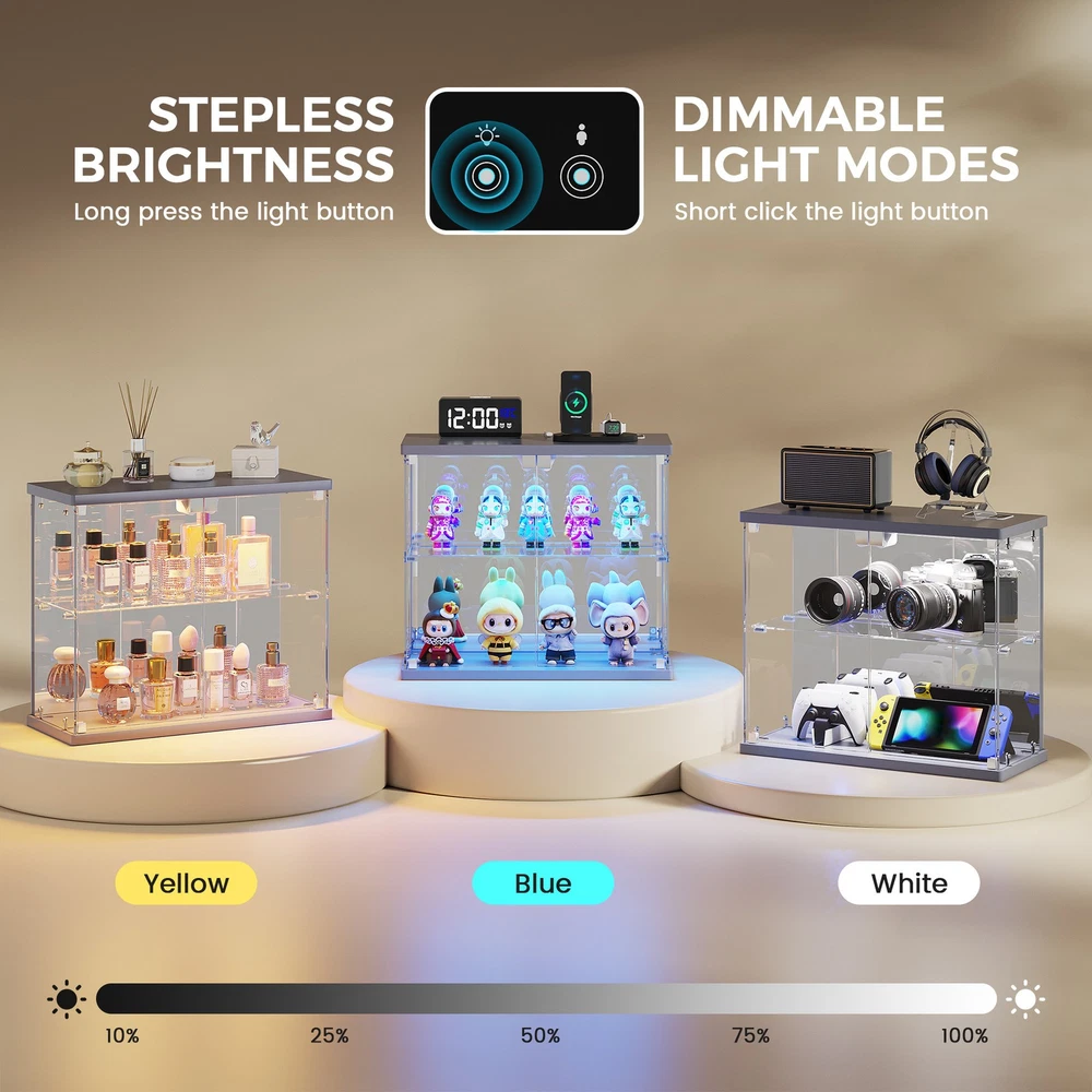 Magnetic Door with Safe Tempered – Featuring a press-to-open design, you can easily access your items with just a gentle push. This display box utilizes explosion-proof tempered glass is both crystal clear and safe. It effectively dustproofs and yellowing resistance that let your small Lego displays, perfumes, toys, or décor can be completely visible Light Control Module with Motion Sensing - This smart showcase upgrades your collection display with built-in LED lights(white, yellow, blue). The human sensor automatically switches the lights on when you approach within 1 meter, and turns them off after 30 seconds, achieving both energy efficiency and a stunning visual display Integrated Charger Station – This display organizer comes equipped with a built-in Type-C and a USB port, enabling simultaneous charging for two devices. Conveniently power your phone, tablet, earbuds, or smartwatch without the need for extra adapters. Keep your essentials fully charged overnight while maintaining a clean, cable-free display surface Mirrored Back Panel – With a mirrored back, this glass display case reflects your collectible figurines, visually expanding the space and adding remarkable depth to each piece. Not only does it brighten the entire display, but it also turns any ordinary space into a dynamic and eye-catching part of your bedroom Easy Assembly with Clear Instructions – Each panel is clearly labeled, and detailed step-by-step guides will walk you through the process. For optimal ease, using power tools is better. Enjoy a creative hour of assembly as a rewarding project with your partner or family Our product frames are all made of FSC-certified wood Lighting for Your Display Charge Hub for Your Desk Tempered Glass: Why It’s Clearly Better Gifts to Display & Delight