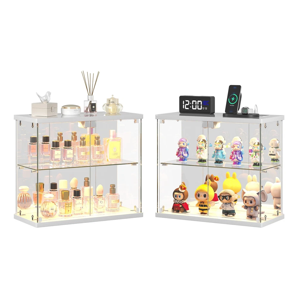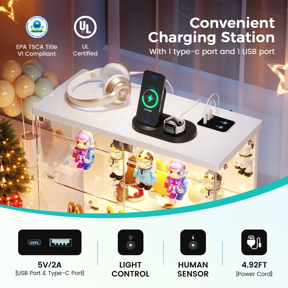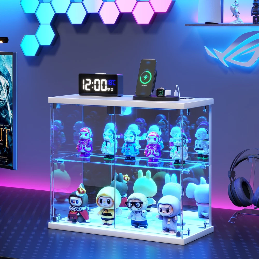 Magnetic Door with Safe Tempered – Featuring a press-to-open design, you can easily access your items with just a gentle push. This display box utilizes explosion-proof tempered glass is both crystal clear and safe. It effectively dustproofs and yellowing resistance that let your small Lego displays, perfumes, toys, or décor can be completely visible Light Control Module with Motion Sensing - This smart showcase upgrades your collection display with built-in LED lights(white, yellow, blue). The human sensor automatically switches the lights on when you approach within 1 meter, and turns them off after 30 seconds, achieving both energy efficiency and a stunning visual display Integrated Charger Station – This display organizer comes equipped with a built-in Type-C and a USB port, enabling simultaneous charging for two devices. Conveniently power your phone, tablet, earbuds, or smartwatch without the need for extra adapters. Keep your essentials fully charged overnight while maintaining a clean, cable-free display surface Mirrored Back Panel – With a mirrored back, this glass display case reflects your collectible figurines, visually expanding the space and adding remarkable depth to each piece. Not only does it brighten the entire display, but it also turns any ordinary space into a dynamic and eye-catching part of your bedroom Easy Assembly with Clear Instructions – Each panel is clearly labeled, and detailed step-by-step guides will walk you through the process. For optimal ease, using power tools is better. Enjoy a creative hour of assembly as a rewarding project with your partner or family Our product frames are all made of FSC-certified wood Lighting for Your Display harge Hub for Your Desk Tempered Glass: Why It’s Clearly Better Gifts to Display & Delight