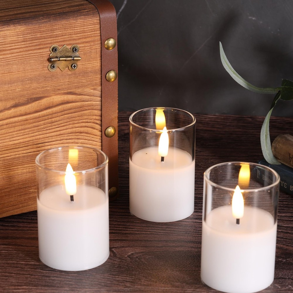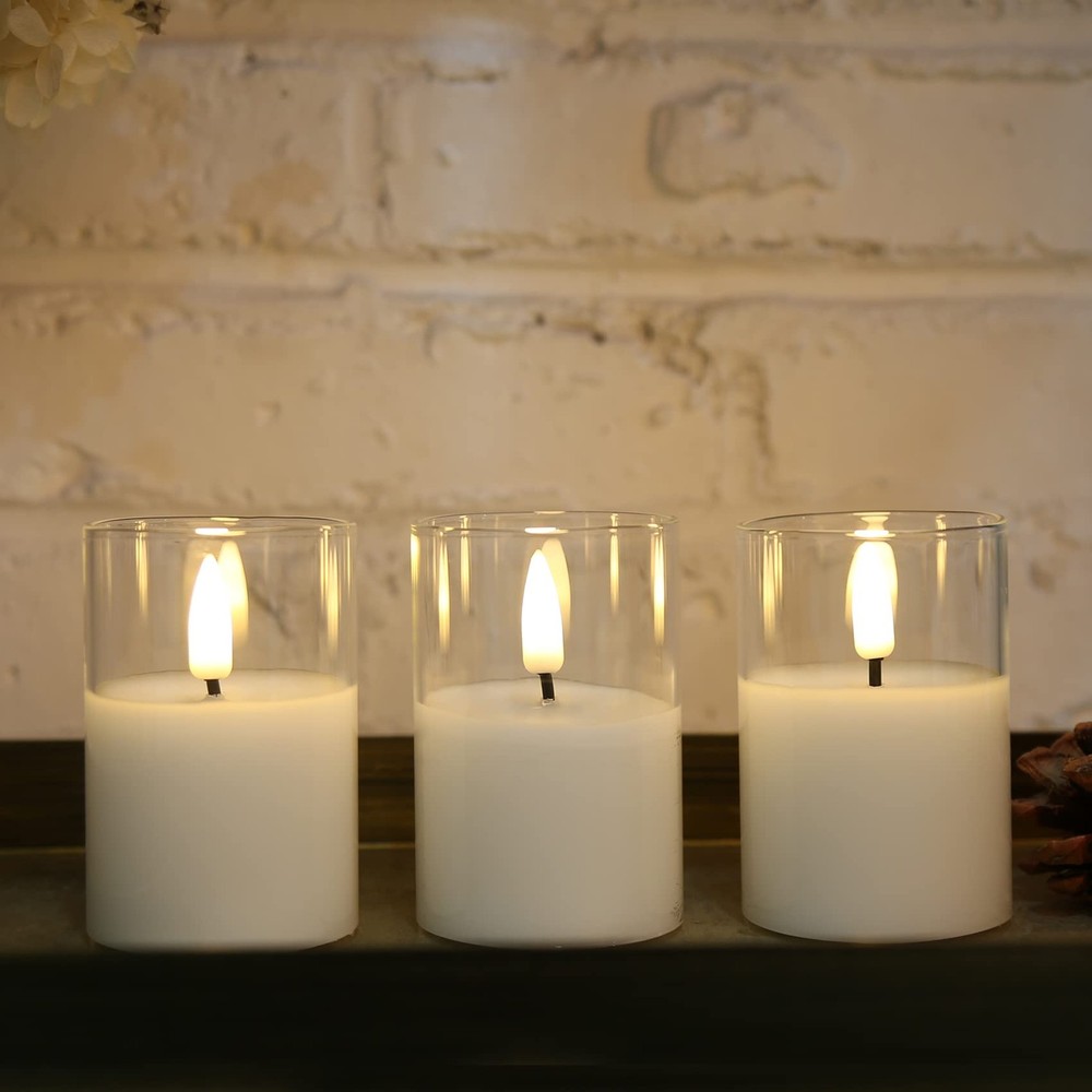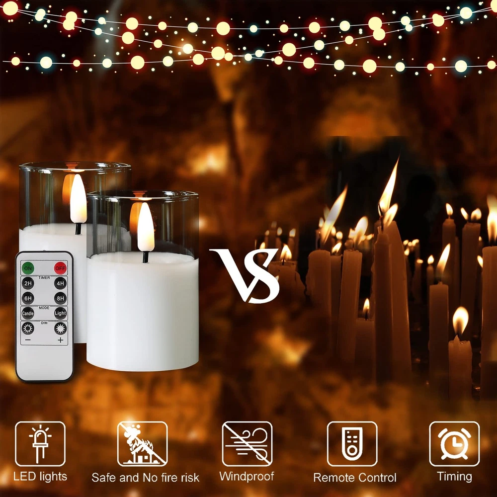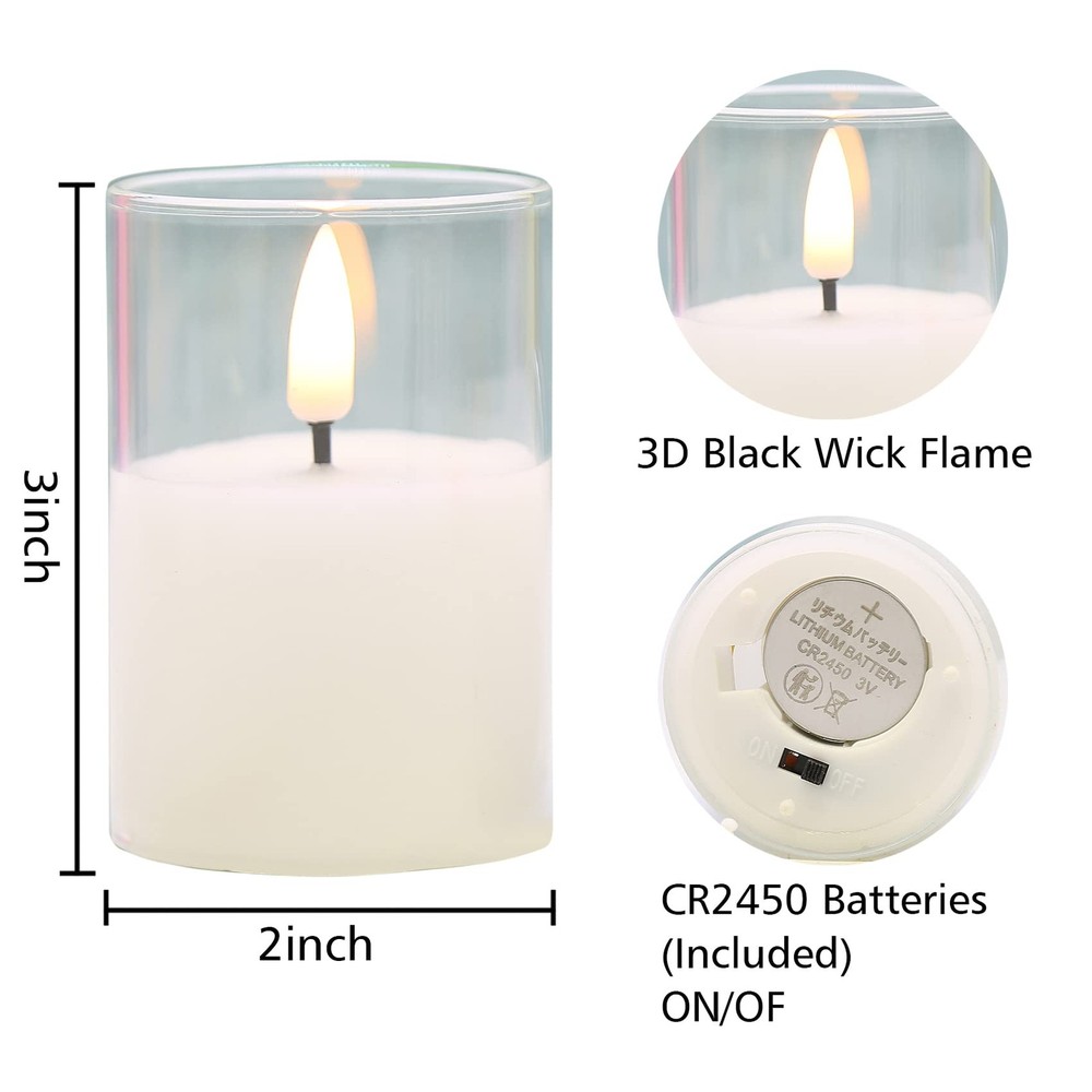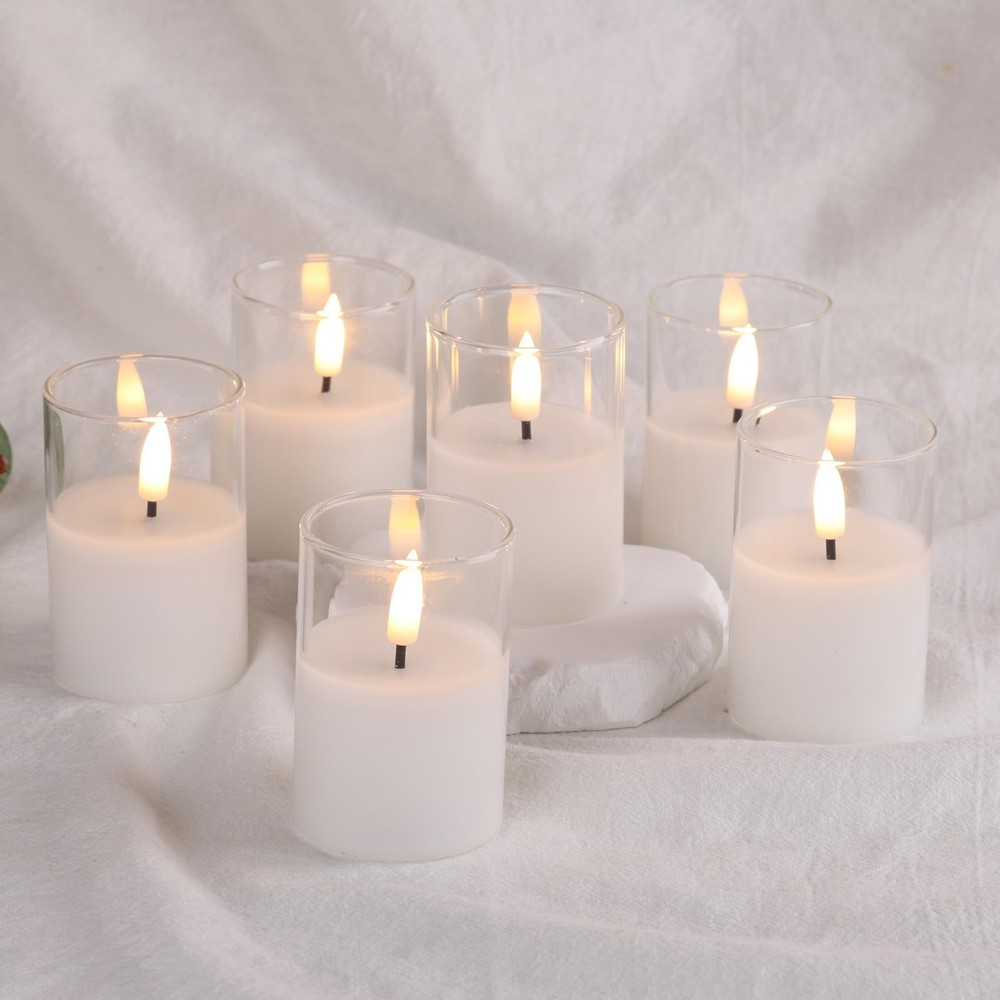 Add a uniquely beautiful to your home decor and create a soothing ambiance with flickering flameless glass candles set Speciafications: - set of 6 battery votive candles 2 inch diameter 3 inch height, 1 remote control, one user manual. -Clear, amber gold, smoke grey,green and red colors are available - candles are made by mirror-like premium glass, simulated with 3D black wick flame, realistic enough to fool your eyes. convenient remote control allows you control power, set 2/4/6/8 hours timer, set flickering or static flame within 20 ft range. -battery powered candles, each candle is operated by cr2450 coin cell, which lasts over 350 hours, 2 longer battery life. - Great for home, wedding, party decor and also wonferful gifts for housewarming, Christmas, Halloween and so on. Package Includes - 6 pieces flameless candles in clear glass jars (size: Φ 2" x H 3"), 1 10-key remote controller and manual instructions. 6 x CR2450 coin cells included. Realistic Flameless Candles - these candles are constructed with premium real glass not plastic and simulated with flickering black wick flame, giving off warm white glow, creates the illusion of real flames. Remote Control & Timer Function - remote controller works for all candles, which allows to control power, set 2/4/6/8 hours timer, adjust brightness and set flickering or static flame effect within 20 ft. Safe Comes First - these led candles are flameless, dripless, no smoke, no odor, hazard free, especially friendly for family which has naughty kids or pets, great alternative to real candles. Great Decor & Gift - these pretty led candles are ideal as table centerpieces, home, wedding, party, seasonal holiday festival decor and also wonferful gifts for friends and family.