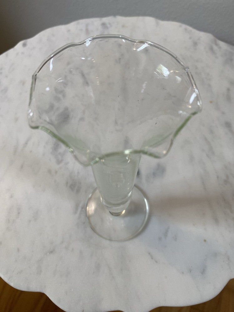 This clear glass ruffled tapered footed trumpet flower bud vase stands at 6 1/8 inches tall, making it a stylish and elegant addition to any home decor. The vase features a trumpet shape and a ruffled design, perfect for showcasing a single bloom or serving as a decorative piece on a tabletop. Its glass material adds a touch of sophistication, while its clear color allows the beauty of the flowers inside to truly shine. Ideal for adding a touch of floral charm to any room in your home.