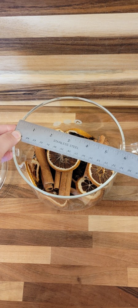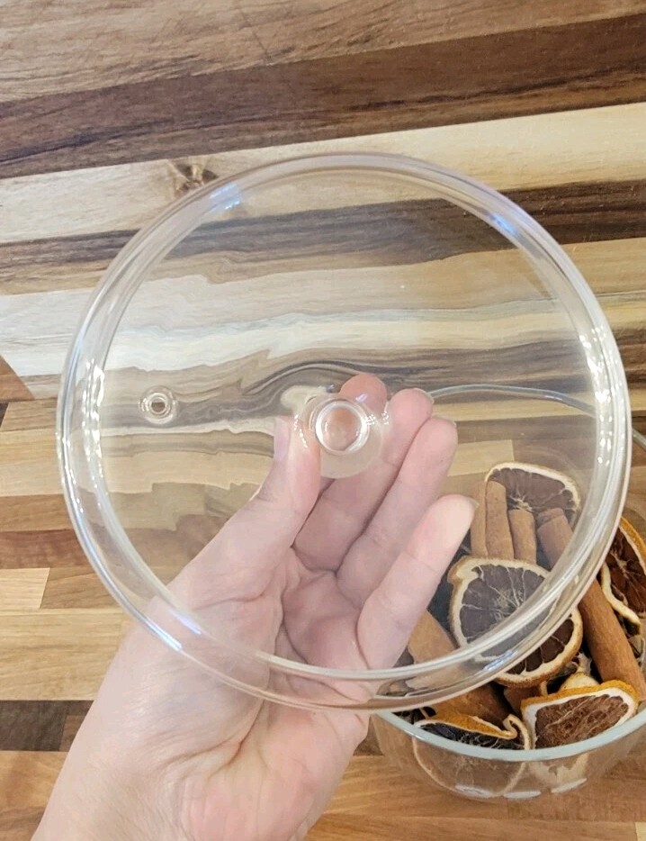 Never used. Clear Glass simmer pot with vented lid. Also has dried simmer mix in the pot for one use. Photos are part of the listing description. All items come from a smoke-free environment, are handled with care, and shipped within 1 business day! Message us if you have any questions and/or want additional photos. Thank you for visiting! Please check out our store for other items. We are happy to bundle items for discounted shipping!