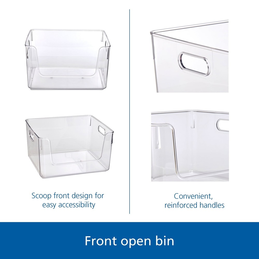 Mainstays clear open front organizer bin is designed for adults. It has 2 handles which enable convenient delivery. You could easily take it anywhere. Stack-able design is good for saving space and organization.This is the ideal transparent storage solution for sweaters, accessories & more. Scoop front design for easy accessibility to retrieve items. The product is made of durable clear plastic, which allows contents easily to be viewed. It is also multi-functional as it could be used in pantry or anywhere. This organizer bin could fits perfectly into your closet, you will find your closet clean and tidy with this organizer! Mainstays open front bin Translucent, scoop front design for easy accessibility Multi-functional storage & organizer bin Made of clear plastic Product size: 13in W x 11.5in D x 7.06in H / 33x29.2x17.9cm Product weight: 810g Designed only for adults Modular design for easy organization