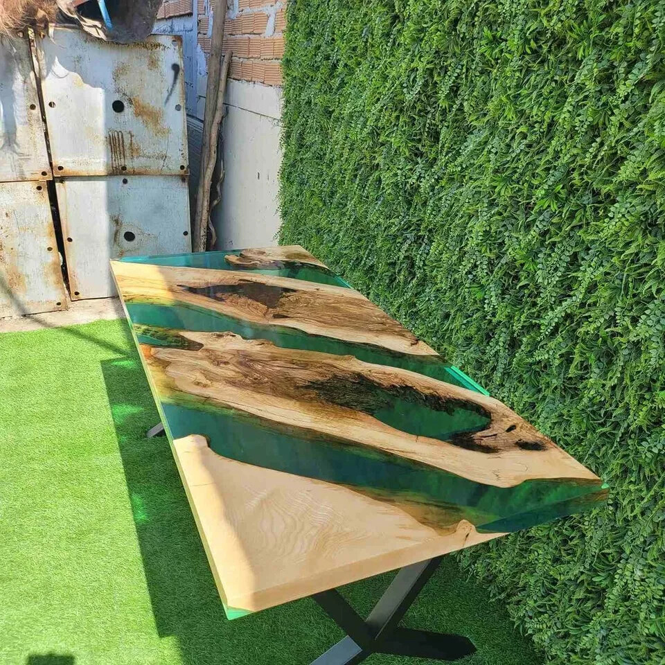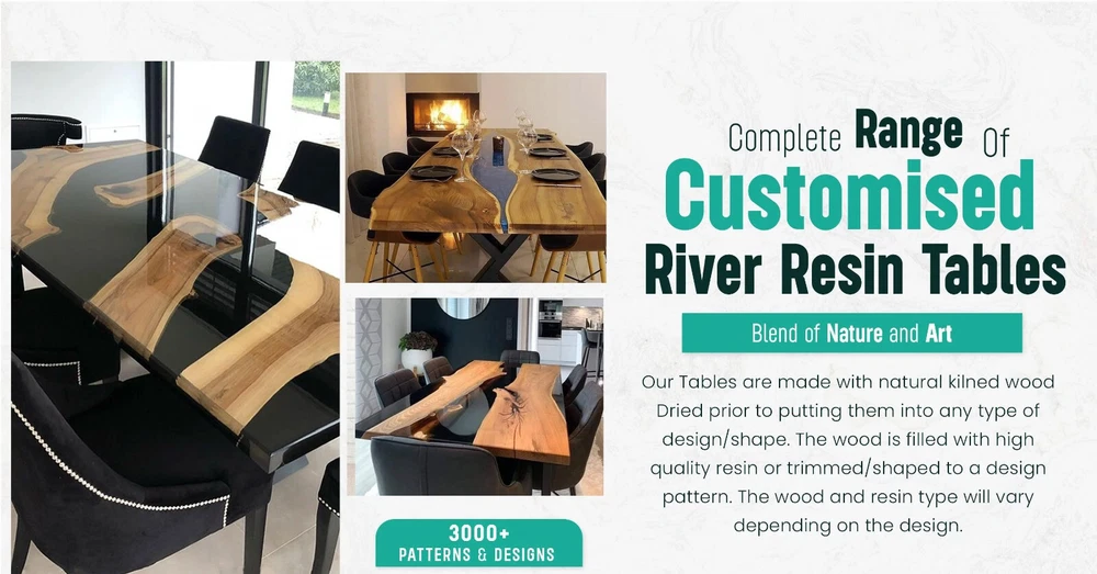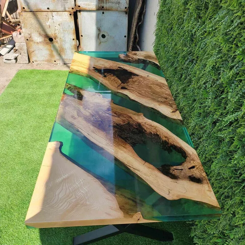 love the table, a true work of art. Price to quality relationship very high. There are a lot of wanna bes out there, but few true craftsmen in this space, and they are craftsmen. Lots of back and forth to get what we desired.. nonlinear edges, curvy river, branch circles within wood, blue resin covering only 20% of table overall, specific length and width, leg style. Shipped via air very quickly too. Two thumbs up!