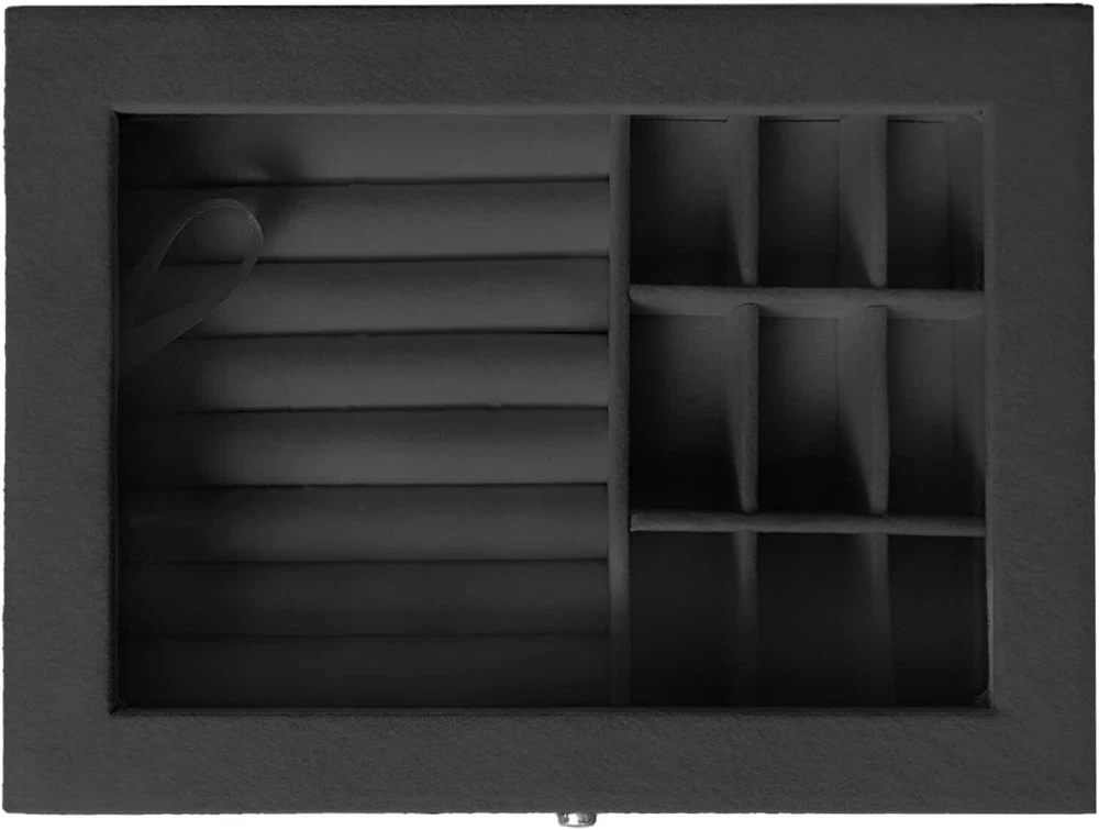 Clear Lid Velvet Jewelry Organizer Box with 9 Grids and 8 Slots 9 Grid, Black Product Details Color: Black Brand: Jemjosh Material: Acrylic Style: Modern Special Feature: Jewelry Organizer,Removable Recommended Uses For Product: Ring Product Dimensions: 8"D x 6"W x 1.9"H Target Audience: Women Shape: Rectangular Occasion: Mother's Day, Wedding, Friendship Day, New Home, Valentine's Day ATTRACTIVE DESIGN: This velvet lining jewelry case have a transparent Acrylic lid that can be clear for owner to see their jewelry and accessory. One integrated safety locks for added security, protect your rings, earrings, chain necklaces, small watches, thin bracelets and cuffs. DIMENSION and DESIGN: Compact design 8*6*1.9 inch. This jewelry organizer is composed of 8 ring slots that can hold about 30 rings, and the removable divider create 9 grid for your jewelry. CLEAR AND TIDY: Put this Jemjosh jewelry box on your dresser or in the drawer can keep your dresser in order and it's will be seldom to lost your accessory or some small things. You can storage your thing easy and clean. MULTIFUNCTION: This jewelry organizer can hold and protect your jewelry, some souvenir coins or medallions, Not only for home use but also suitable for countertop jewelry display in stores or trade shows. PERFECT GIFT: Velvet jewelry box is a great thoughtful gift for a mother, girlfriend , wife, daughter, colleague, friend or any other special woman in your life. An idea gift for Mother's day, Christmas, Birthday, Thanks Giving day and Anniversary.