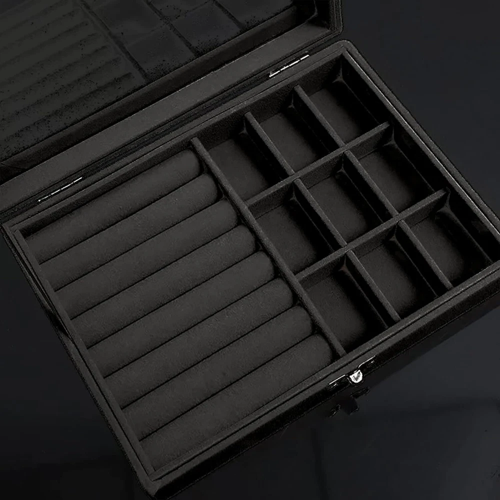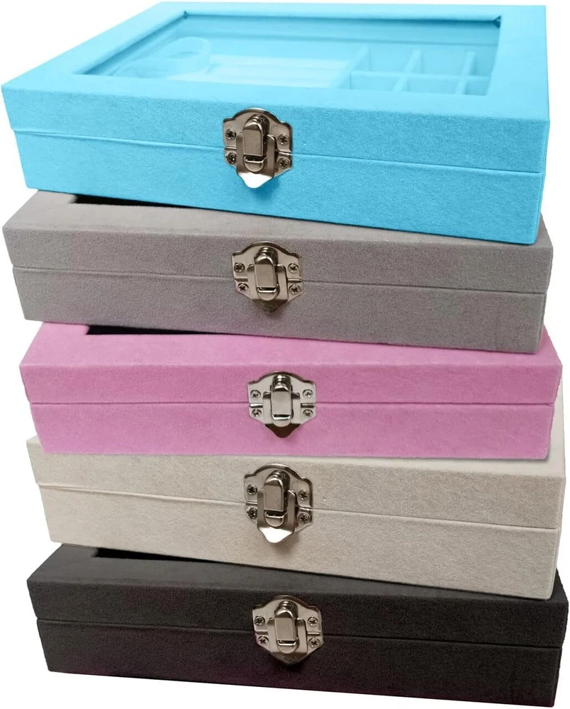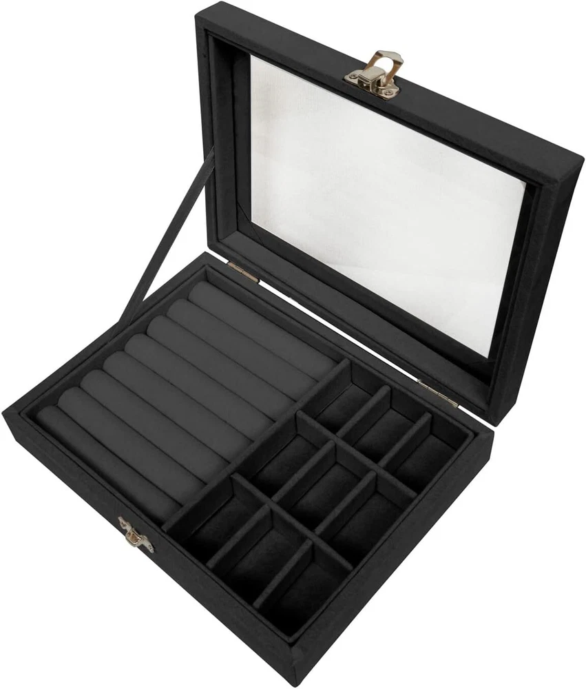 Clear Lid Velvet Jewelry Organizer Box with 9 Grids and 8 Slots 9 Grid, Black Product Details Color: Black Brand: Jemjosh Material: Acrylic Style: Modern Special Feature: Jewelry Organizer,Removable Recommended Uses For Product: Ring Product Dimensions: 8"D x 6"W x 1.9"H Target Audience: Women Shape: Rectangular Occasion: Mother's Day, Wedding, Friendship Day, New Home, Valentine's Day ATTRACTIVE DESIGN: This velvet lining jewelry case have a transparent Acrylic lid that can be clear for owner to see their jewelry and accessory. One integrated safety locks for added security, protect your rings, earrings, chain necklaces, small watches, thin bracelets and cuffs. DIMENSION and DESIGN: Compact design 8*6*1.9 inch. This jewelry organizer is composed of 8 ring slots that can hold about 30 rings, and the removable divider create 9 grid for your jewelry. CLEAR AND TIDY: Put this Jemjosh jewelry box on your dresser or in the drawer can keep your dresser in order and it's will be seldom to lost your accessory or some small things. You can storage your thing easy and clean. MULTIFUNCTION: This jewelry organizer can hold and protect your jewelry, some souvenir coins or medallions, Not only for home use but also suitable for countertop jewelry display in stores or trade shows. PERFECT GIFT: Velvet jewelry box is a great thoughtful gift for a mother, girlfriend , wife, daughter, colleague, friend or any other special woman in your life. An idea gift for Mother's day, Christmas, Birthday, Thanks Giving day and Anniversary.