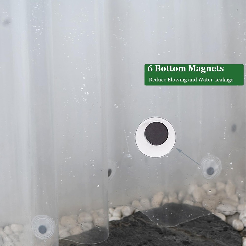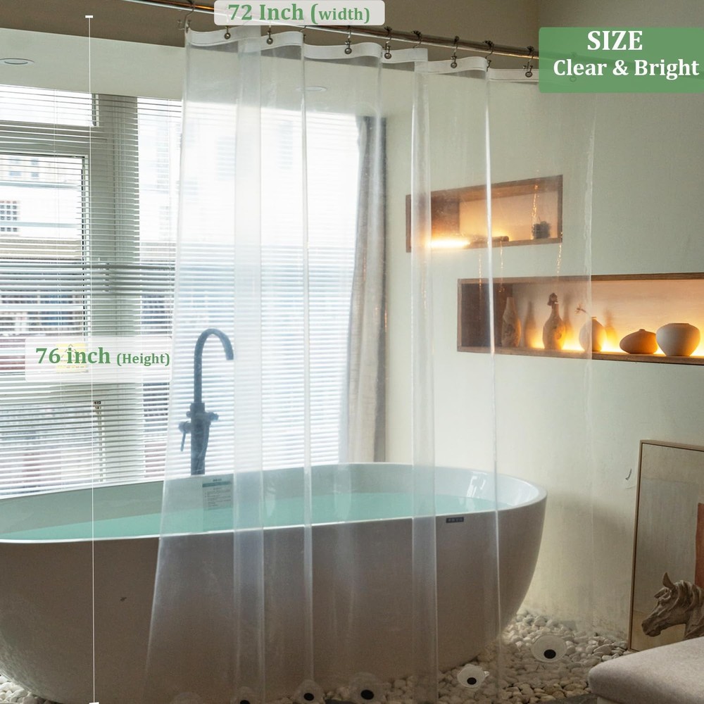 Size & Clear Shower Curtain Liner & No Bad Smell : The extra long shower curtain liner measuers 72" W X 76" H,making it perfect for tall shower bathroom, and is made of high-quality PEVA material, which is the safest material. in addition, clear design made your bathroom brighter,It can be used as a standalone shower curtain or as a shower liner for a fabric shower curtain. Lightweight with 3 Big Strong Magnets : the thickness is 4G, it is lightweight with upgrade 3 weighted big Magnets on the bottom of shower curtain liner can effectively stabilize the shower curtain and effectively prevent the shower curtain from sticking to the body when bathing. Waterproof & Easy Care: The 76 inch shower curtain liner is waterproof shower liner,do not need special care required, just maintenance through basic wiping, your PEVA plastic shower curtain liner will be free of any unhealthy conditions. For best results, open fully after each use to air dry. Resists Tearing and Rusting】The 72x76 shower curtain liner has 12 Rust proof metal grommets and reinforced top header is durable and strong, protect the shower curtain or liner tearing and ensure long term use. See goodbye with the days of ripped hook holes. Package The package includes 1 pcs of extra Long Clear Shower Curtain liner measuring 72 x 76 inch. Besids,