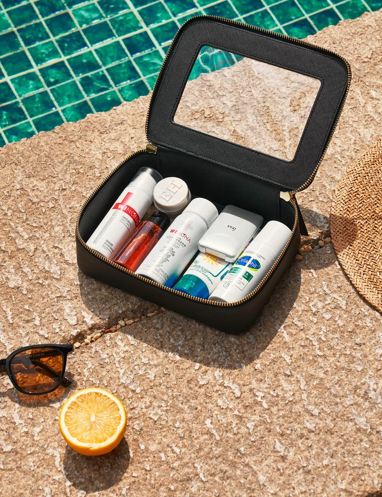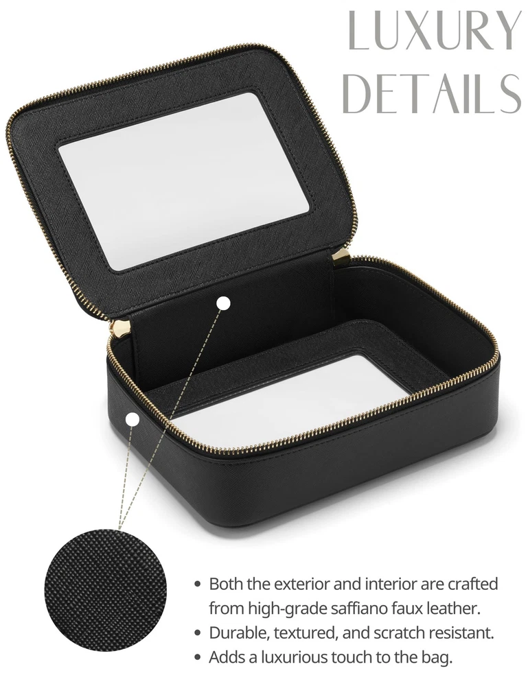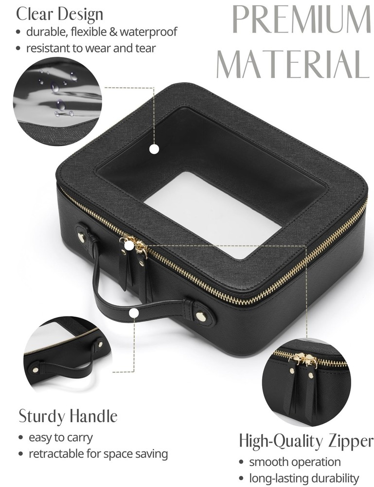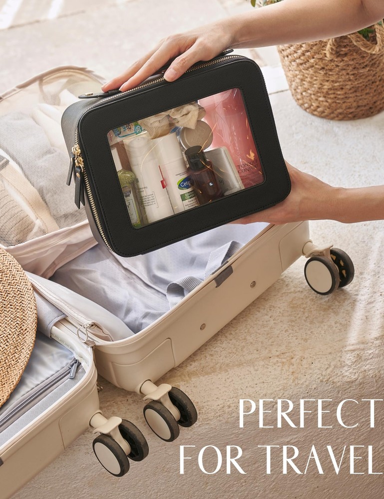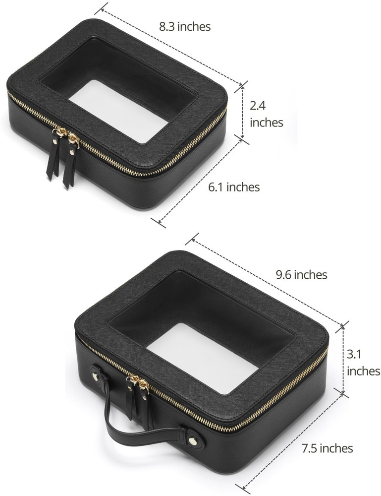 [Two-Piece Set] – The clear bag set consists of two different sizes, specifically designed to separate makeup and skincare products effectively. The medium size measures 8.3'' x 6.1'' x 2.4'' (21cm x 15.5cm x 6cm), the large size measures 9.6'' x 7.5'' x 3.1'' (24.5cm x 19cm x 8cm). [Premium Material and Durability] – The clear cosmetic case, both the exterior and interior, is crafted from high-grade saffiano faux leather, which is highly scratch resistant, durable and exceptionally easy to keep clean. It features a smooth zipper for secure closure, and elegant light gold metal hardware accents, adding a luxurious and sophisticated touch to the bag's overall design. [Clear Design] – The makeup bag features a transparent section made of high-quality clear material, which is durable, flexible and resistant to wear and tear. It allows for easy visibility and accessibility of your essentials. [Waterproof and Easy cleaning] – The makeup bag is constructed from a water-resistant material, providing a protective barrier against water and moisture. It can be easily wiped clean with a damp cloth, making it convenient to maintain its pristine appearance during your travels. [Versatile Usage] – The bag's versatility extends beyond makeup storage. It can also be used for organizing other small items like jewelry, tech accessories, or stationery.