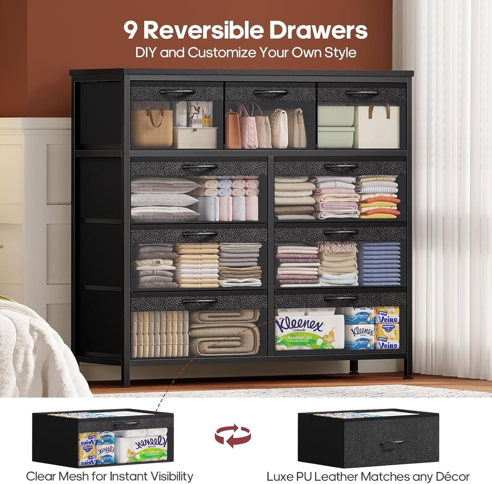 Product Description About this item 9 Large Drawers: Maximize your storage with 9 spacious drawers, offering ample space to organize everything from clothes to toys. With the 9 drawer dresser, get a neatly arranged home Dual-Sided Drawers: Featuring both mesh and PU leather sides, the black dresser let you choose between breathable visibility or sleek durability. Perfect for quick access or a polished look Versatile Placement: Whether it’s a nursery, a cozy living room, closet organizer or hallway, this dresser for bedroom adapts to your life, offering endless storage possibilities wherever you need it most Sturdy & Safe Design – Built with a durable wooden top, metal frame, and smooth-gliding drawers, this dresser is both child-friendly and stable, thanks to its anti-tip kit and adjustable feet Easy 30-Minute Assembly: Get your dressers ready in no time! All parts labeled and clear instructions included. Any worries? Our 24/7 customer service for peace of mind. Dresser for bedroom dimensions: 39.4"W x 11.8"D x 39.4"H On Aug 6, 2025 at 20:28:14 PDT, seller added the following information: