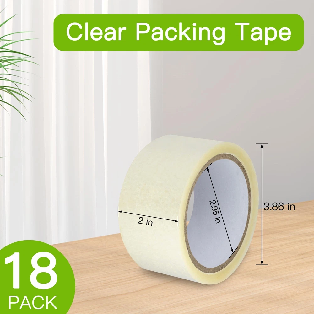 STANDARD SIZE: Packing tape bulk Includes 18 rolls each roll measures,2.0 inch wide; 65 yards length; 2.1mil thickness for a total of 1170 yards. STRONG ADHESIVE: With strong BOPP acrylic adhesive, the sturdy tape sticks very well and holds boxes together. MULTI PURPOSE TAPE: Wide Use it for office,warehouse,factory,store shipping, packaging, box and carton sealing, at home even removing clothing dust and pet hair. SAFE USE: with healthy pressure sensitive acrylic adhesive, our no bubble transparent tape will no distribute any chemical order, giving you comfortable packing environment. EASY TO USE:Easy to start the clear silent packing tape, will not split out rip during application, use with easily and save your packing time.