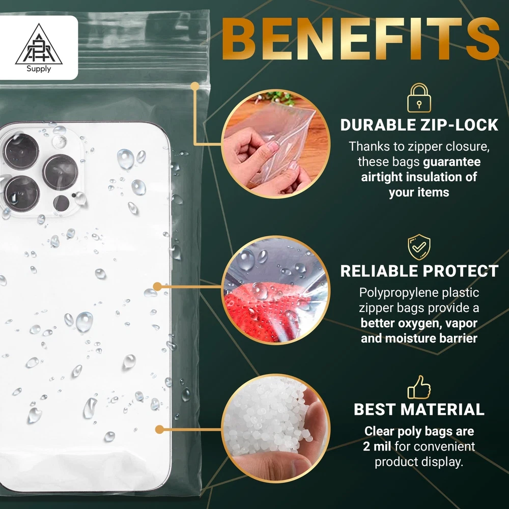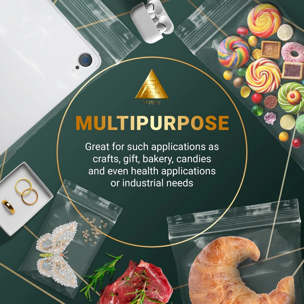 Polypropylene 2 mil Zipper Locking Food Storage Bags Specifications: Quantity: 100 pcs Material: Polypropylene Color: Clear Width: 6 inches Height: 6 inches Thickness: 2 mil , GMP, AIB, Kosher approved Recyclable Polypropylene (PP) has outstanding food protection properties combined with extraordinary clarity makes these bags ideal for food storage and retail presentation. Polypropylene reusable bags make your products look great! With their excellent strength and crystal-clear clarity, they are the preferred bag for retail product presentation. Zip bags are a great addition to any home, or shop. Perfect for storing different types of items. Great for organizing and separating food, products. You can use these handy bags to store office supplies, dressings, tapes, swabs, personal belongings, medications, and almost any small items you can think of. Keep objects safe and organized with these clear food bags. Make sure to keep a pack of these around for household use, storage and organization while traveling! These reclosable BOPP sandwich bags help delay evaporation and dehydration to preserve newness and taste of contained foods. Each of these packaging bags is made of premium quality polypropylene that meets all standards for food contact. SATISFACTION GUARANTEE: Durable clear bags are backed by 100% guarantee. If you are not completely satisfied with the product, you'll receive your money back! Pack of 100 Clear Zipper Bags, 6 x 6 Inch. Reclosable poly bags are perfect for storing and packaging your products. Reclosable plastic bags for food help keep products fresher longer and are used to seal standard weight products. High Quality. The 2-mil thick polypropylene zipper bags provide a better barrier to oxygen, vapor and moisture, and a longer shelf life than polyethylene bags. Their superior strength, reliable zipper closure and crystal-clear clarity make clear zip bags an excellent choice for retail food storage and presentation. Easy to Use and Durable. These polypropylene reclosable snack bags are reusable. The clear, transparent design makes it easy to see the items/food inside the zip bag. Easy to seal and unseal food storage bags make your products look great! Reusable and Recyclable. The sturdy construction of the small plastic baggies for jewelry allows them to be reused many times without compromising on quality. In addition, these recloseable plastic bags with zipper closure can be recycled. Multifunctional Use. Clear plastic bags for samples make storage and organization easy for business purposes. Our reclosable food bags are perfect for jewelry, small craft items, cosmetics, or hardware for sale. The plastic jewelry bags are great for home organization and storage of small items.