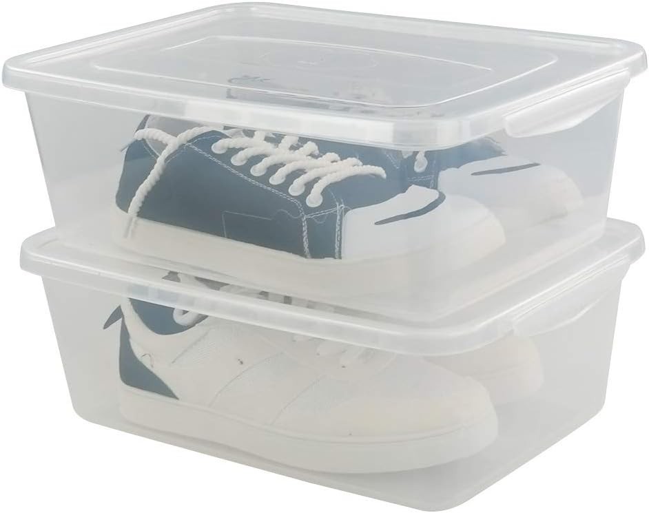 et of 4 clear bins, with latching lid Dimensions: 15"L x 10.5"W x 5.1"H (14 Qt) These box not only as food containers, storage bin, also can as shoes box Clear color allows you to easily identify contents Suitable for kitchen storage, can store snacks, also be stored in the refrigerator as a food container.
