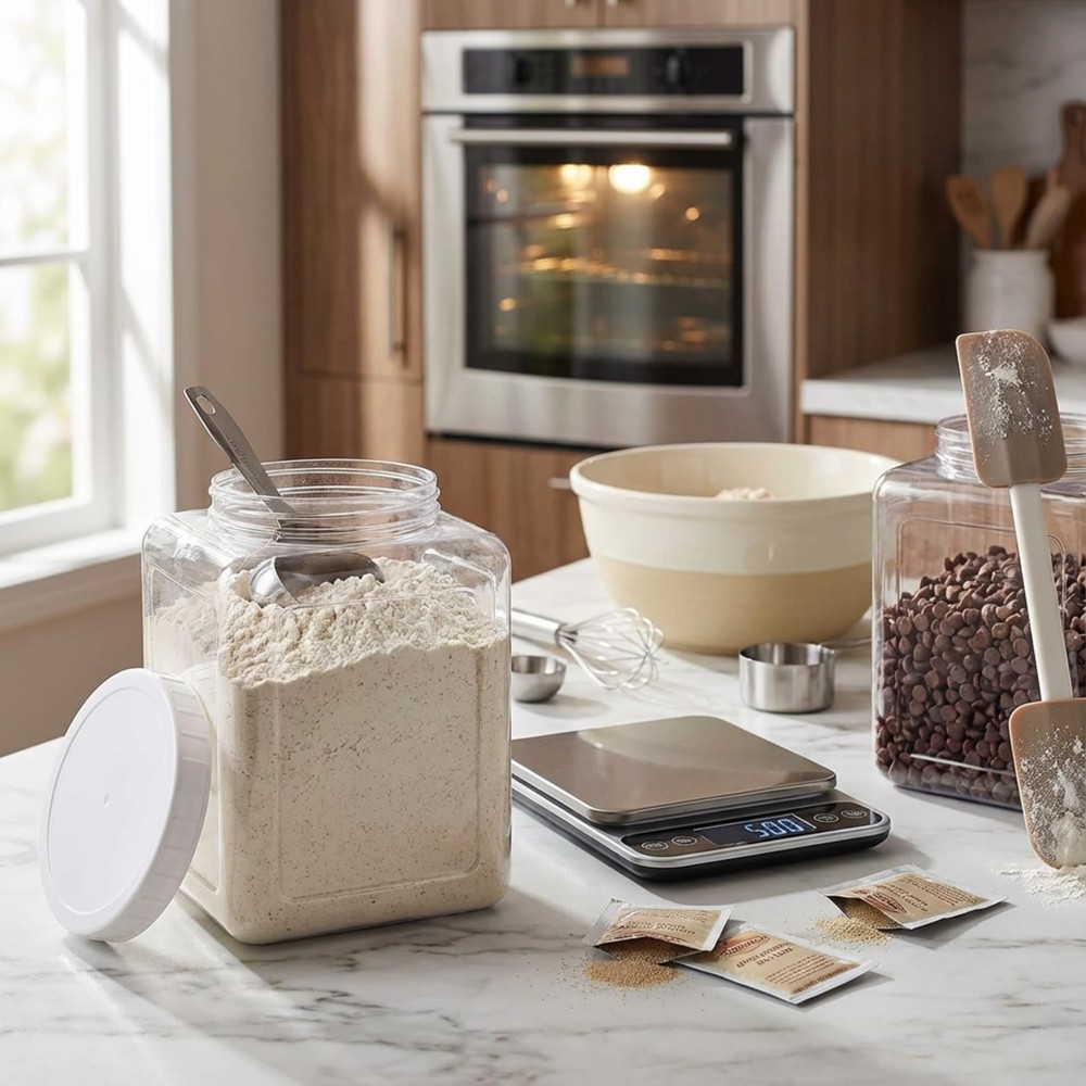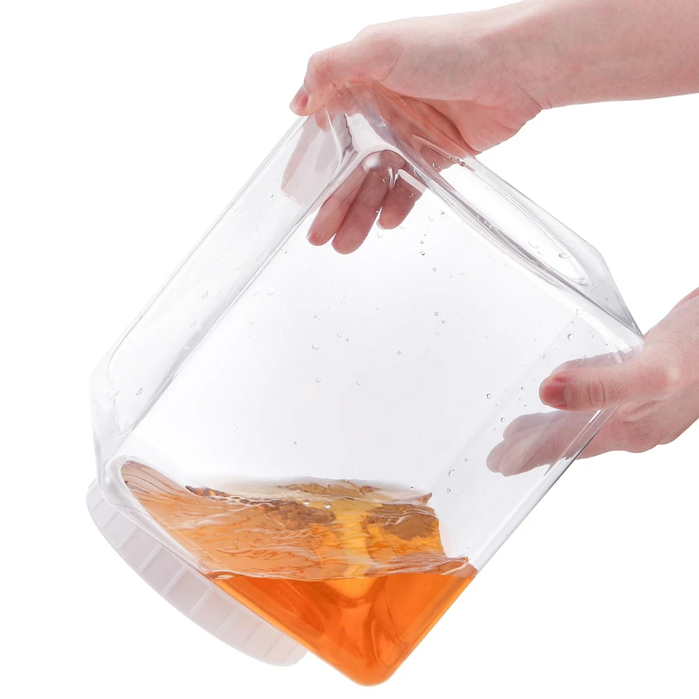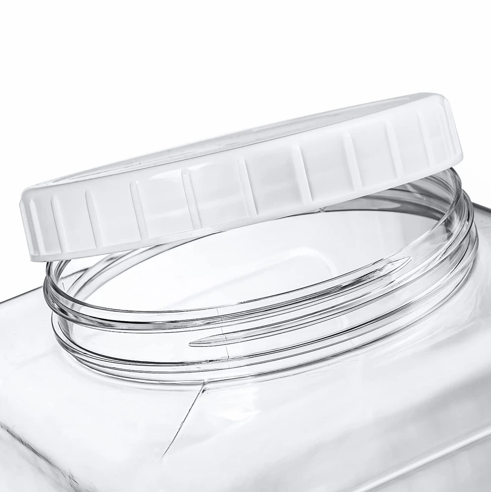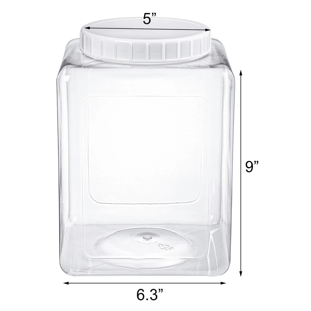 About This Item Durable Plastic Construction: This 2-pack of square plastic jars offers a generous 1.3-gallon capacity each. Every jar measures approximately 6.3 inches in diameter and 9 inches in height, with a wide 5-inch mouth opening. Designed for repeated use, the jars are easy to refill and clean. Not dishwasher or microwave safe—hand washing is recommended for both jars and lids to maintain quality. Safe, Food-Grade Material: Made from high-quality, food-safe PET plastic, these clear containers are lightweight yet durable, providing a practical alternative to heavy glass jars while allowing easy visibility of contents. Practical & User-Friendly Design: The wide-mouth opening allows effortless scooping and access to stored items. Ribbed, screw-on lids provide a secure grip for easy opening and a tight seal. Smooth interior corners simplify cleaning and refilling. Airtight & Fresh-Keeping: When properly sealed, the jars are airtight to help prevent spills, keep food fresh longer, and reduce odor transfer. Ideal for storing pantry staples such as spices, cereals, nuts, beans, flour, candies, and more. Versatile Use: Suitable for home kitchens and pantries as well as schools and offices for organizing tools, markers, crayons, and supplies. The lightweight design also makes these jars convenient for travel, camping, parties, and picnics.