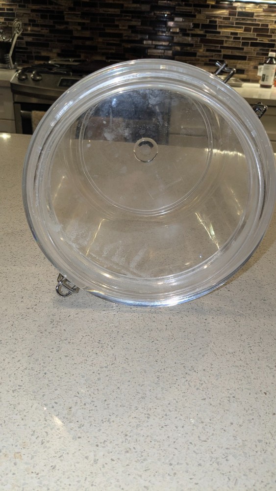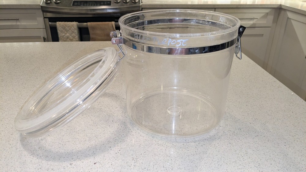 Clear Polycarbonate 4 Quart Airtight 9" Tall x 7.5" Round Latched Bulk Food Canister \. Made in China. Priced at significantly less than the same item listed elsewhere on eBay. Shipment via USPS Ground Advantage. Local pickup is also available.