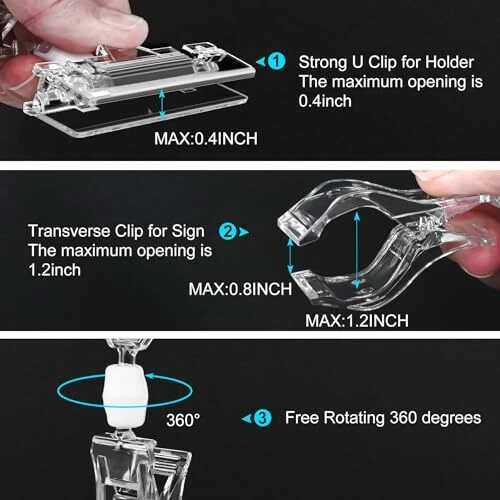 Return Policy Fast Delivery Trusted seller Clear Sign Clips on Merchandise Display 12 Pack Plastic Label Pop Clips on Sign Holder Shelf Double Sided Swivel Price Tag Clips on Clothing Rack Signs Rotatable Menu Clips for Sale Retail Display Product Description 【POP Merchandise Sign Clip】These Display Clips is made of acrylic plastic material for long lasting use. And with transparent color, the clip is neat and ununobtrusive, so it is adaptable to various merchandise signs. Besides, t are seven quantities to choose from, namely 12pcs, 18pcs, 24pcs, 30pcs, 50pcs, 60pcs, 100pcs. Sufficient quantity can meet your daily use and replacement needs, which is more suitable for supermarkets, fruit stalls, clothing stores and other occasions w a large number of sign holder clips are needed 【Double Clip Design】Our clear plastic clip features the double clip design. (Two Clips) One is base clip for holder and the other is transverse clip for sign. The two clips are connected through a white ball joint, which is easily rotable for 360 degrees 【360 Degrees Rotatable】 Bue to the ball joint, the merchandise sign clips are flexible, and can be bent and rotated 360 degrees in each direction for a complete display to attract customers 【Strong Clamping Force】 With super clamp mouth, rotatable clip allows you to adjust it at optimal position. It is easy to clamp and be fixed on the rack or self firmly. It is suitable for cylindrical objects, plates, square tubes, partitions, round tubes and so on 【Practical Function】Our sign holder is designed to display and exhibit price and product logo in stores, supermarkets or other shopping centers for advertising purposes, or display notes, reminders and photos at home or in the office. Combine the clip on sign with any sale sign, policy sign, or other sign card offered by supply store, shopping malls, supermarkets, fruit shops, retail stores and warehouse to attract customers Shipping Returns Payment Shipping Shipping is FREE to all addresses other than APO/PO boxes in the lower 48 states. All our stock ships from US-based warehouses. Shipped via USPS or UPS (depending on location and package weight) Unless stated otherwise, all orders will ship within 24-72 hours of your payment being processed. Check our feedback to see the great reviews of FAST shipping we offer. Returns Seller does not accept returns Payment We currently accept payment via eBay managed payments only. Once payment is cleared, we will dispatch your shipment within 1-3 business days. Please refer to the "Shipping" tab for more information regarding shipping speed to your destination.