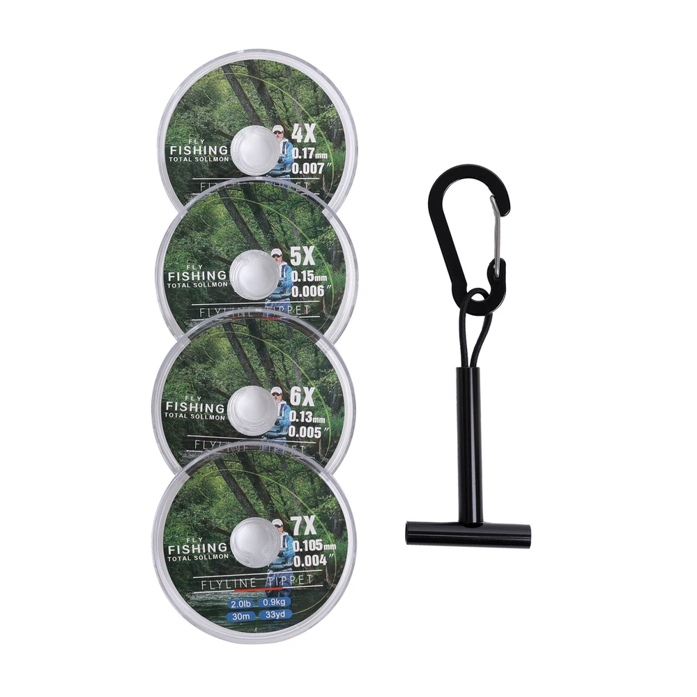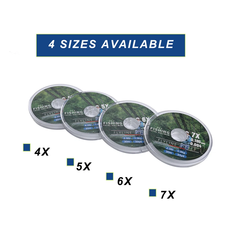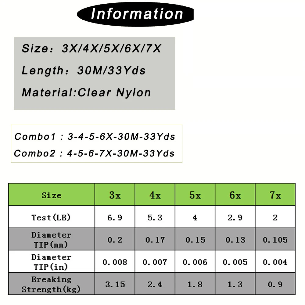 Products Photo Product Description Material: made of clear nylon, fishing tippet line high strength and light weight, is easy to replace. Convenient for You: tippet line holder keeps the tappet spools in order, easy to fetch, accommodates up to 5 tippet spools. The black anodized aluminum rod inside the holder, light weight, is corrosion resistant. With built-in elastic rope and loop, strong elasticity, easy to stretch, can be attached to any fishing vests. Length: 30M/33Yds Package: Combo1:3X, 4X, 5X, 6X tippet lines with tippet line spool holder Combo2:4X, 5X, 6X ,7X tippet lines with tippet line spool holder