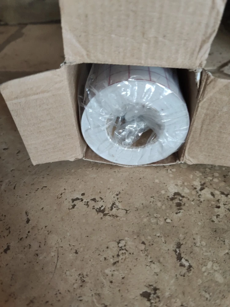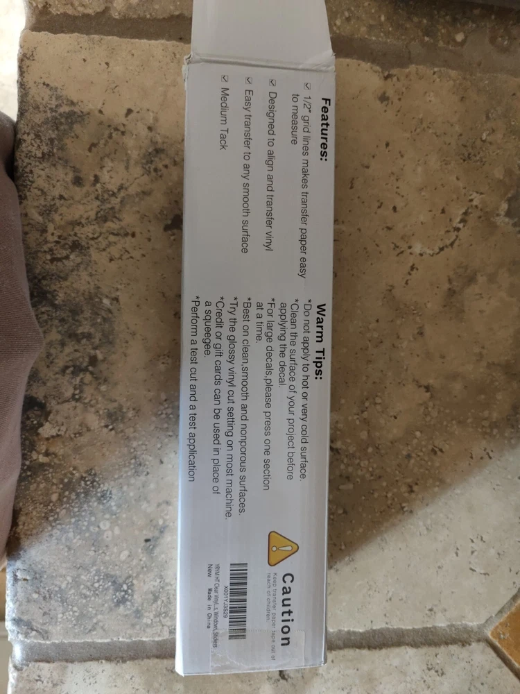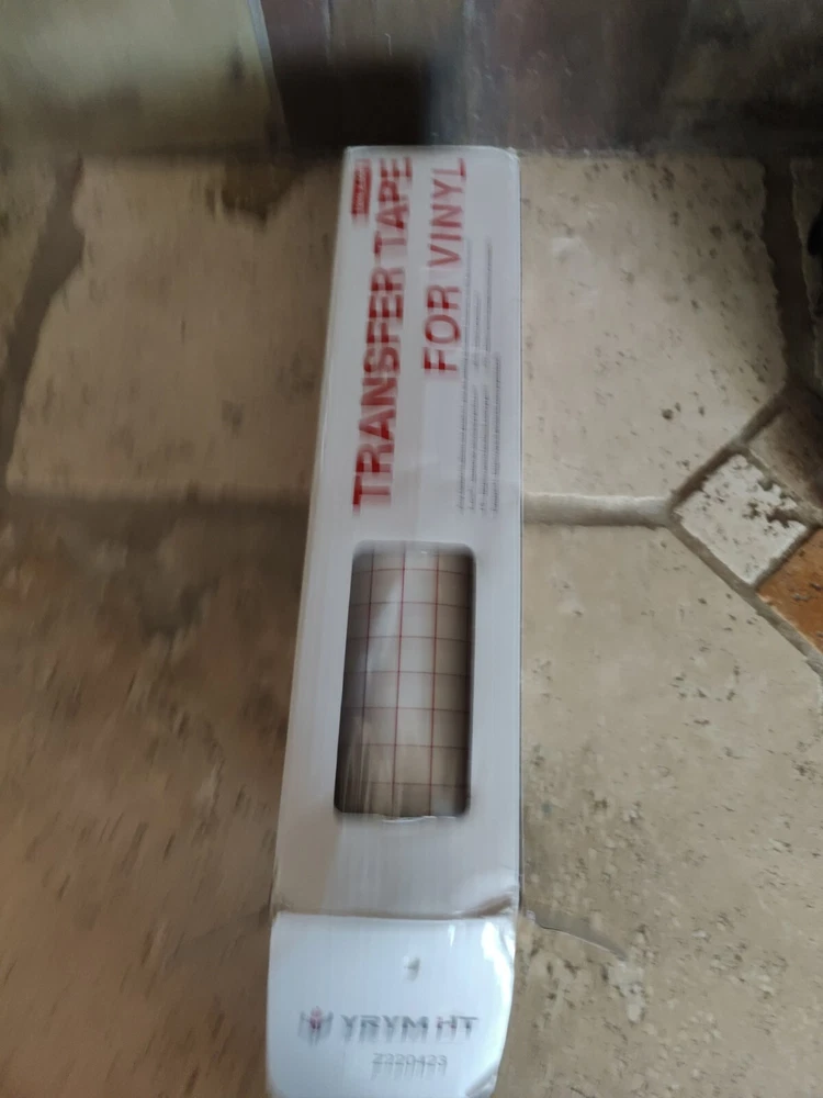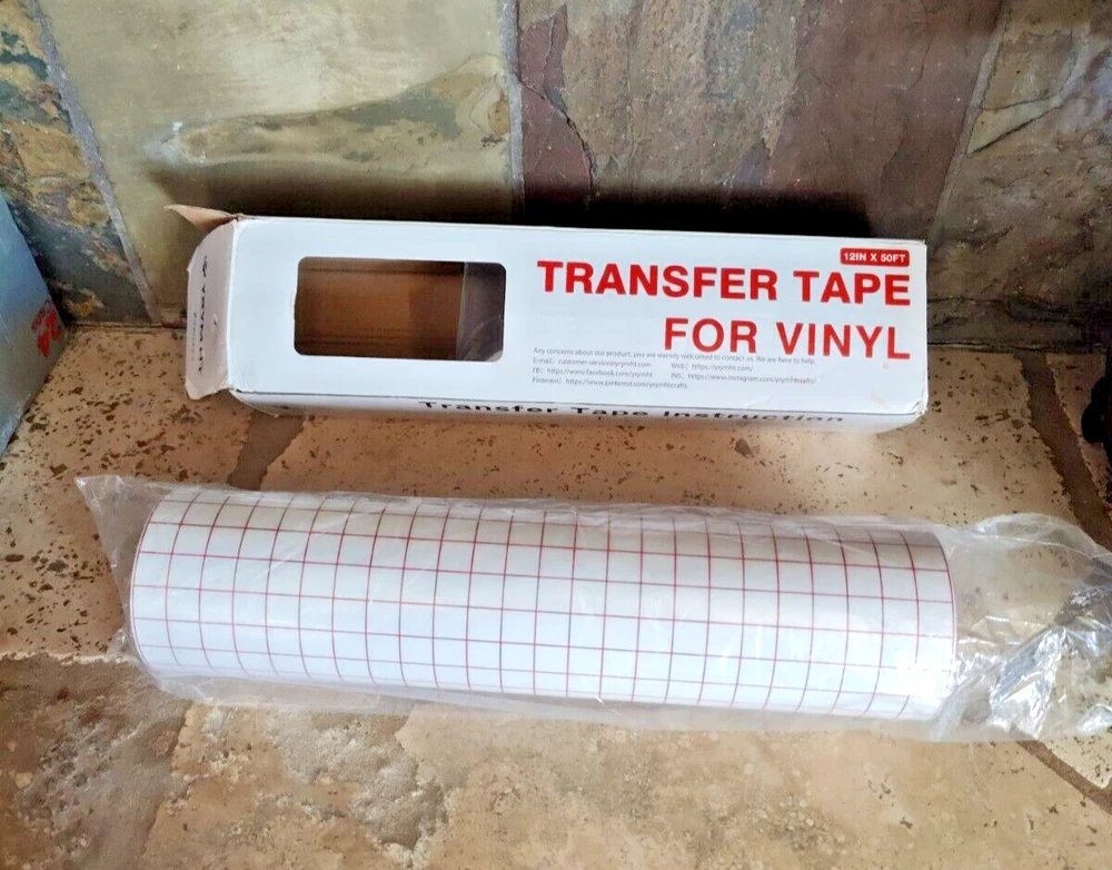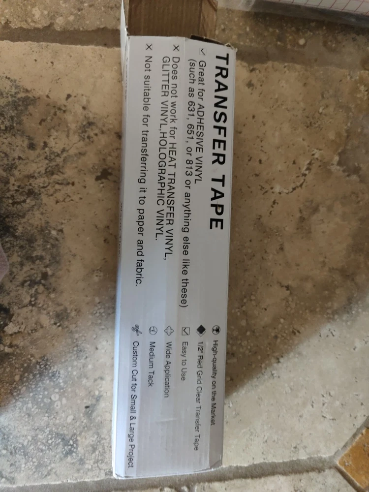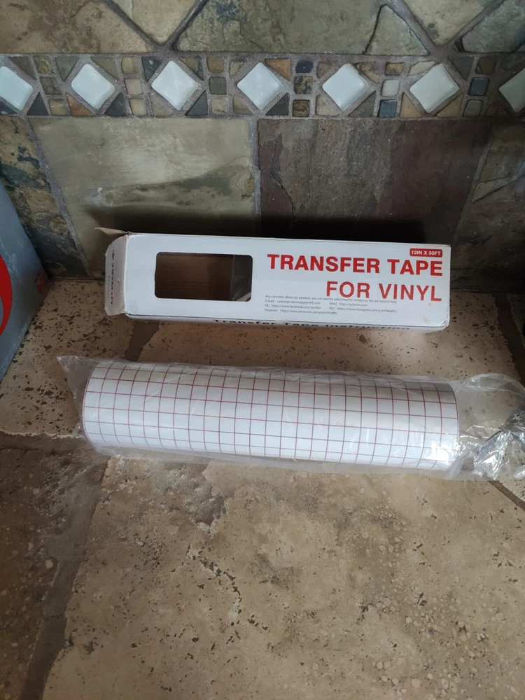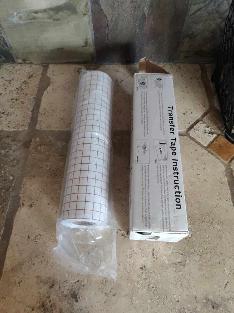 This clear transfer tape is perfect for vinyl projects, featuring a red grid design and measuring 12 inches by 50 feet (minus a foot or so that I used for a project) I used just a little bit of the roll Maybe 12" off the end so it's not a full 50' roll but very close. The box is a little beat up.
