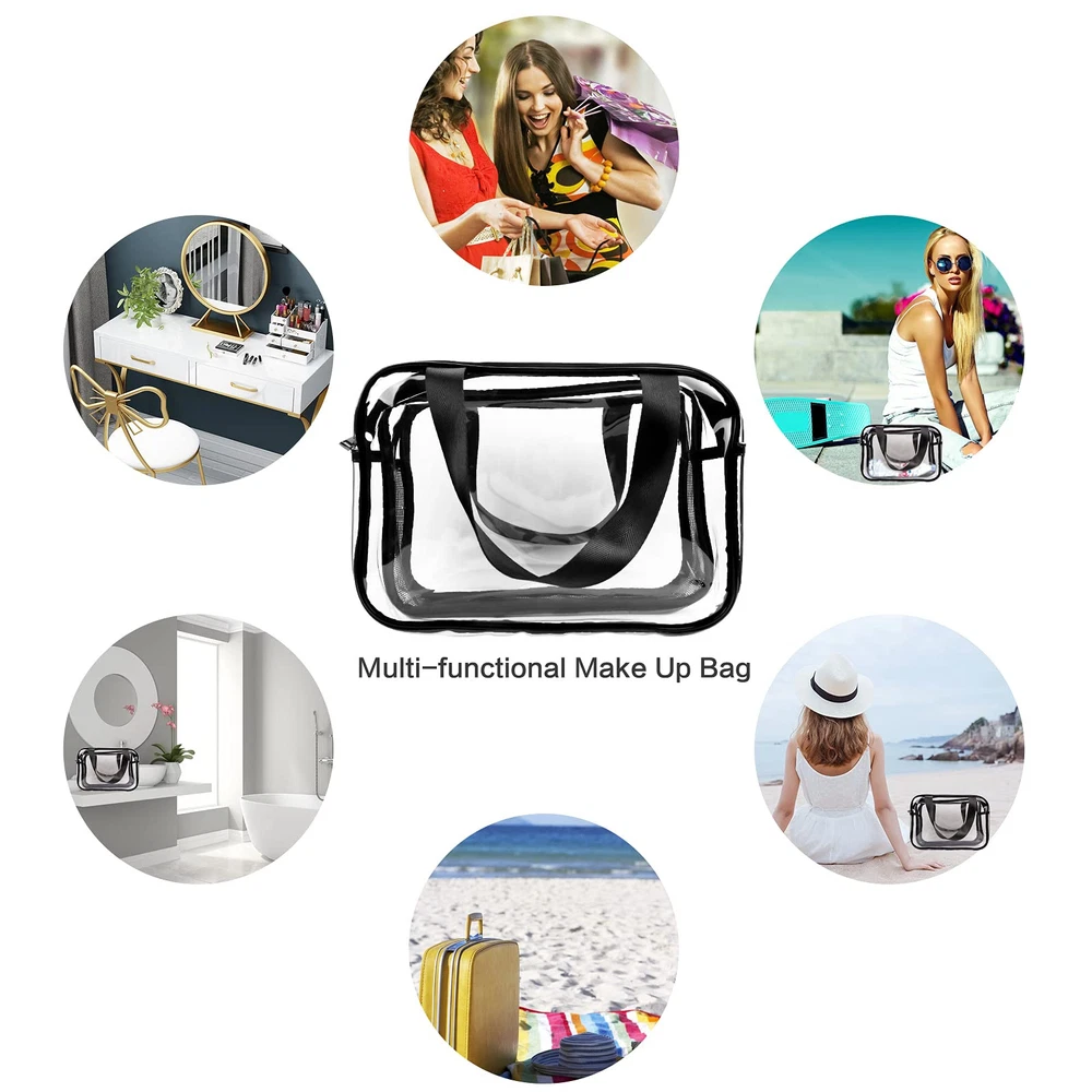 Large Capacity Travel Bag -- This clear makeup pouch size: 12.6"x 6" x 8.7", has spacious space for vacation toiletries as shampoo, toothpaste, toothbrushes, shaving accessories, towels, etc. Suitable for your family trip to pack all men, women and kids toiletries.(Please allow 0.5 inches for manual measurement.) Segment Wet and Dry Stuff -- This cosmetic travel bag is designed with two compartments. One is waterproof to hold all your items included liquids, at least resistant to leaks in case one of your bottles spills. The other is drained to store wet stuff, like wet towels. Meet your different needs. Premium Material -- This clear makeup bag is made of improved 0.5mm thickened Eco-Friendly transparent PVC material,which is more durable, softer and reusable and make you find items easier. The top sturdy zipper closure with double zipper pulls keeps all your belongings safe. Fashion Tote Bag Design -- Designed with sturdy smooth zipper, this travel bag is very easy to open and close, make your things safe. Handle strap design reduces the pressure of hand-held, more convenience to use. The clear PVC material allows you to easily view items and get what you want quickly. An ideal makeup toiletry bag for traveling. Versatile and Multifunctional Bag-- You can use this clear toiletry travel bag as cosmetics bag, travel bag, make up bag, gym bag, storage bag, waterproof bag, gift bag, swim bag, general packaging. Great for traveling, outdoor, business trip, camping, travel, gym room.