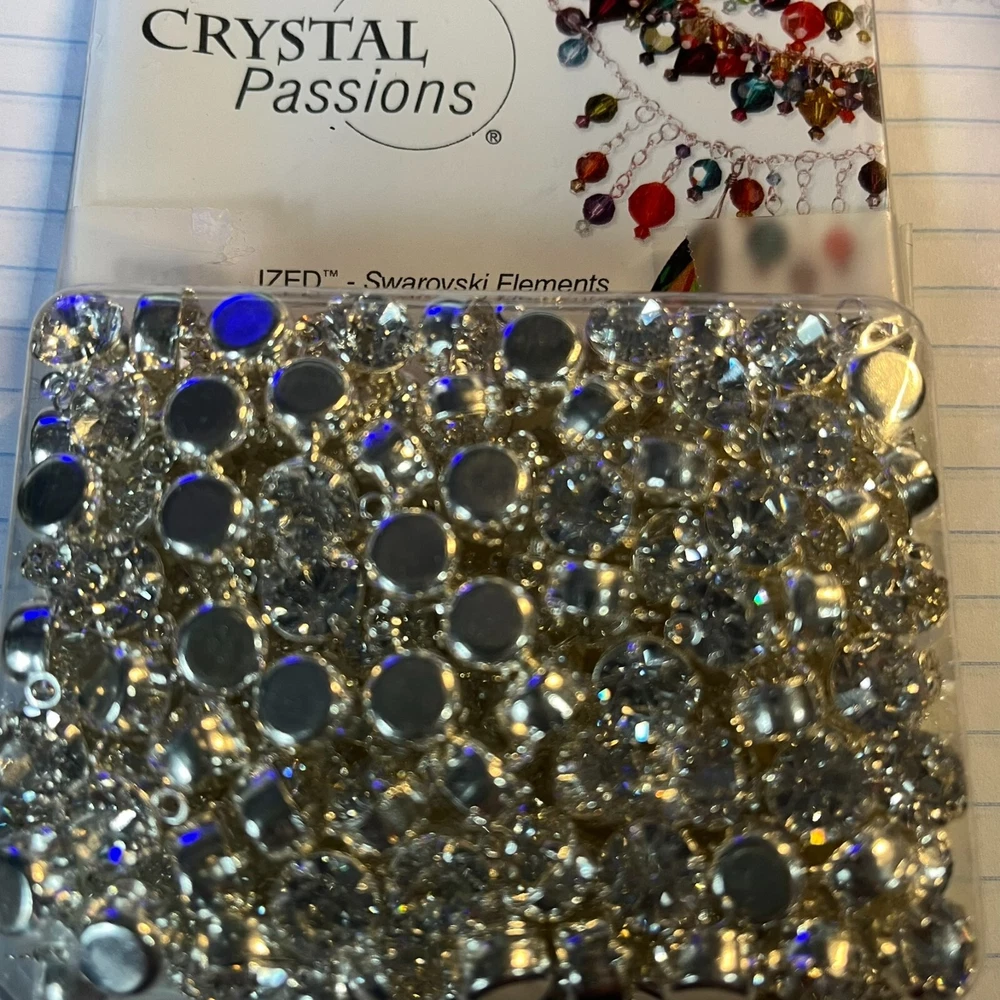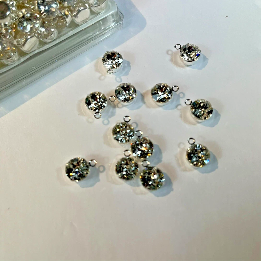 These are so rare and hard to find anymore! These high quality Swarovski Rhinestone Crystal charms Pendant are stunning! The crystals are foiled and clear in color. The settings are raw brass that have been silver plated. Perfect for earrings or charms, these have 1 loop. The crystals are 8mm. Very low price. 1 pack 144 pieces available. Hurry, before they are gone!