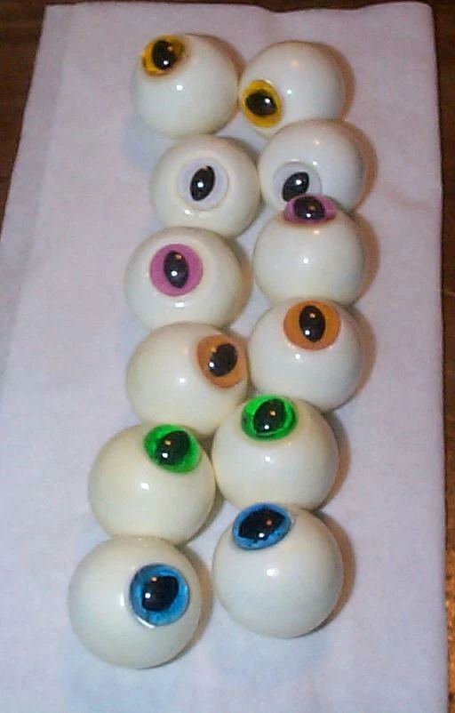 Clearance Sale - 12 White Floatable Eyeballs - Cat Eyes - Halloween Pack - - New/Old Stock Get them while you can. The Haunting season is almost here!!! These eyeballs are discounted due to the fact that they were stored for too long and forgotten. Since these are are old stock even though they have never been used, they are no longer what I consider to be perfect. You may find that the actual white color of the balls has discolored, the balls or the glaze has cracked. Some imperfection that I rejected these from my normal selling. But the time has come to offer to those that want to do something different for Halloween and want something special, even if not 100% perfect. You won't find eyeballs like these on the market, I am the only seller that has, makes and sells. This is your one chance (maybe only) to get them at a cheaper, discounted price. There is a twist to this listing. As you can see in the additional pictures there are a number of different colored CAT eyes. You will receive 6 cat eyes and 6 of the other colors. They will be mixed, so there is no set colors to each package. We are just mixing. No two packages will be the same. Here are some nice looking eyeballs to add to your Halloween spooks. You are bidding on 12 White Floatable eyeballs, two are blue, two are amber, two are clear, two are brown, two are yellow and two are solid black. These eyeballs are weighted inside the bottom of the wood ball so they will float eye up. I learned during my haunted house that even though they are sealed in glaze the ball will swell if you keep them in water 24 hours a day like I did so I recommend that you let them dry when you are not using them. Don't be fooled by cheap plastic imitations that wont last. I am the original designer and maker that has been offering these since 2001. Many prop makers that sell here on ebay use my eyes because quality matters. These eyeballs are 1 inch and they will fit into most skulls. While making up and running my own haunted house I discovered I could not find eyes that I really liked so I found a way to make them myself. These eyeballs are solid wood and sealed with a glaze to give them a wet look. They can be used in several different ways if you just use your imagination. Such as: in skulls or glued onto your skeleton or static props (as shown), in a jar, hanging from the ceiling, how about a plate full of eyeballs and fingers! You could even pop them into a mask or dummy that is being displayed. Great for a toxic barrel or witches brew. The uses are endless for haunters. For storage reasons eyeballs are packaged with a light coat of baby powder. Please wipe or rinse prior to use. Here are a few comments from past buyers that bought the veined or solid white eyeballs: Great product Great price and made in the USA!! September, 2015 Absolutely perfect for my eyeball flowers! They look so realistic :) August, 2015 "Spooktacular Seller " Fast Shipping,Great Service!! THANKS Oct-30-05 Great eBayer! Smooth, Friendly Transaction! Thank You from VillageHaunt.com Great eyeballs! Exactly what we wanted! Xtra fast ship! A+++++++Great seller! Oct-30-05 07:46 Fast shipping!!! Awesome eyeballs!!!! Can't wait to use them this Halloween!!! Oct-20-05 13:31 These eyes are GREAT! Already a hit at the party! AAA+++ Oct-17-05 Please view pictures. The pictures show the eyes balls before they were stored and not exactly as you will receive. I do combine shipping, depends on how many packages you purchase and how much total the weight is, I ship the best price for you I can. Payment by Paypal. Thanks for looking.