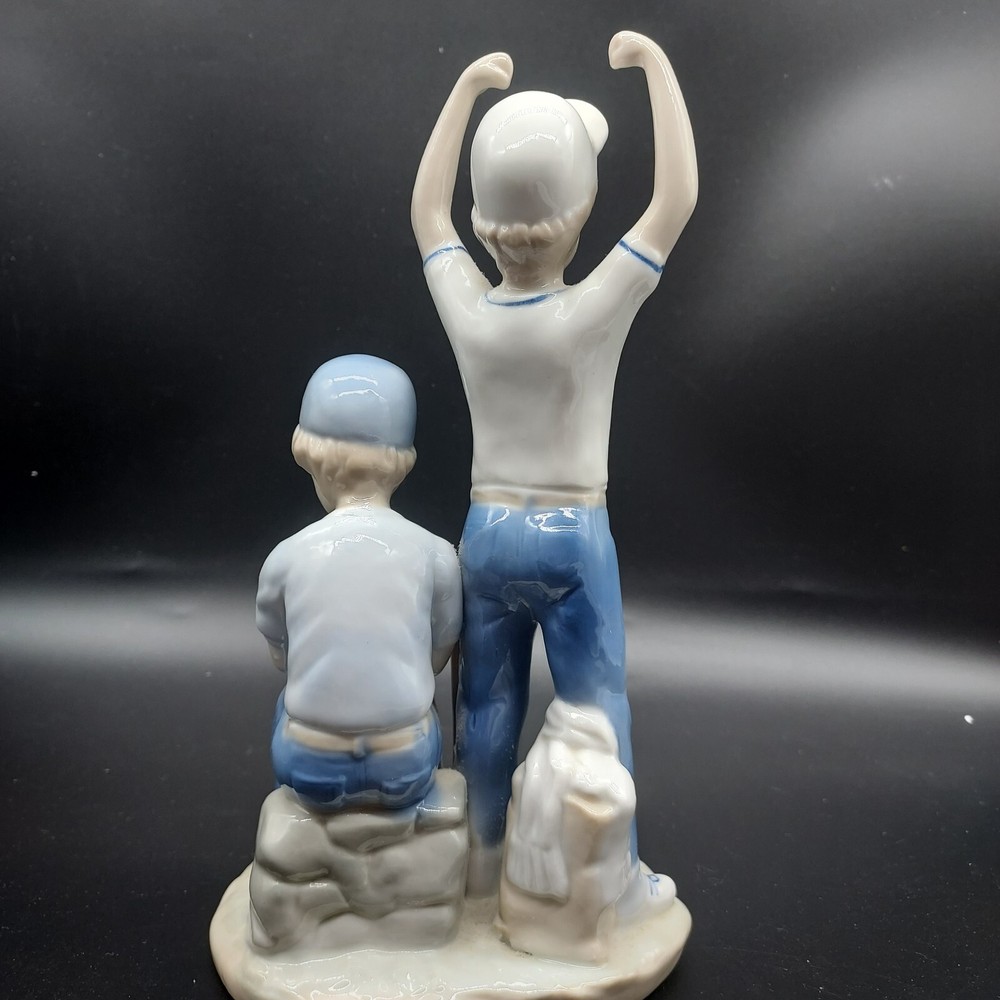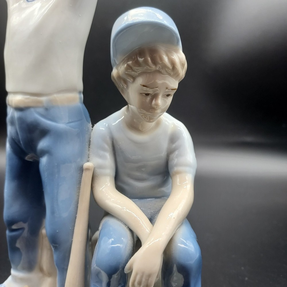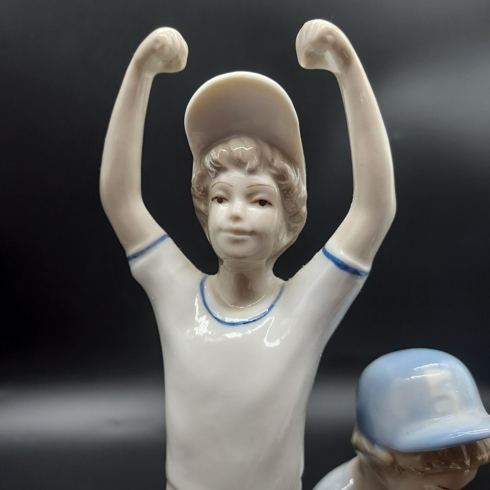 Add a touch of nostalgia to your home decor with this vintage 1989 Paul Sebastian porcelain figurine. The figurine depicts two baseball players going for a home run, adding a sporty touch to any room. At 9" tall, it can easily fit in any space and is perfect for all occasions. This high gloss figurine features a glossy finish and is crafted from high-quality porcelain. It is an original piece from the late 20th century and is perfect for collectors or sports enthusiasts. The white color and handmade design make it a unique and beautiful addition to your collection.