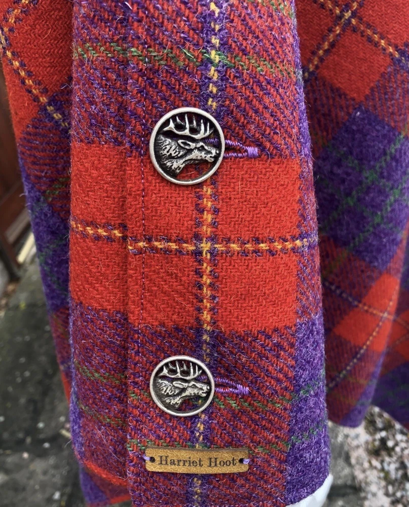 Clearance sale, cape reduced from £295 to £150. An amazing vibrant check Harris tweed has been combined with a lavish lining and finished with silver stag buttons to create this beautiful bespoke cape. Harriet hoot signature capes are elegantly stylish and perfectly balanced for a flattering fit. They wrap you in warmth and the water resistant properties of Harris tweed makes them ideal for all seasons. Expertly handmade in the Cotswolds, each one is unique and has been lovingly created for you to look amazing. Best suited to a UK size 10-16. Other adult and child sizes can be made to order. Dry clean only