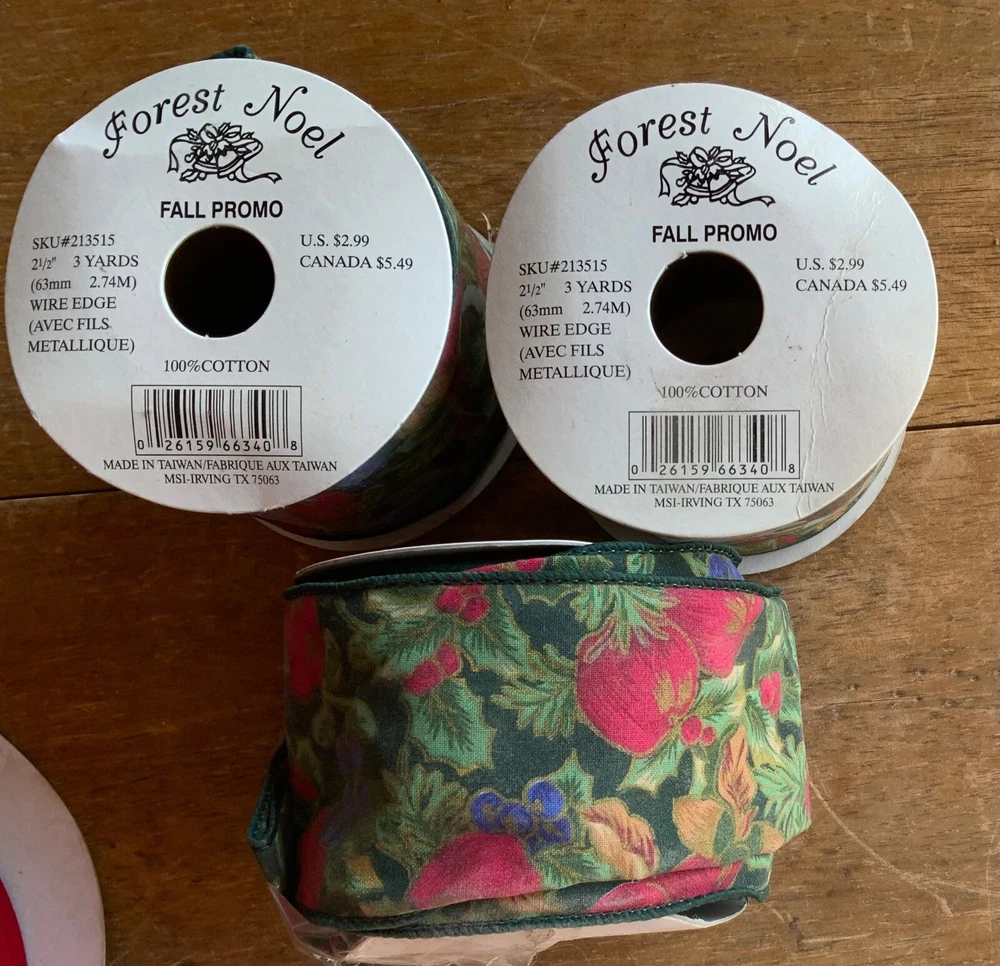 OK, we all have done this. Bought these ribbons for use at Christmas only to never utilize them. Now, I am cleaning up the office and it is time for them to go. Red Velvet 2 1/2" wide, one sided, weather resistant. Great for large presents, Christmas wreaths, Garlands. Three spools of Forest Noel 2 3/8" Dark Green with Red Berries, wire edged ribbon. Spools are 3 yards long. Two are still sealed. One has been opened but not used. One spool of Red, Green, wire edged ribbon, 3 yards long, sealed. Total of FIVE spools, all slightly dusty from being on a shelf. (We call the dust Nevada Chrome). I hope some Crafty Crafter can use these lovely ribbons for projects for their fall shows! Ships Priority Mail.