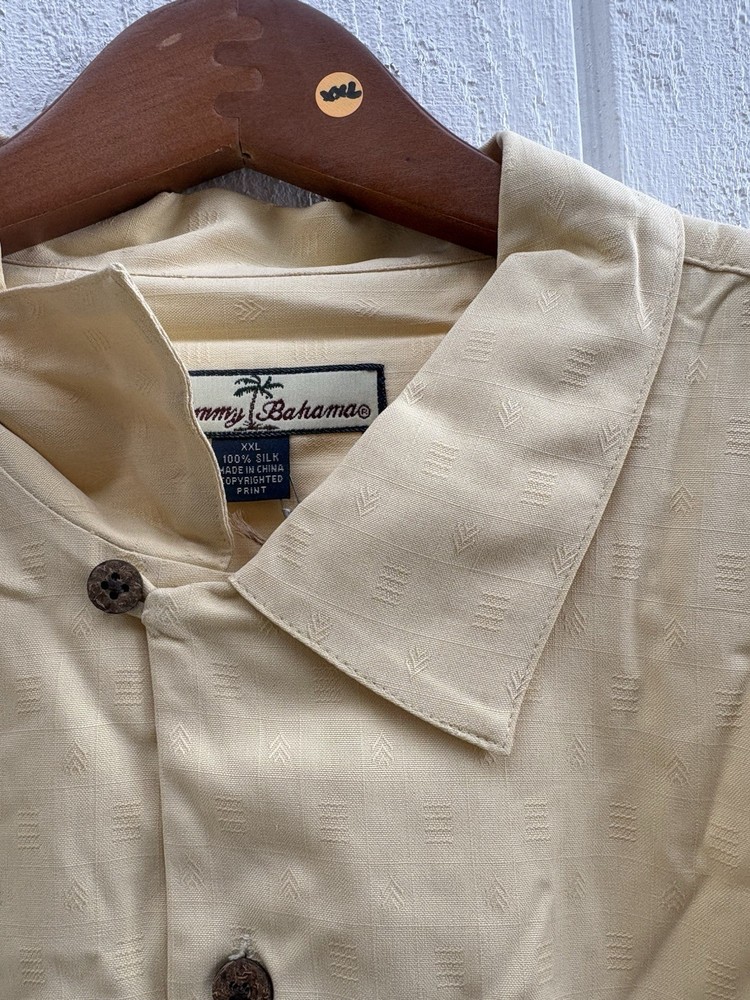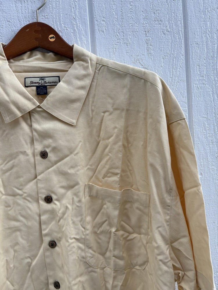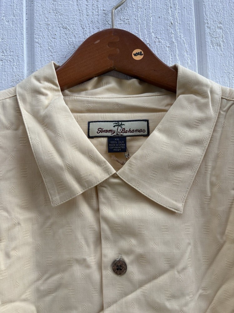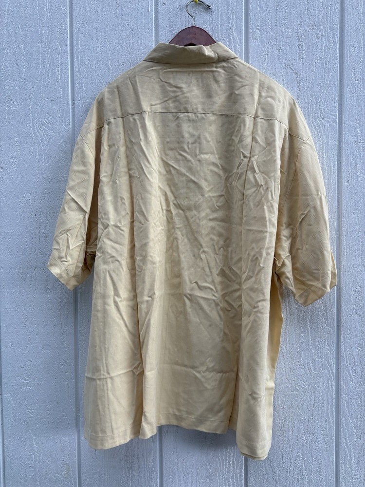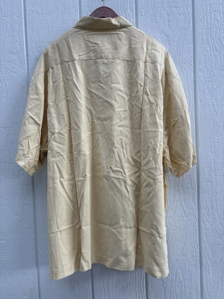 Brand: Tommy Bahama Material: Silk Personalize: No Fit: Regular Size Type: Regular Size: 2XL Closure: Button Occasion: Casual, Travel Handmade: No Vintage: No Type: Button-Up Accents: Button Color: Yellow Sleeve Length: Short Sleeve Neckline: Collared Garment Care: Machine Washable Season: Summer, Spring, Fall Fabric Type: Woven Pattern: Solid Department: Men