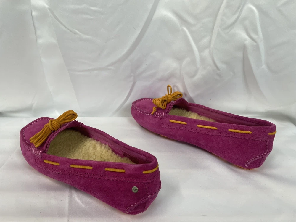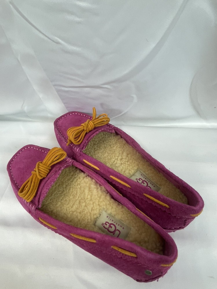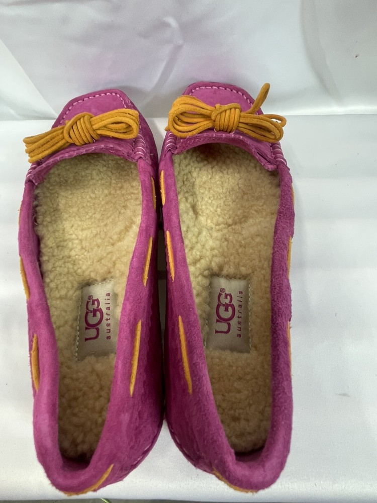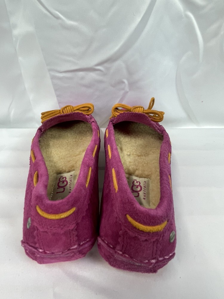 The UGG Australia Women's MEENA slipper in Pink, size 5.5, is a stylish and comfortable flat shoe perfect for the winter season. Made with high-quality leather and lined with cozy sheepskin, this slip-on style features a rubber outsole for added traction. The pink color adds a fun and feminine touch to any outfit, while the brand's reputation for quality ensures long-lasting wear. Ideal for women looking for a comfortable and fashionable option for colder weather. This item is part of our clearance sale to make room for new inventory. All items are in good condition and sold as is.