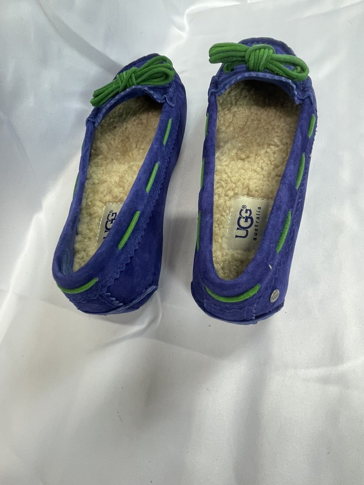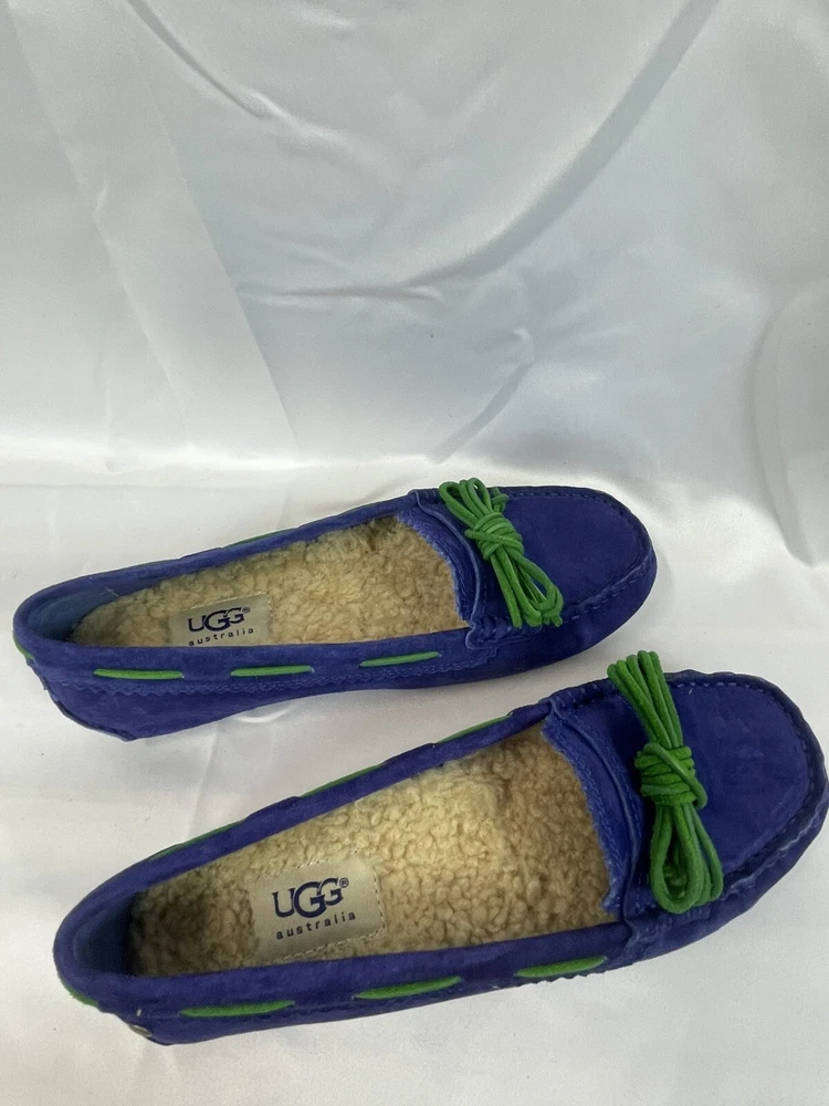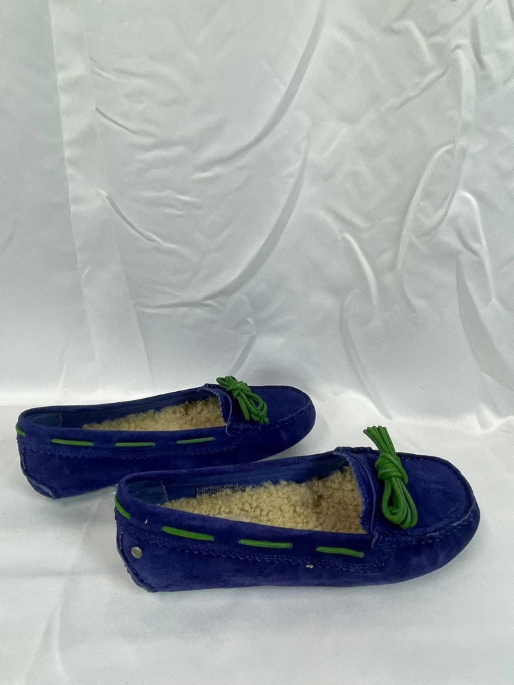 The UGG Australia Women's MEENA slipper in blue, size 5.5, is a stylish and comfortable option for the winter season. Made with sheepskin lining and a rubber outsole, these slip-on flats provide warmth and support. The leather upper material and insole ensure durability and added comfort, making them a practical choice for everyday wear. Perfect for women looking for a cozy and versatile shoe option. This item is part of our clearance sale to make room for new inventory. All items are in good condition and sold as is.