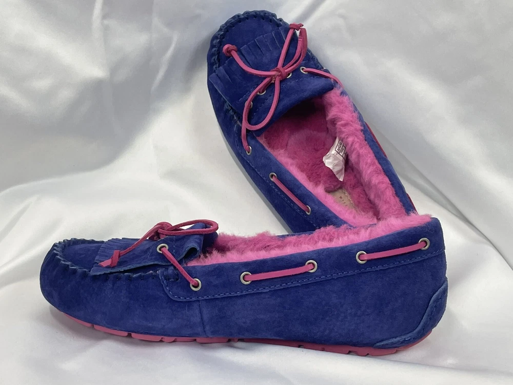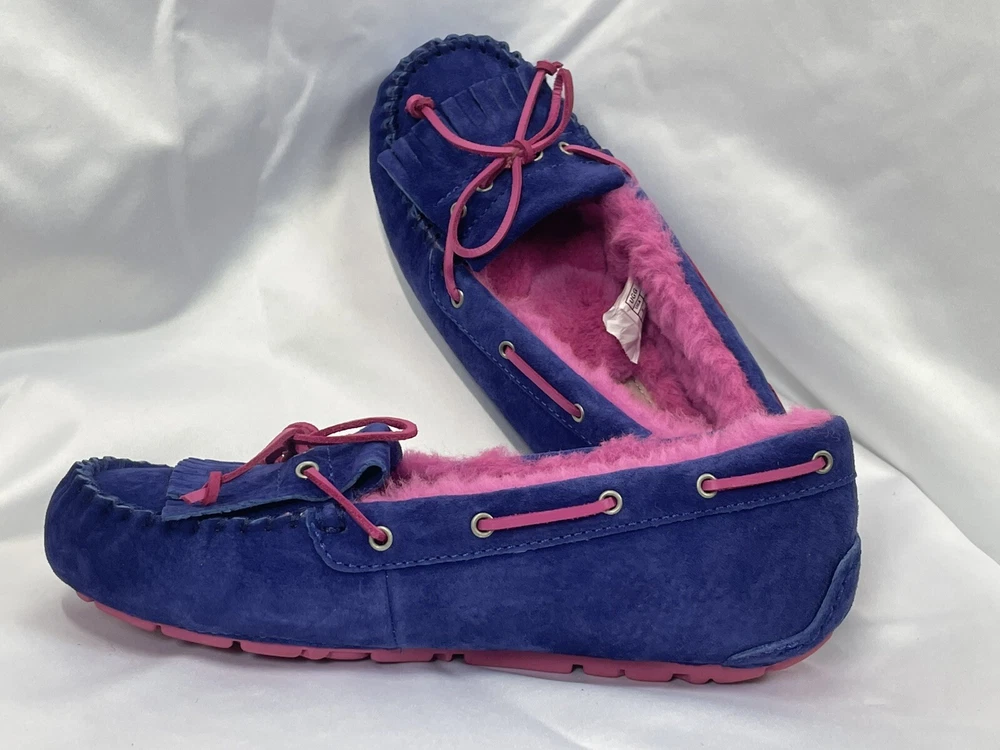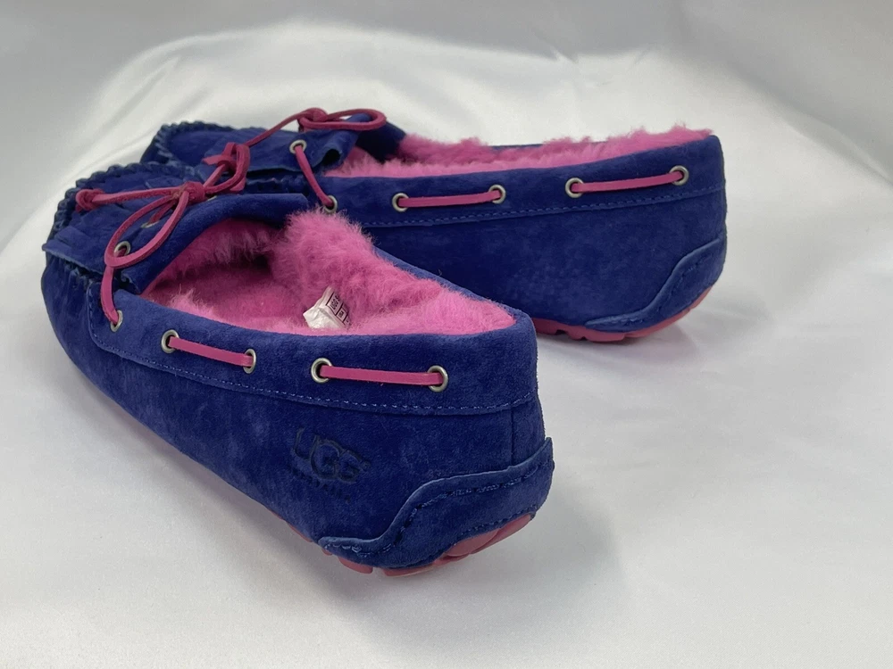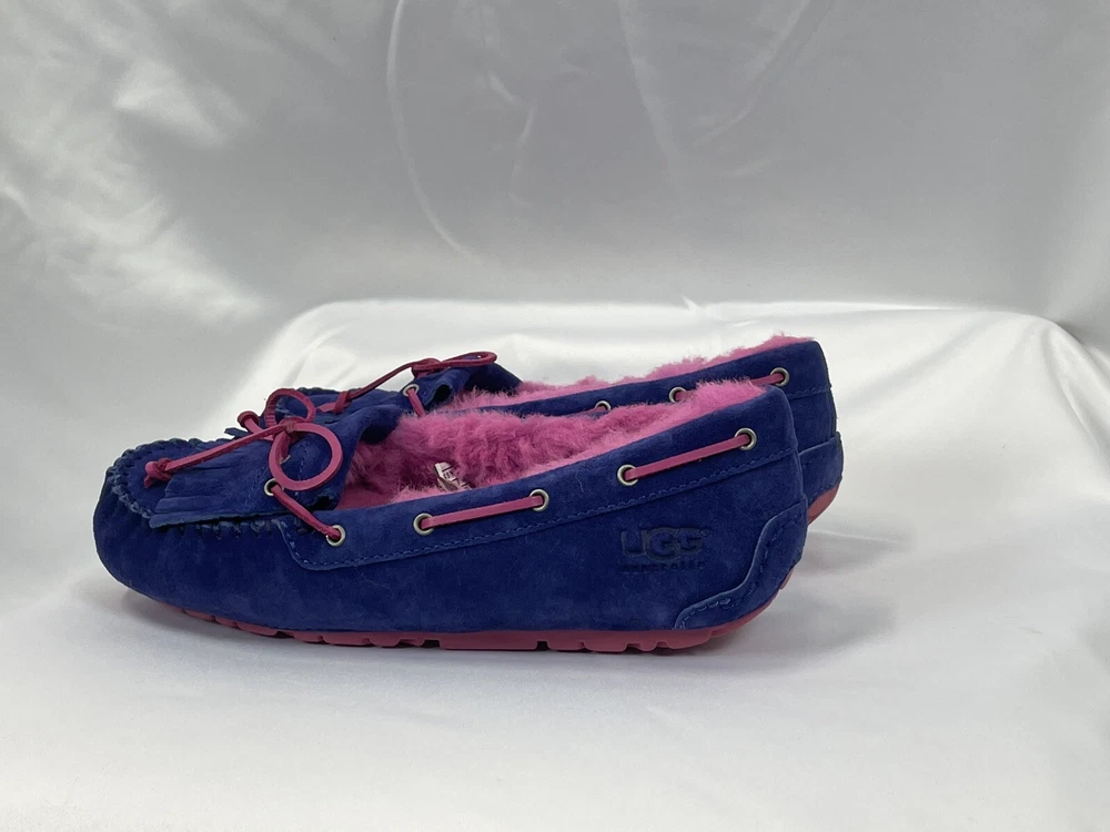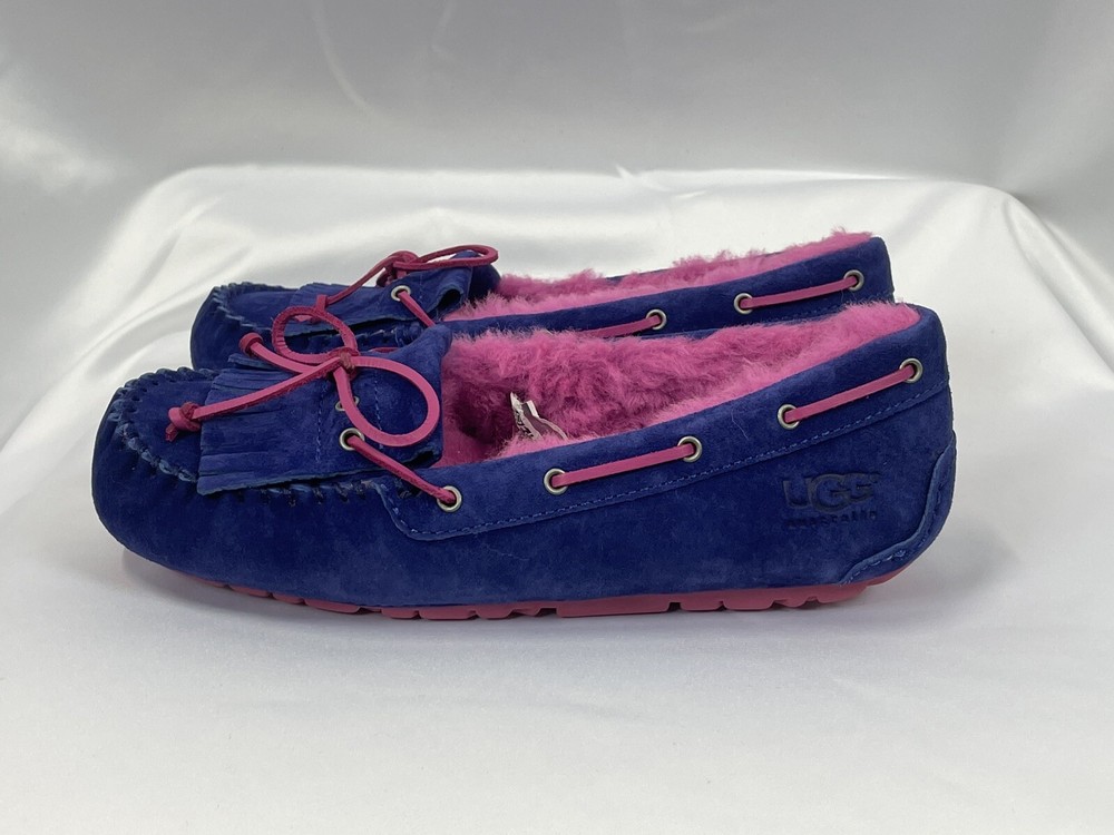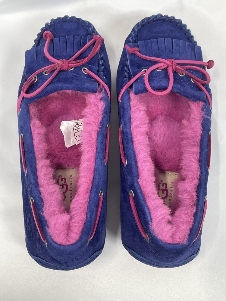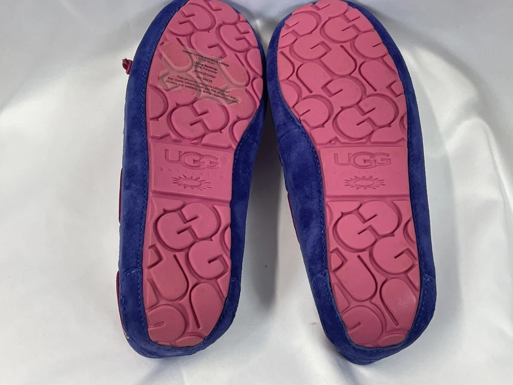 The UGG Australia slippers are stylish women's shoes made from 100% wool in a beautiful purple color. Featuring a slip-on style, these slippers are perfect for casual occasions and are designed with a wool lining for comfort. With a US shoe size of 5 and a UK shoe size of 3.5, these slippers are perfect for keeping your feet warm during the winter season. Made with a wool insole and a fur upper material, these UGG slippers are a combination of style and comfort, ideal for women looking for a cozy and fashionable footwear option. This item is part of our clearance sale to make room for new inventory. All items are in good condition and sold as is.
