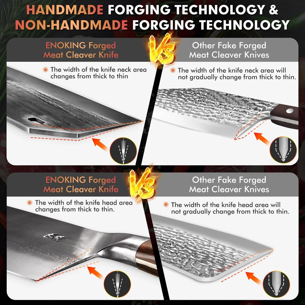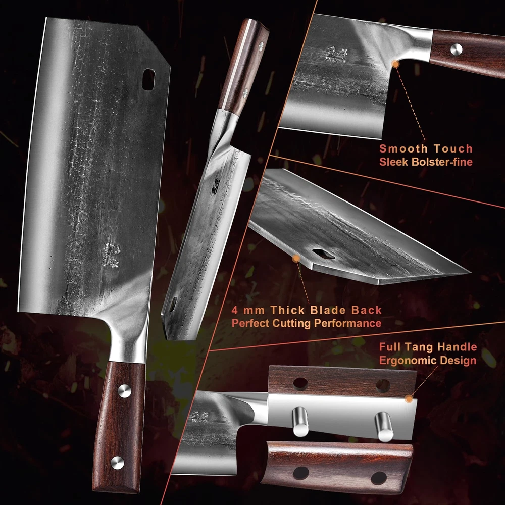 TRADITIONAL HAND FORGING TECHNIQUES - knife is hand forged by artisans with more than 40 years of experience. Compared with traditional kitchen knives, our cleavers can provide a longer service life. The whole process of forging knives goes through a series of continuous operation cycles like quenching, hammering, tempering, and clamping, which ensure the durability of the knives. This cleaver knife can re-sharpen multiple times without chipping. ANTI-RUST PROCESS & MULTI-PURPOSE - The upgraded Serbian chef knife adopts exclusive anti-rust process technology to solve the troubles caused by the rust of the knife. It can not only meet all kitchen daily needs such as slicing, dicing, mincing, chopping vegetables, chopping fruits, cleaving Meats, filleting fish, decomposing chicken, deboning and more, but also suitable for BBQ, hunting, hiking and camping. Whether indoors or out, it is definitely your practical assistant. PREMIUM STEEL & FULL TANG DESIGN - The meat cleaver is forged from high carbon steel which makes the blade ultra-solid. Ergonomically designed full tang wood handle and rivet design ensures comfort and maneuverability, effectively preventing handle breakage. It’s integrally formed, there is no need for welding and machine welding. The butcher knife is well-balanced to minimize numbness or pain in the palms and wrists, and no fatigue even after prolonged use! MAINTENANCE - Due to the high carbon content of forged knives, please keep the knife blade away from acidic, alkaline or corrosive substances and make sure to clean it regularly. After each use, be sure to rinse it with running water, then wipe off water stains with a cotton cloth. When not in use for a long time, you can apply cooking oil to the blade for added effect, and the meat knife in a dry place. This knife offers cutting performance with a little maintenance. AFTER-SALES SERVICE - Established many years ago, aims to provide premium kitchen knives with excellent sharpness, excellent balance and good practicality. Applying the principles of ergonomics and mechanical levers, we have greatly improved our customers' cutting experience. Our after-sales team provides you with a permanent after-sales service. You can us with any questions or doubts, we will reply to you within 24 hours and give you a satisfactory solution!