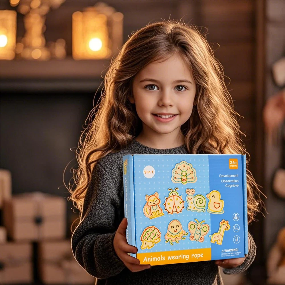 All-in-One Lacing Cards Set for Kids – Spark creativity and fine motor skills with our Montessori wooden lacing cards! This kids craft kit includes 9 adorable animal-shaped lacing cards, safety needles, colorful yarn, and 12 vibrant markers—everything needed for hours of arts and crafts for kids ages 4-8. Perfect for preschool learning activities, this set makes a fantastic travel toy and special education classroom must-have! Toddler-Friendly & Safe Materials – Crafted from smooth, durable wood, our Montessori toys for 3-year-olds and up are free from sharp edges and safe for small hands. The included toddler craft supplies—soft yarn and safety needles—ensure a frustration-free experience for little learners. Ideal for crafts for toddlers and preschool learning toys! Fun & Educational Fine Motor Skills Toy – Designed to improve fine motor skills for 3-5 4-8, our lacing cards help little hands develop hand-eye coordination, patience, and dexterity. Whether used as preschool games, learning toys for kids 3+, or manipulatives for preschoolers, this set turns playtime into a fun learning adventure! Perfect for Kids Crafts & Travel Activities – Whether at home, in the classroom, or on the go, this kids crafts 3-8 set is a great screen-free activity! Compact and lightweight, it makes an excellent travel activity for toddlers. Keep children engaged with lacing cards for kids ages, promoting sensory play and pre-K learning activities anytime, anywhere. Ideal Preschool Gift for Boys & Girls – Looking for the perfect educational toy for your kids? This toddler arts and crafts kit is a delightful birthday, holiday, or back-to-school gift. Encourage creativity and learning with this engaging preschool learning toy—perfect for toddler activities, crafts for kids ages 3-5, and learning resources for 3-year-olds! Product Description Cleboen 9-in-1 Montessori Sewing Kit for Kids Includes adorable wooden animal lacing cards —fox, peacock, ladybug, and more! Designed to improve fine motor skills, cognitive development, and hand-eye coordination , making it an ideal STEM toy for toddlers. Safe, durable, and endlessly fun! Perfectly Sized for Little Hands! Each wooden lacing board is designed for easy handling and safe stitching . The kit includes colorful embroidery floss, plastic needles, and markers , ensuring a fun, engaging, and mess-free crafting experience for kids aged 3+ years . Learn Through Play – A Fun & Educational Sewing Kit! This DIY threading toy helps kids develop fine motor skills, color recognition, patience, and hand-eye coordination . Perfect for Montessori learning , it encourages independent play while fostering creativity and problem-solving skills . A must-have for early childhood development! Fun Family Bonding Time This interactive sewing toy is perfect for parent-child activities , making learning fun while strengthening bonds. Watch your child develop focus, patience, and creativity as they stitch adorable animal patterns . A great way to enjoy screen-free playtime together! Perfect Holiday & Birthday Gift for Kids Looking for the best educational toy for your little one? This Montessori-inspired wooden sewing kit is an excellent choice! Ideal for Christmas, birthdays, and special occasions , it sparks creativity while enhancing fine motor skills and hand-eye coordination . Give the gift of fun and learning today!