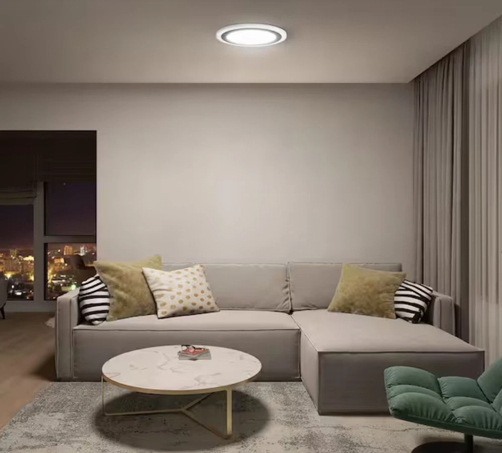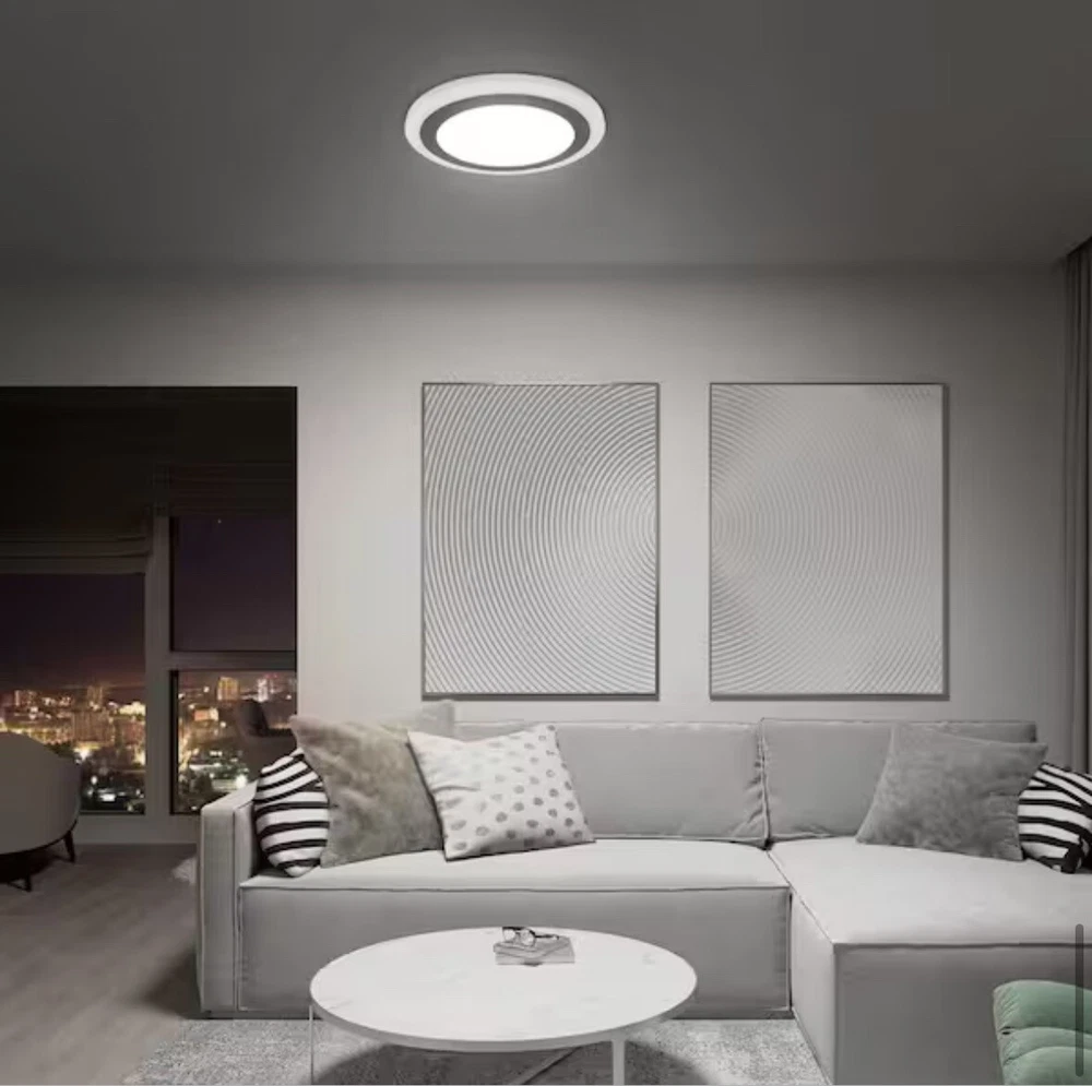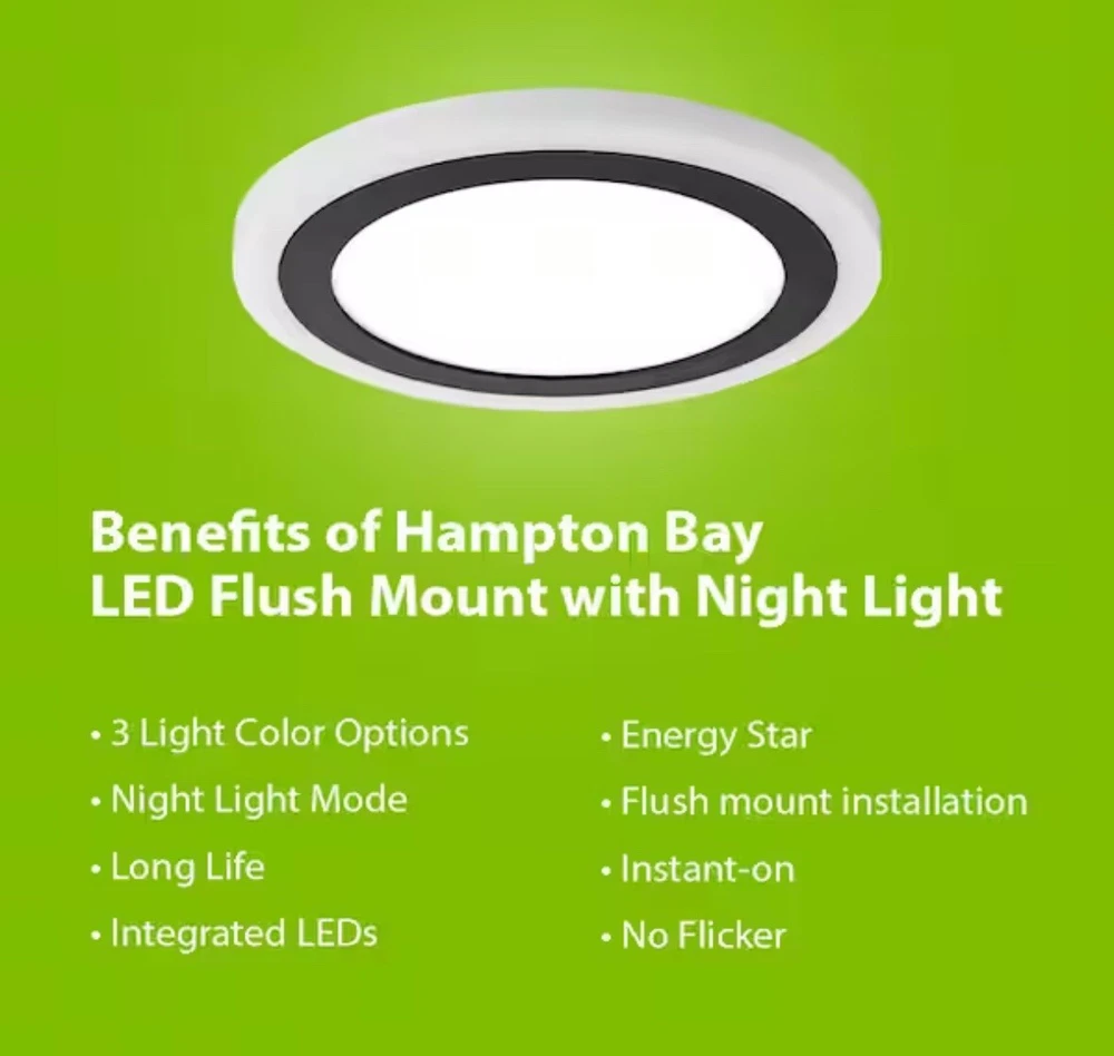 About This Product Add function and beauty to any residential or commercial area with this Hampton Bay FP13/3CCT/NL/HD 13 in. integrated LED round flat panel ceiling fixture. Use the switch on the back of the fixture to preselect the color temperature to meet your needs. You can select the color of the light, choosing between warm 3000K (soft white), clean crisp 4000K (bright white) or bright 5000K (daylight). After install, with a simple flip of a standard light switch you can easily toggle between your preselected light color and the amber night-light glow. An ultra-slim, edge-lit design with white polycarbonate lens and a decorative black ring to separate the daily light and night light. This energy-efficient fixture has long-lasting integrated LEDs, meaning no bulbs to replace, uses only 16-Watt of electricity and up to 79% less energy than a standard incandescent light bulb and produces even light distribution of 1300 Lumens. The streamlined design of these LED flat panels combined with an easy-to-install mounting bracket enables simple installation in both residential and commercial buildings. This easy to install light fixture has an average life of 50,000-hours/45.7-years, can be mounted as a ceiling flush mount and delivers ENERGY STAR approved dimmable lighting. Uses only 16-Watt Brightness: 1300 Lumens Flush mount ceiling installation Switch between regular light and night light modes after install Preset color temperature before install to soft white, cool white or-daylight Dimmable Instant on to full brightness Twist and lock simple mounting bracket ENERGY STAR listed Junction box compatible