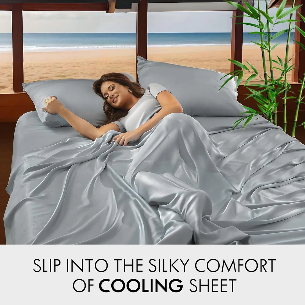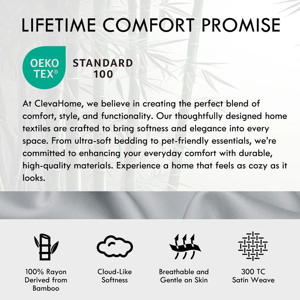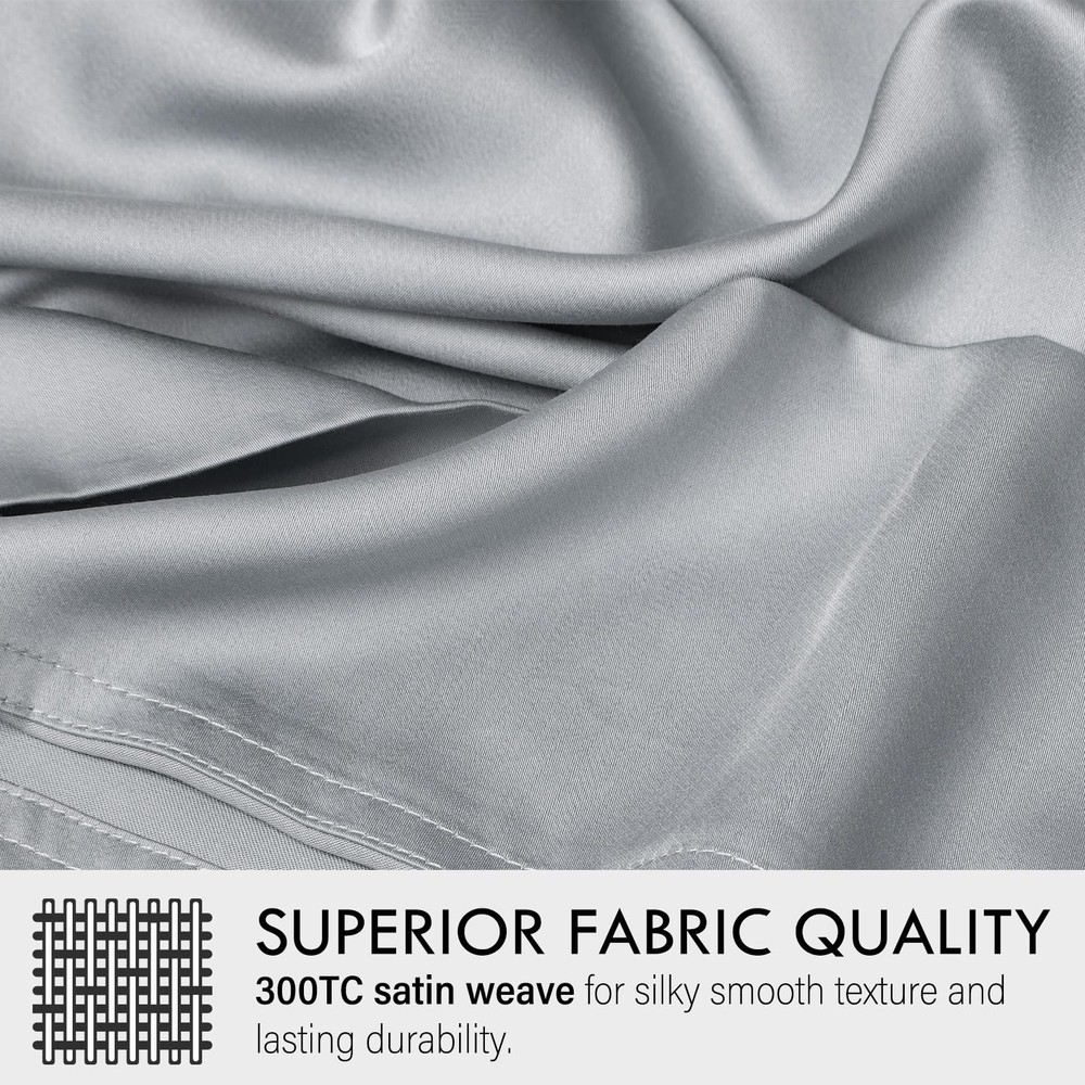 4 PIECE BED SHEET SET: Includes 2 Pillowcases, 1 Flat Sheet, and 1 Fitted Sheet. Flat Sheet (105" x 102"), Fitted Sheet (78" x 80"), Pillowcases (20" x 40"). Deep Pocket Sheet Set: Indulge in luxury with our elasticized deep-pocket sheet, fitting mattresses up to 16 inches thick. Its versatile size suits most beds, even smaller ones. Ultimate Coolness and Softness: Experience cool comfort with our bedding. It naturally regulates temperature, wicks away moisture, and offers ultimate softness. Perfect for hot sleepers and sensitive skin. Super Soft Sheets: Crafted from 300 TC satin fiber fabric, our bedding sheets are incredibly soft, smooth, and silky. 300 thread count is the optimal choice for pilling resistance as higher thread counts mean thinner and weaker fibers. Certified Safety: Our bed sheets are OEKO-TEX Standard 100 certified, ensuring bed sheets do not contain harmful chemicals. Recommended care includes cold washing, gentle cycle, and avoiding bleach or fabric softener. Tumble dry on low heat and remove immediately to avoid wrinkles. Use a warm iron if needed.