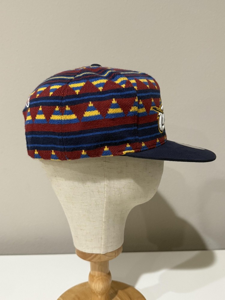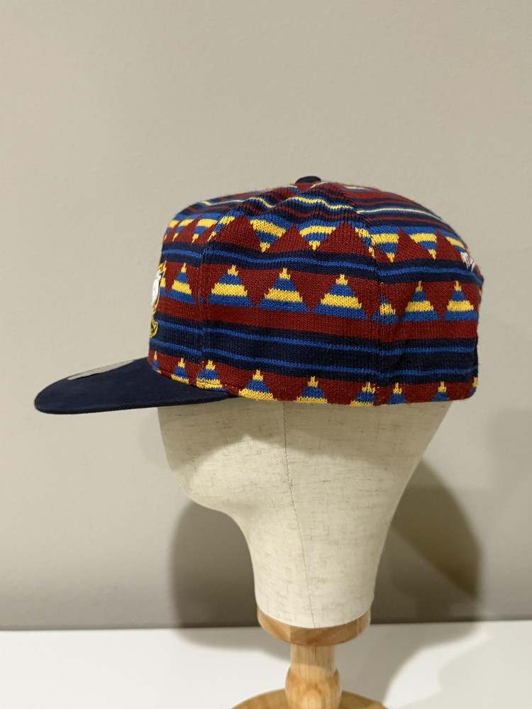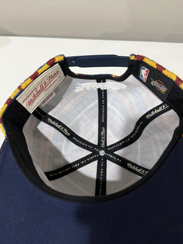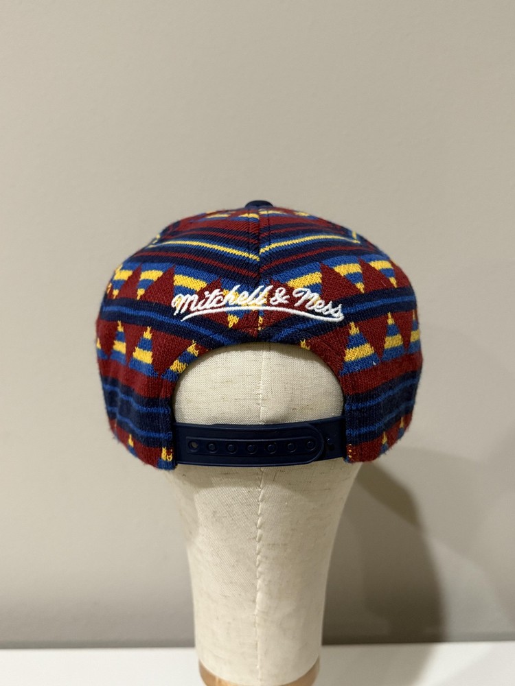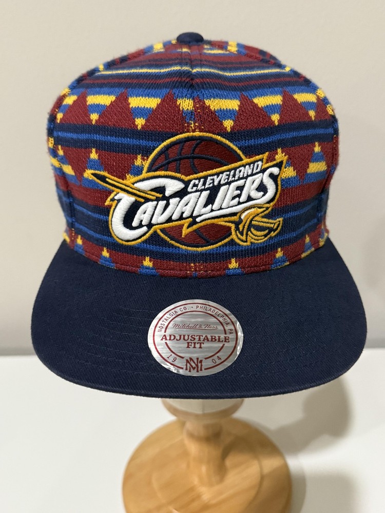 Cleveland Cavaliers Hat Cap Snap Back NBA Basketball Mens Blue Red Yellow 90s Condition: Excellent, gently worn with no visible flaws. No stains, holes, or discoloration noted. Distinctive Cleveland Cavaliers front embroidery with basketball motif on a geometric patterned knitted crown in red, blue, and yellow. Visor and adjustable snapback strap in navy blue. Mitchell & Ness Nostalgia Co. branding stitched on rear and interior taping. NBA and Cavaliers logos on inside tape, along with manufacturing label and style information. Made in Bangladesh. Adjustable snap back closure for custom fit. /men's sizing. Sticker label is still on the brim. Style code: 51119080, Date: 10/15 (as shown on tag). Material tag not shown, feels like standard acrylic/cotton blend commonly used in Mitchell & Ness fan caps. Great for NBA basketball fans, Cavaliers collectibles, or retro 90s streetwear style.