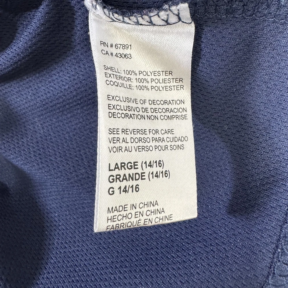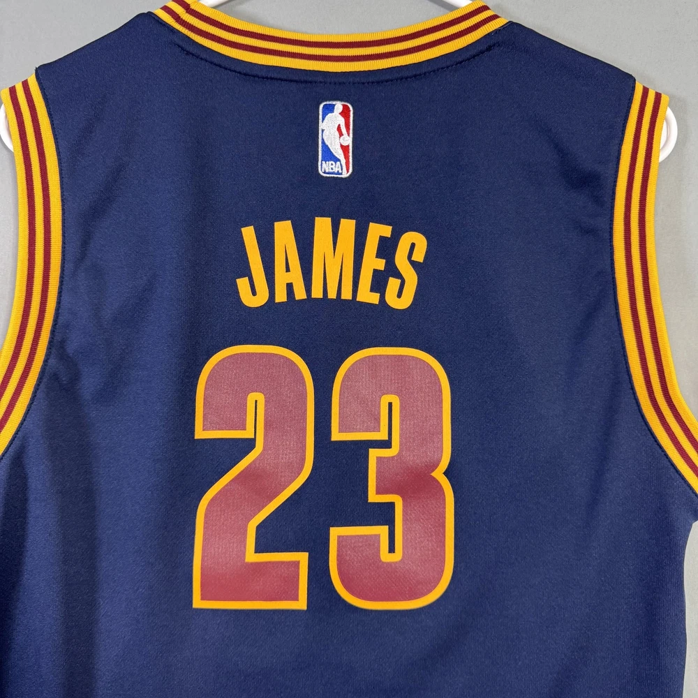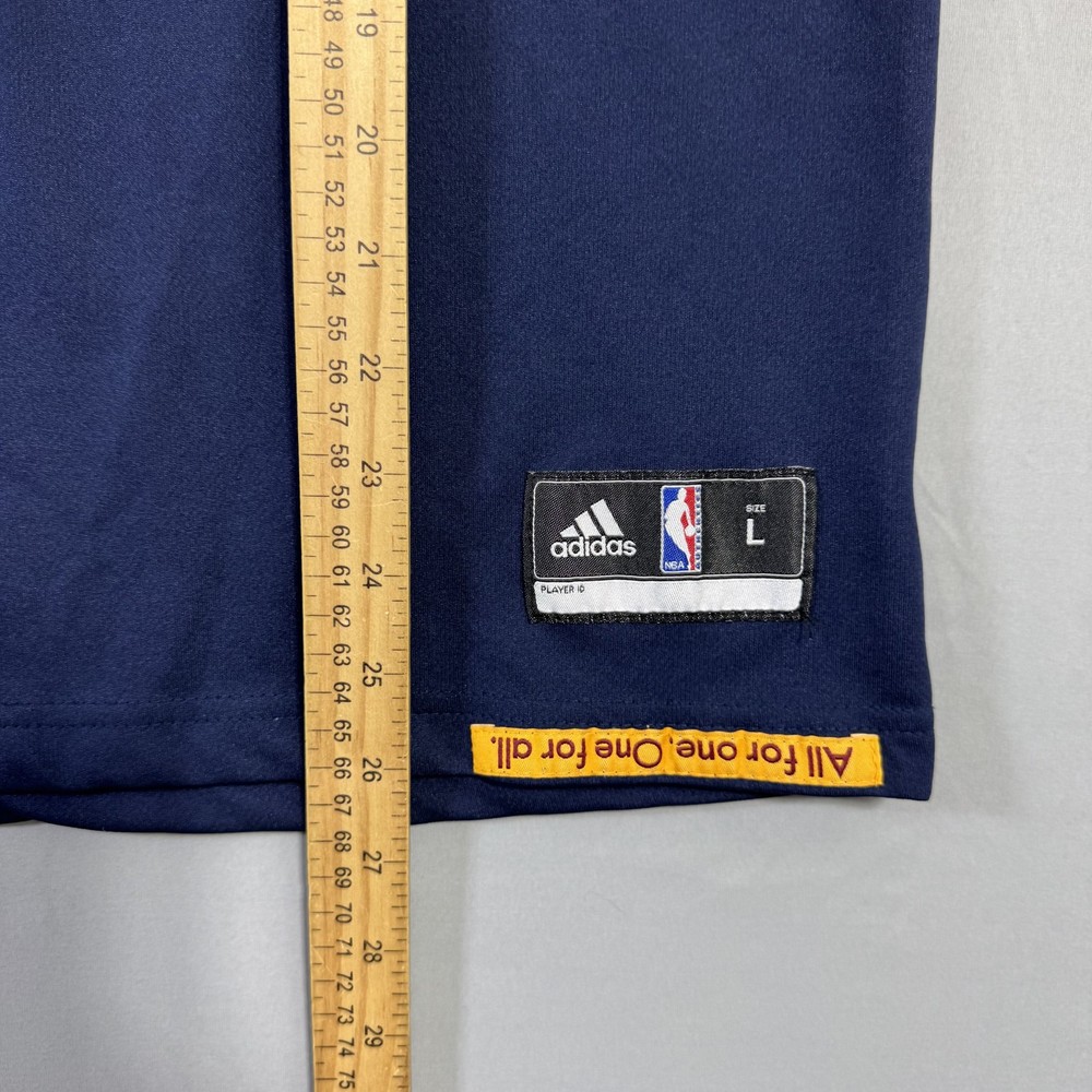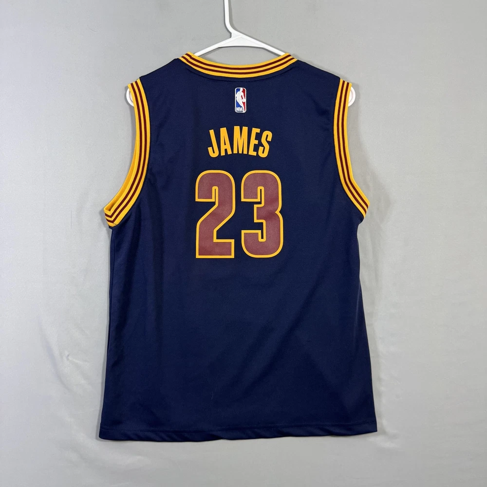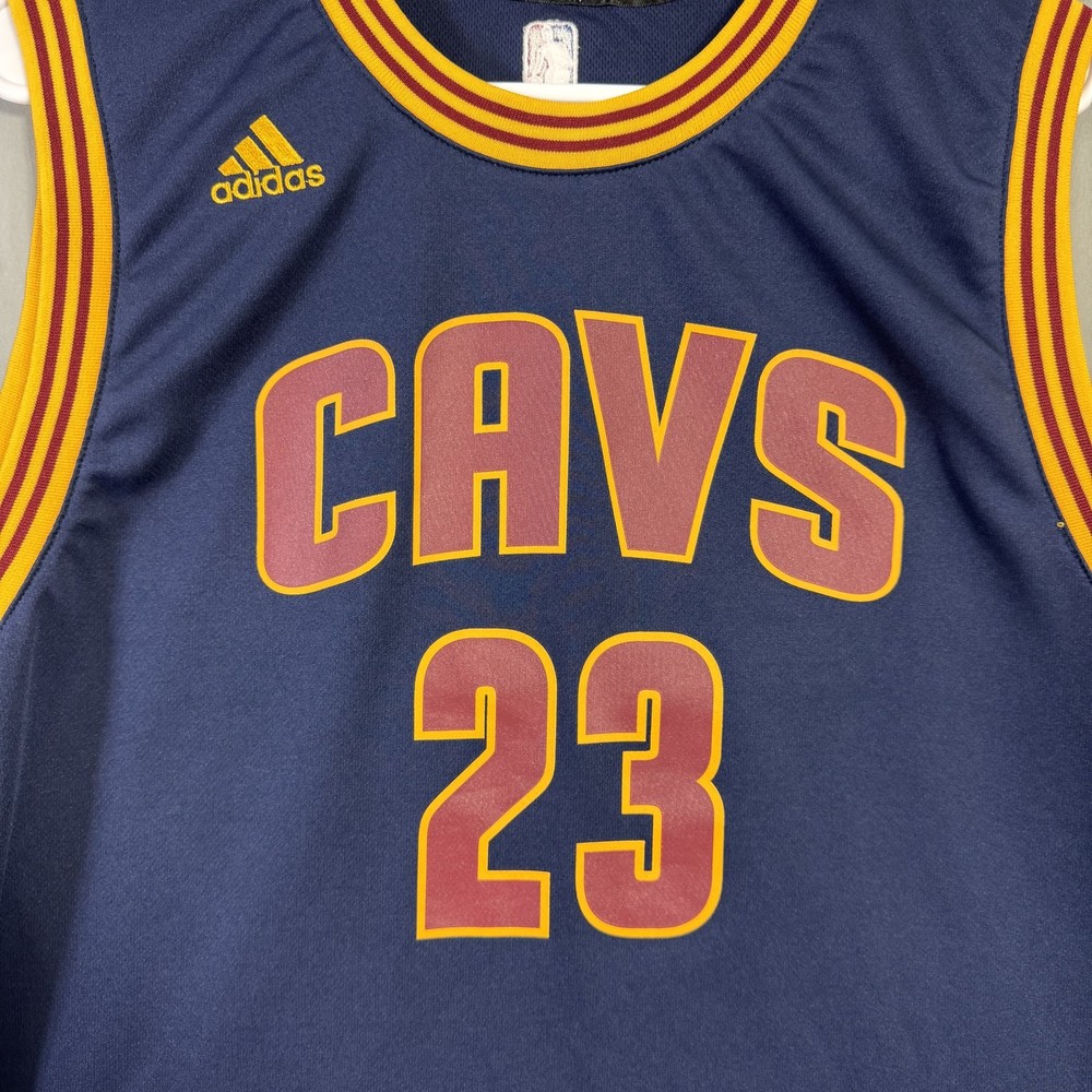 Cleveland Cavaliers Jersey Mens Large Blue NBA Basketball LeBron James 23 Adidas Condition: Gently worn, no visible flaws. Graphics and colors are vibrant, all stitching intact. Material: 100% polyester shell and exterior Features Cavaliers team name and number 23 on front, "JAMES" with number 23 on back Official NBA and Adidas branding at collar and lower front, including the Adidas logo and NBA logo tags Size tag reads Large (14/16) Mens. Please verify measurements for best fit. Main color is navy blue with gold and wine red striping on collar and arms Care instructions included on tag inside the jersey Made in China Classic LeBron James Cavaliers jersey perfect for collectors or fans