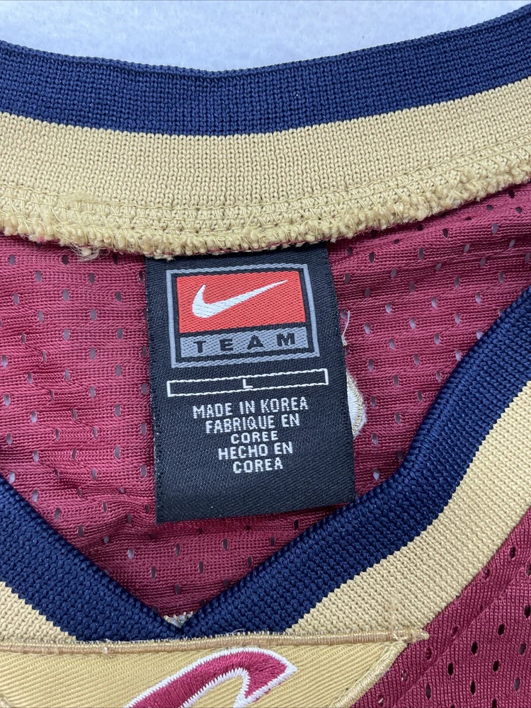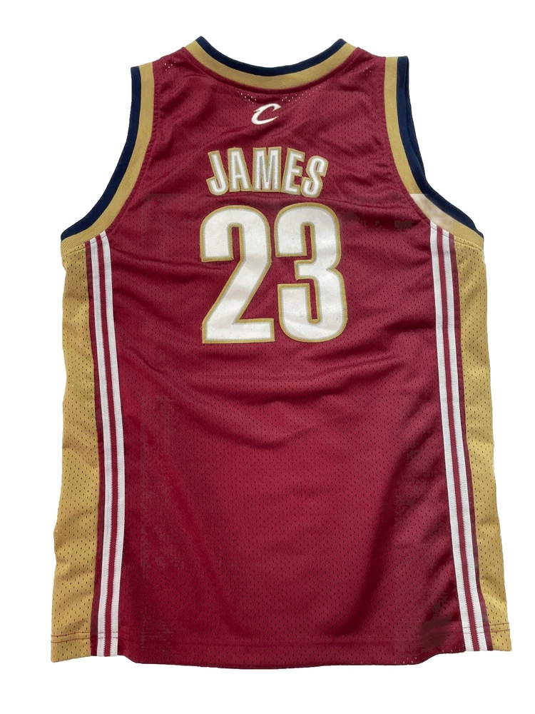 The product is a red Nike sewn jersey of LeBron James, with the number 23, officially licensed by the National Basketball Association (NBA), in size Youth Large. It represents the Cleveland Cavaliers team and is suitable for basketball fans. The jersey is designed for youth and was manufactured in Korea, Republic of.