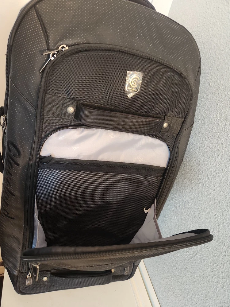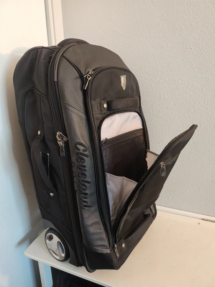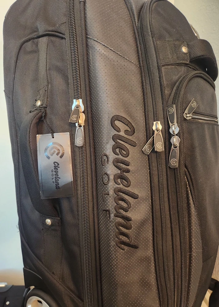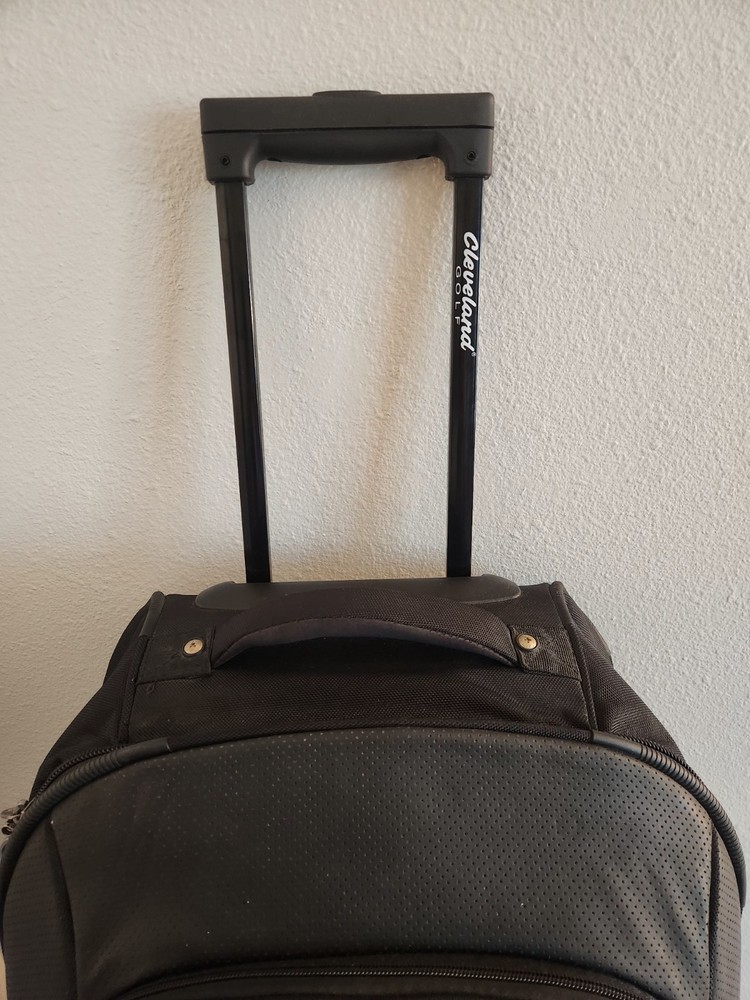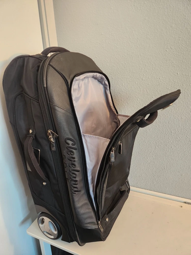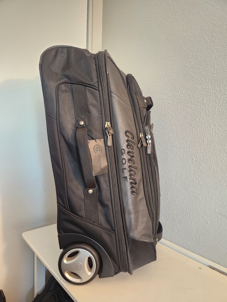 Rare Cleveland Golf Wheeled Suitcase Luggage Bag 29". Ballistic Nylon and leather. New with tags. New with defects. The bag has scratches on the back side from being in storage, see pictures. It was never used. All zippers function properly. No rips or tears. The handle extends and collapses smoothly. Very clean interior. Approximately 29" high 16" wide 12" deep