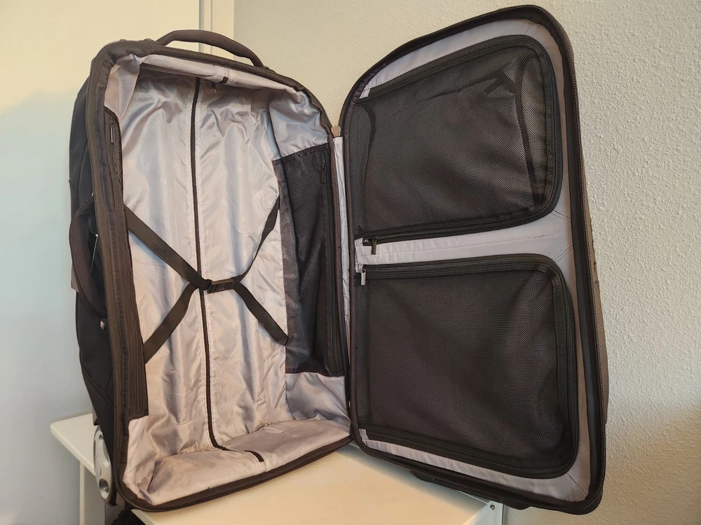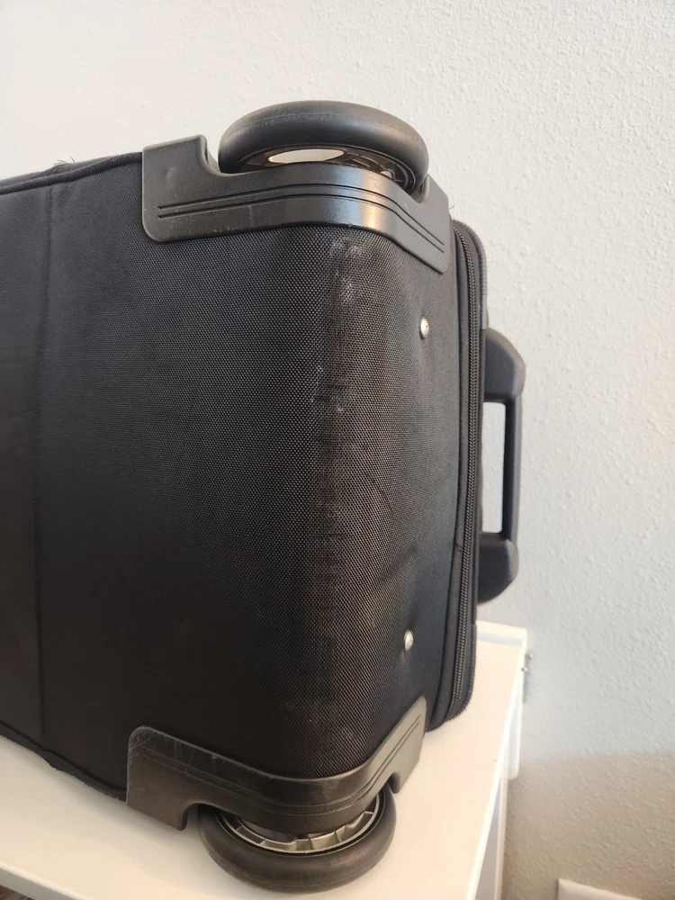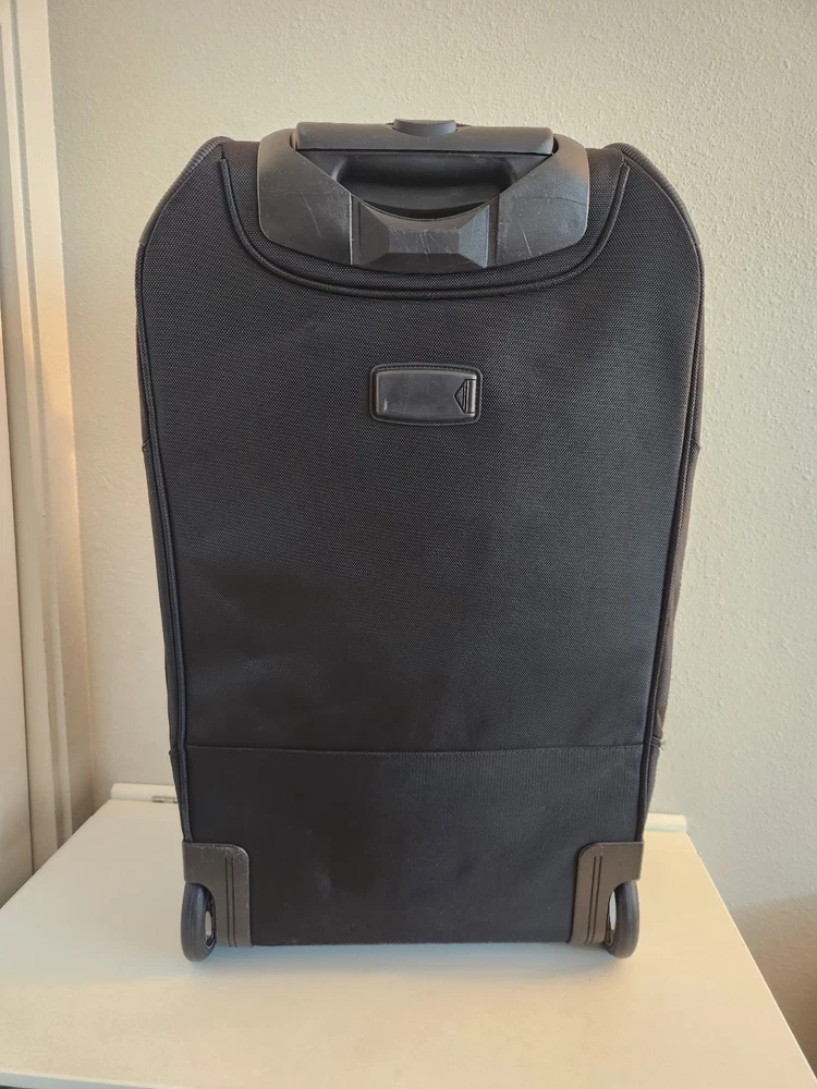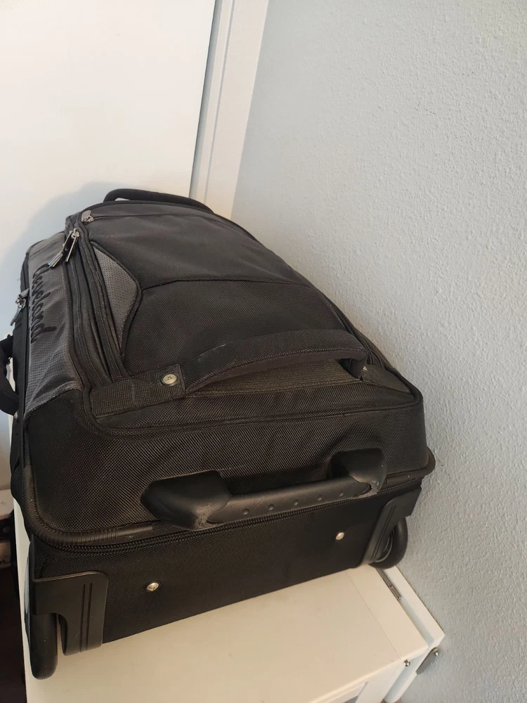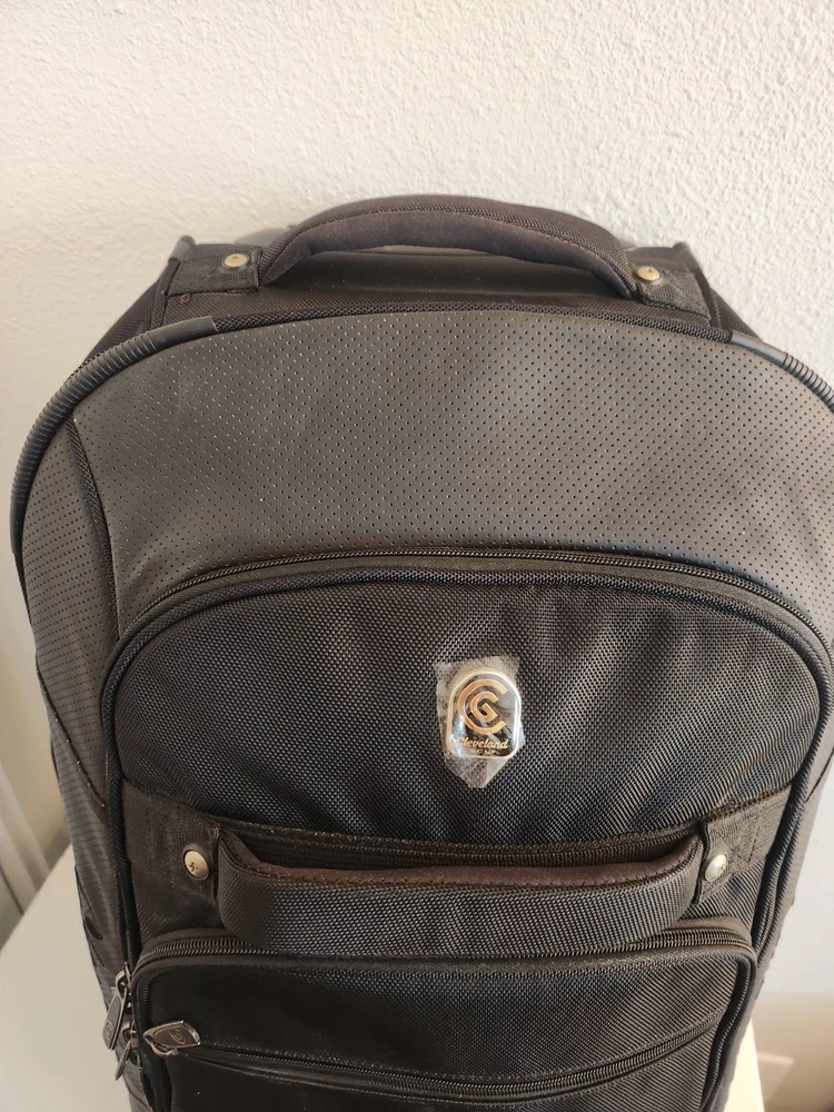 Rare Cleveland Golf Wheeled Suitcase Luggage Bag 29". Ballistic Nylon and leather. New with tags. New with defects. The bag has scratches on the back side from being in storage, see pictures. It was never used. All zippers function properly. No rips or tears. The handle extends and collapses smoothly. Very clean interior. Approximately 29" high 16" wide 12" deep