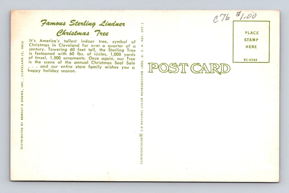 Cleveland OH- Ohio, Famous Sterling Lindner Christmas Tree, Vintage Postcard